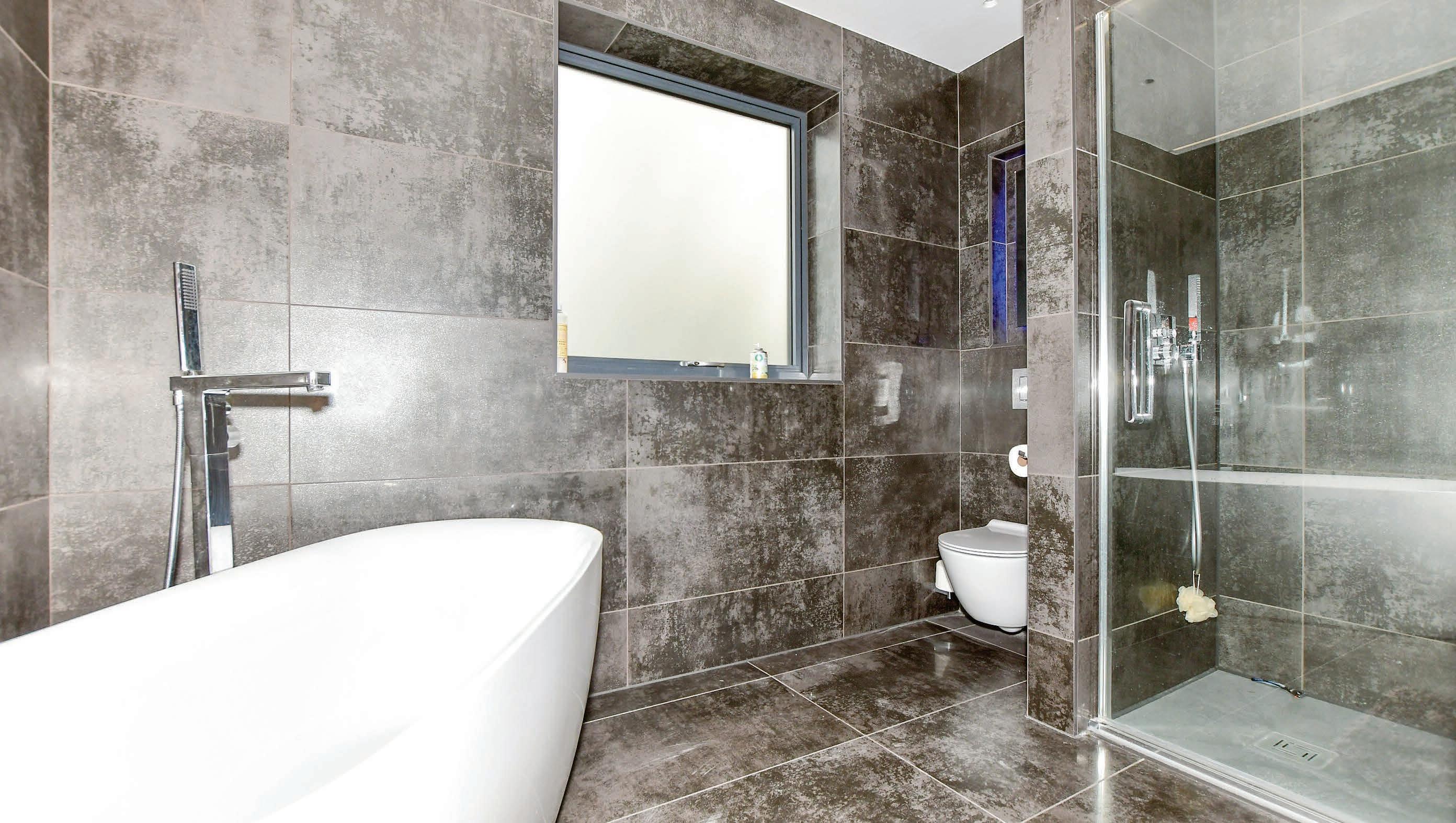 Going through the door to the top floor there is a walk in wardrobe with a wall of fitted cupboards and stairs that lead up to a stunning dual aspect main suite with bi-fold doors to a balcony where you can enjoy views across to the cathedral. There is also a superb dressing room with black glossy wardrobes, cupboards and dressing table as well as an impressive en suite bathroom with white porcelain tiles that includes a stand alone slipper bath, a triple shower and ‘his and hers’ basins.