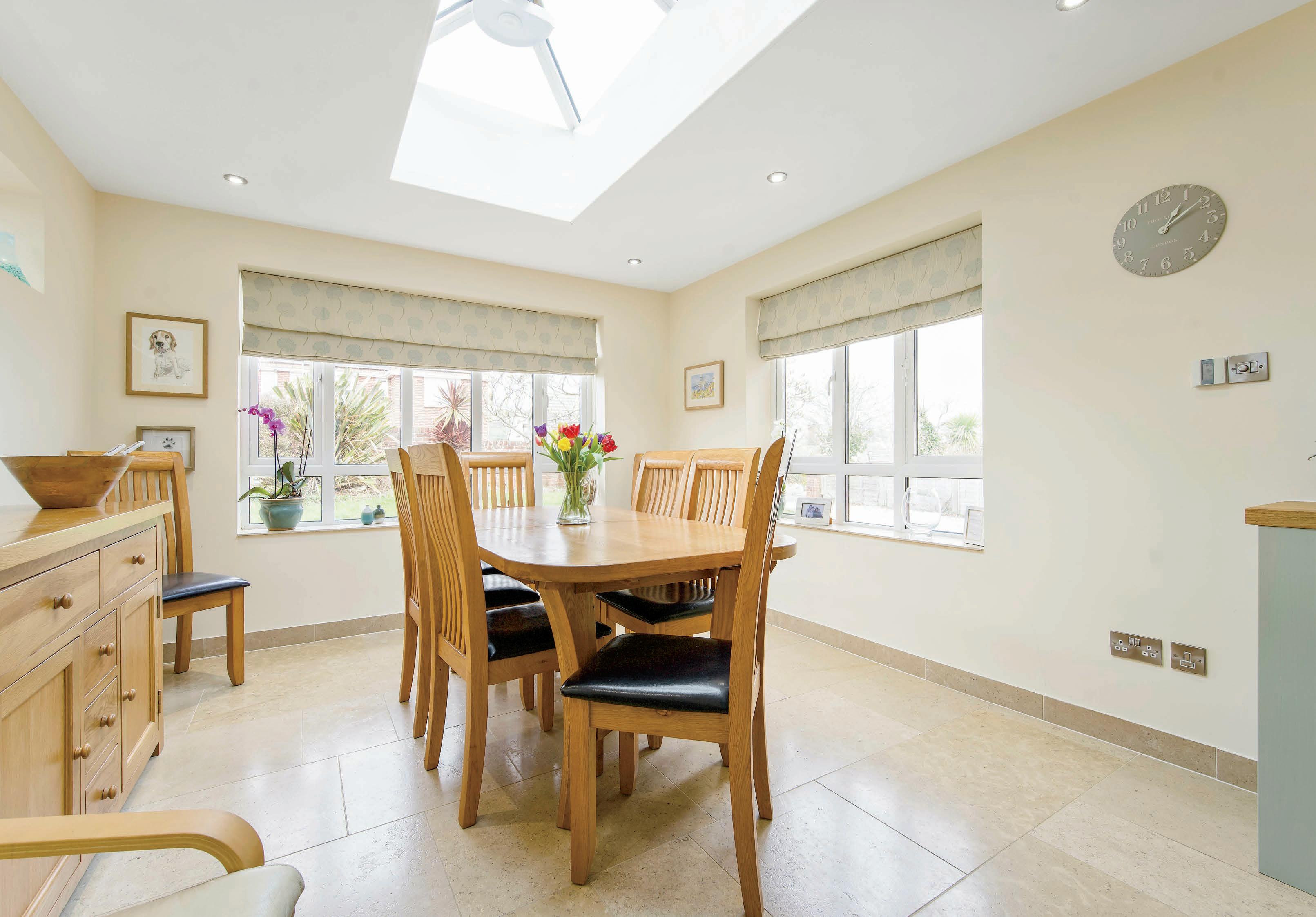 To the right of the hallway a very successful extension to the front of the home creates a light and airy kitchen/diner with glass atrium in the roof over the dining space and attractive tiled flooring. The beautiful shaker style kitchen forms the heart of the home, with wooden worktops that includes a central island, integral appliances, and a large range cooker. Laundry facilities and further storage are available in a separate adjoining utility room.