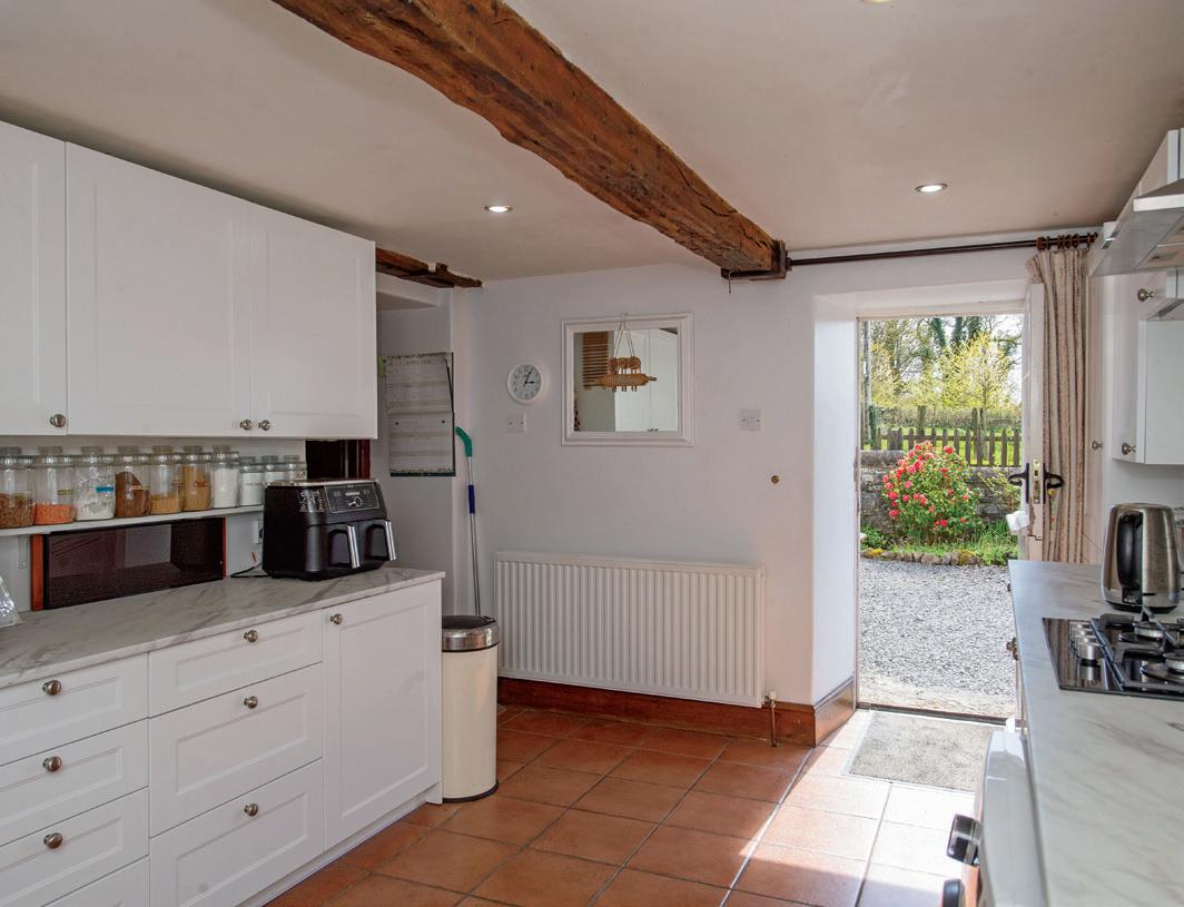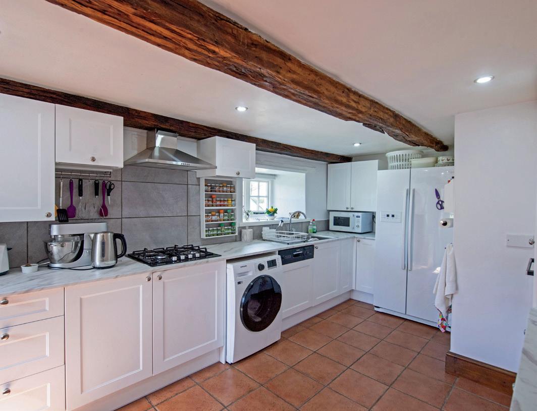 Descend two steps into the recently renewed kitchen, which offers an array of wall and base units featuring integrated appliances such as a NEFF oven/grill, double stainless-steel sink with drainage, Bosch dishwasher, Cooke & Lewis 4-ring gas hob, and an elevated extractor fan. There’s ample space for an under-counter appliance and a freestanding fridge/freezer. This space is further enhanced by tiled flooring, spotlighting, exposed beams, a window to the side, and a stable door leading to the rear.