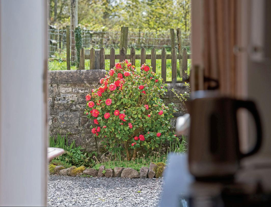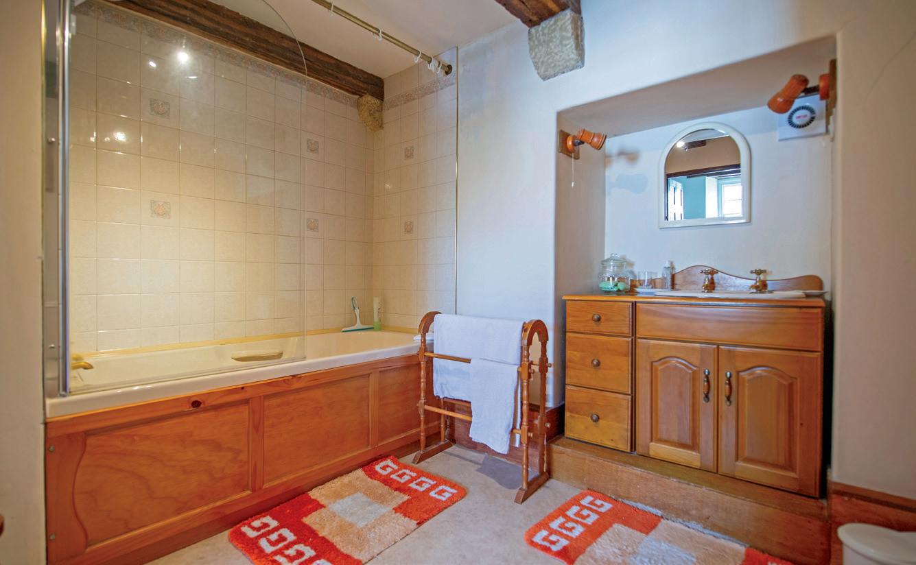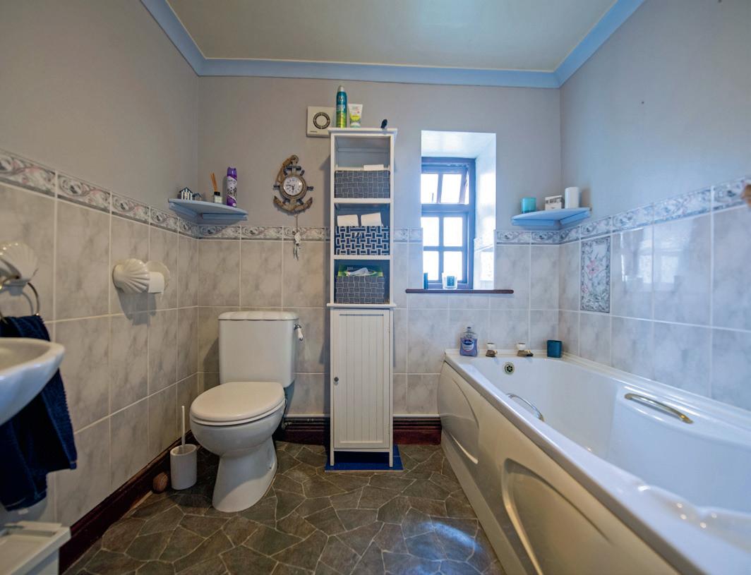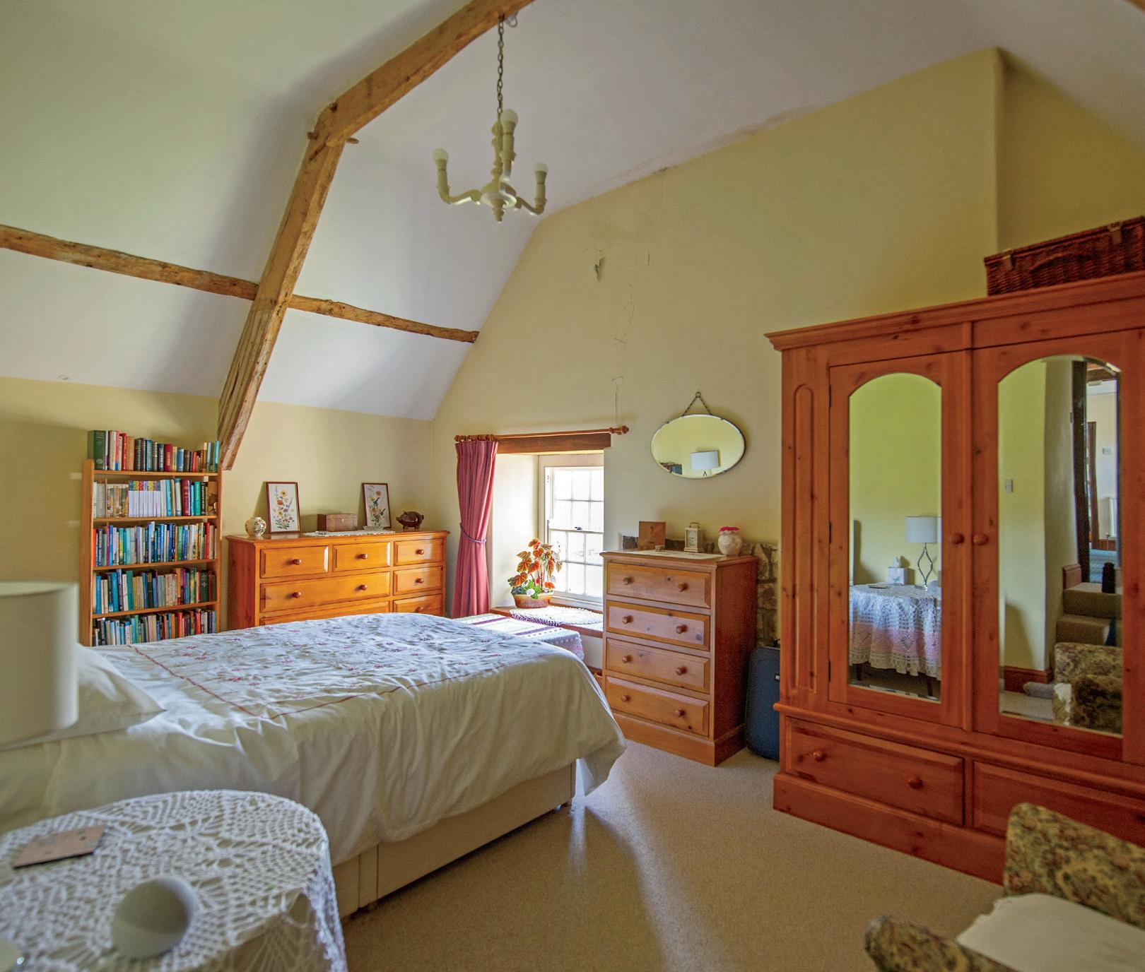 A bright bedroom with two windows to the side provides beautiful rural outlooks, with views extending to Carmarthen in the distance. This room is further enhanced by an additional Veluxstyle window, allowing ample natural light, lovely stone feature wall with fireplace and a vaulted ceiling with exposed beams. Bedroom four also benefits from a wash basin with vanity unit.
