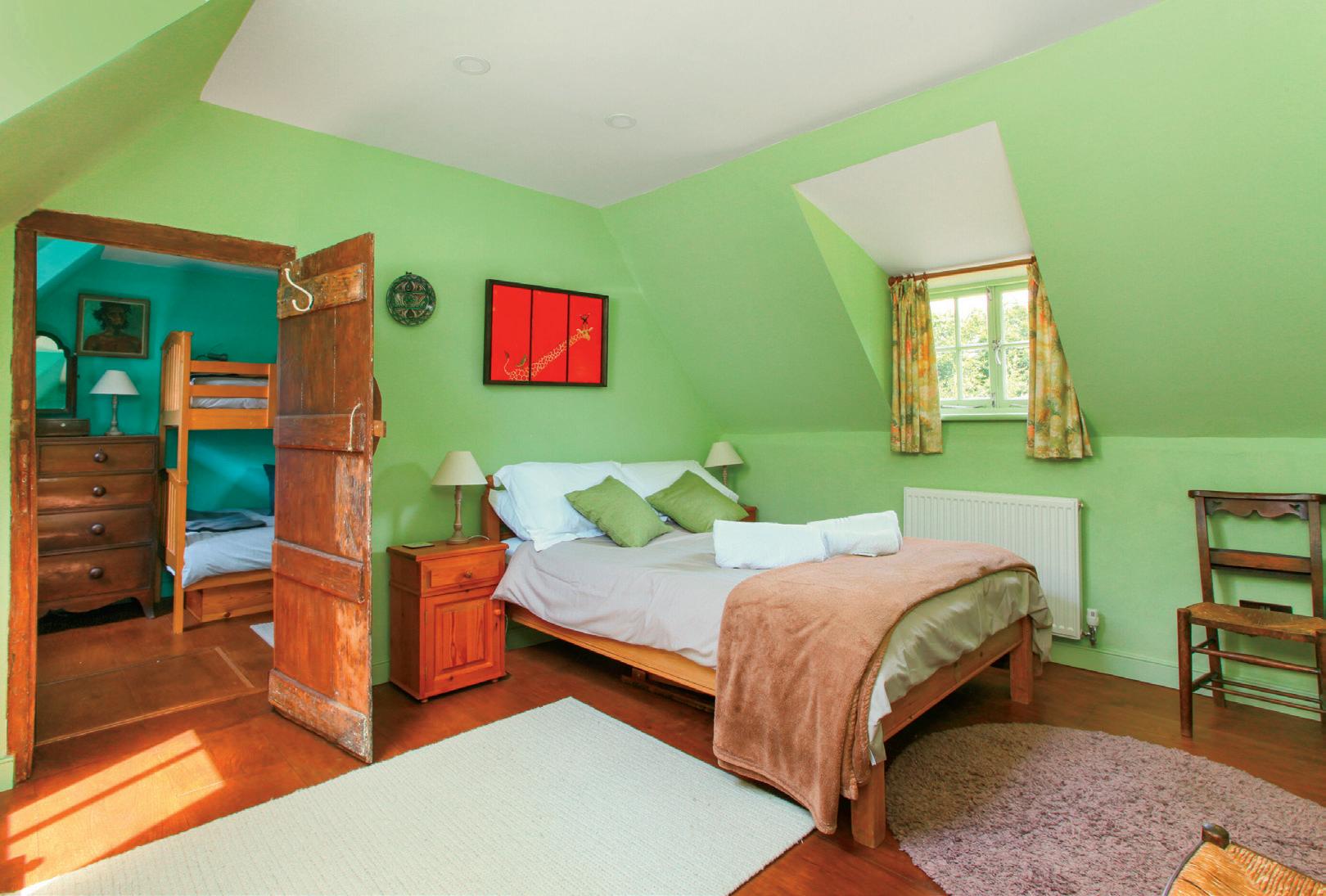 Oak staircases from the kitchen/breakfast room and lounge lead to the first floor where you will find five double bedrooms with oak flooring and a period family bathroom. This has a recently re-enamelled 1926 roll top bath, a period style toilet and handbasin, original floorboards and a fireplace as well as a unit with a marble top. Each bedroom has been tastefully decorated in a different and charming colour palette including the yellow and pale green bedrooms with vaulted ceilings, original fireplaces and inglenook cupboards while the turquoise and mid green rooms have exposed beamed ceilings.