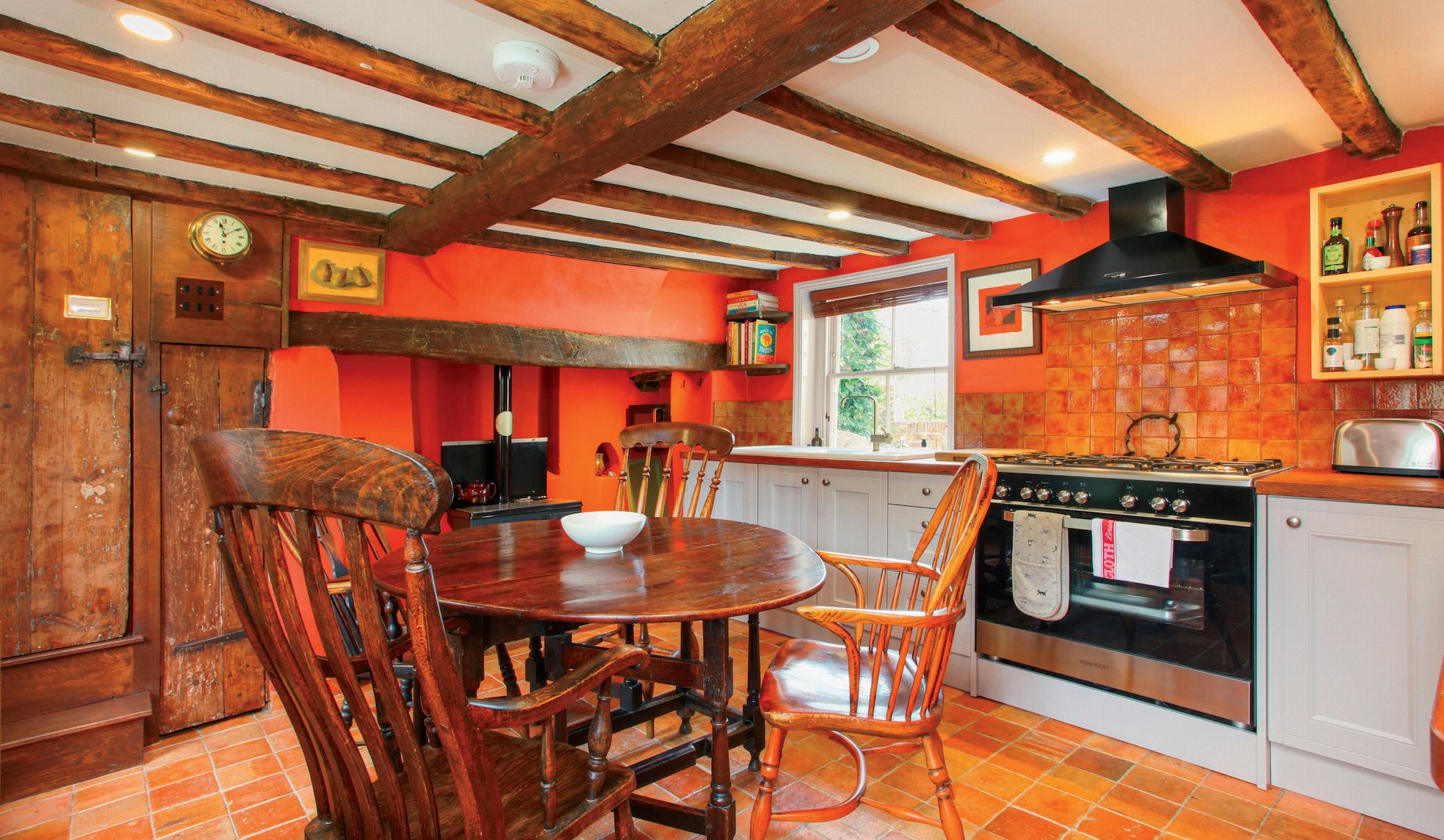 The truly delightful dual aspect kitchen/breakfast room has an effective mix of period and modern features. There are original beams, oak doors, an inglenook fireplace and 18th century floor tiles from the estate of a French chateau as well as an understairs cupboard with the original 17th century door, and handmade russet wall tiles, all brought together by bespoke red painted walls. Contemporary living is aided by a Kenwood range electric oven and gas hob with a Rangemaster extractor hood, Wren units and oak worktop installed in 2018 housing Bosch fridges and a Neff dishwasher.