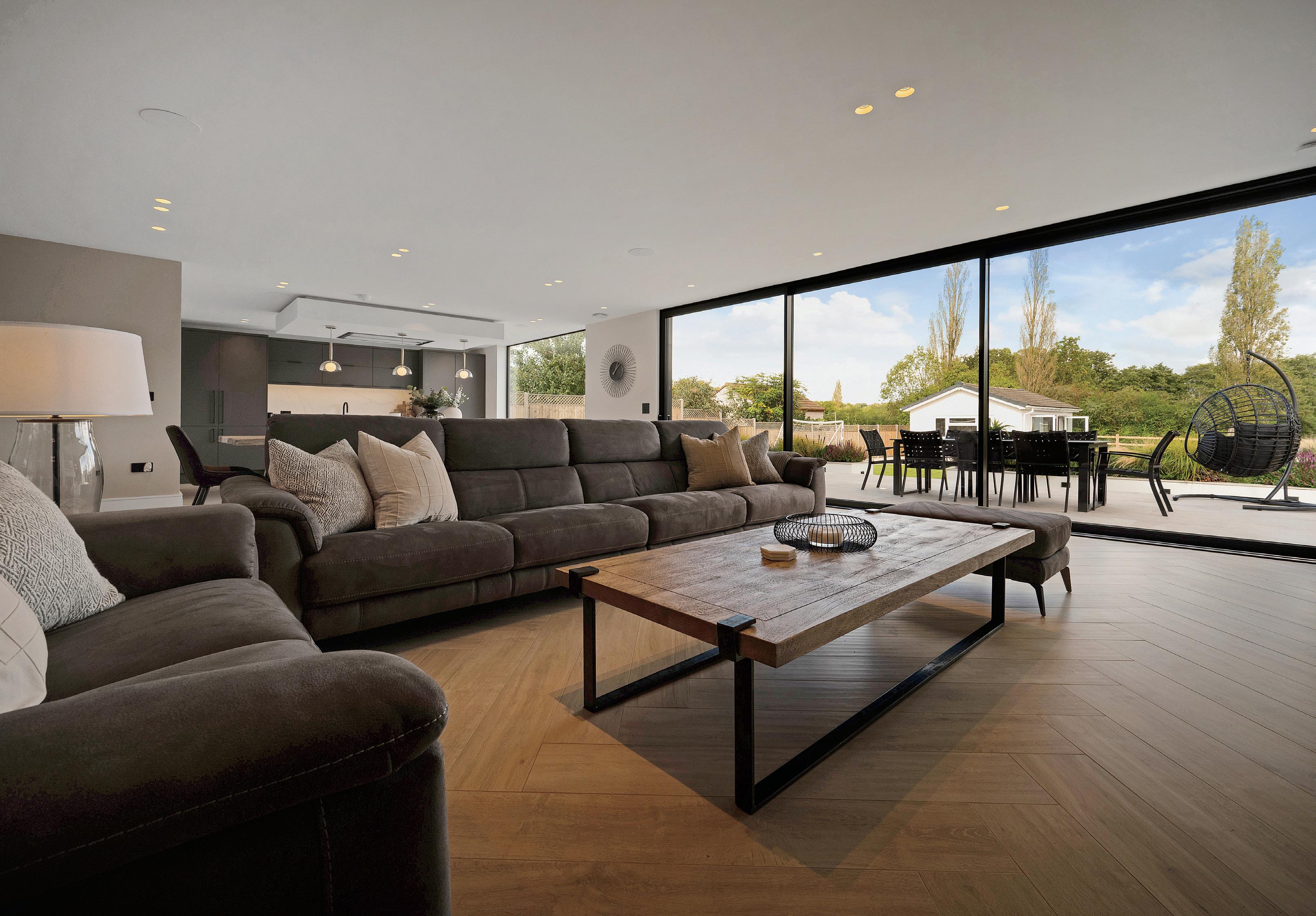 The Kitchen/Dining/Entertainment Room is undoubtedly the heart of the home. With its outstanding views of the landscaped rear garden and British countryside, it’s a truly breathtaking space. The gas fireplace, wall panelling, wall-mounted TV and integrated SONOS speakers create an ideal setting for both relaxation and entertainment. The full-length sliding doors to one side leading to the alfresco dining area make it perfect for enjoying the outdoors, with further light via the floor to ceiling window.