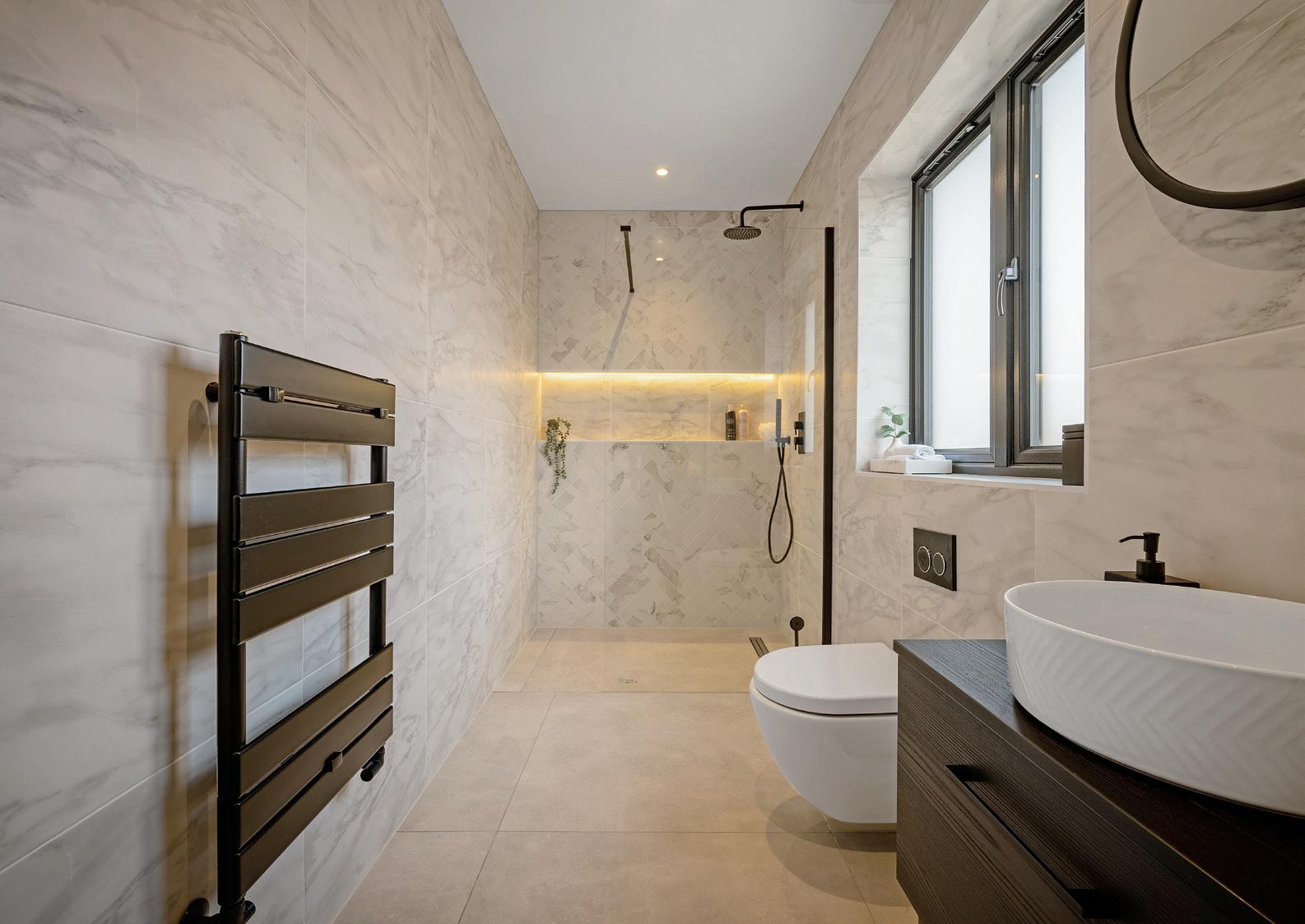 Family Bathroom: The luxury contemporary features in the Family Bathroom, such as underfloor heating, tiled floors and walls and skylight windows, create a spa-like atmosphere. The inclusion of a sunken iron claw bath, walk-in shower cubicle and stylish fixtures adds to its appeal.