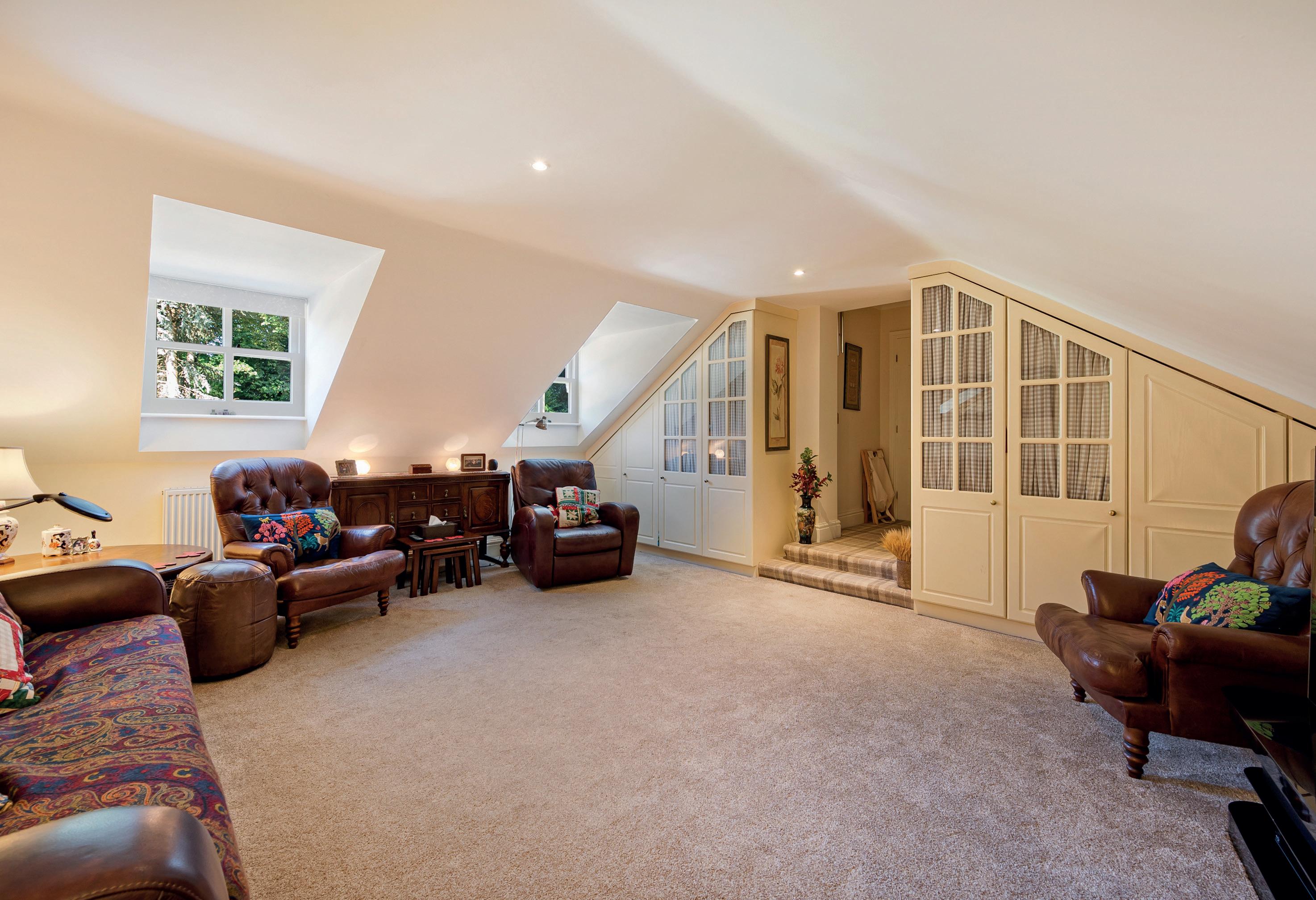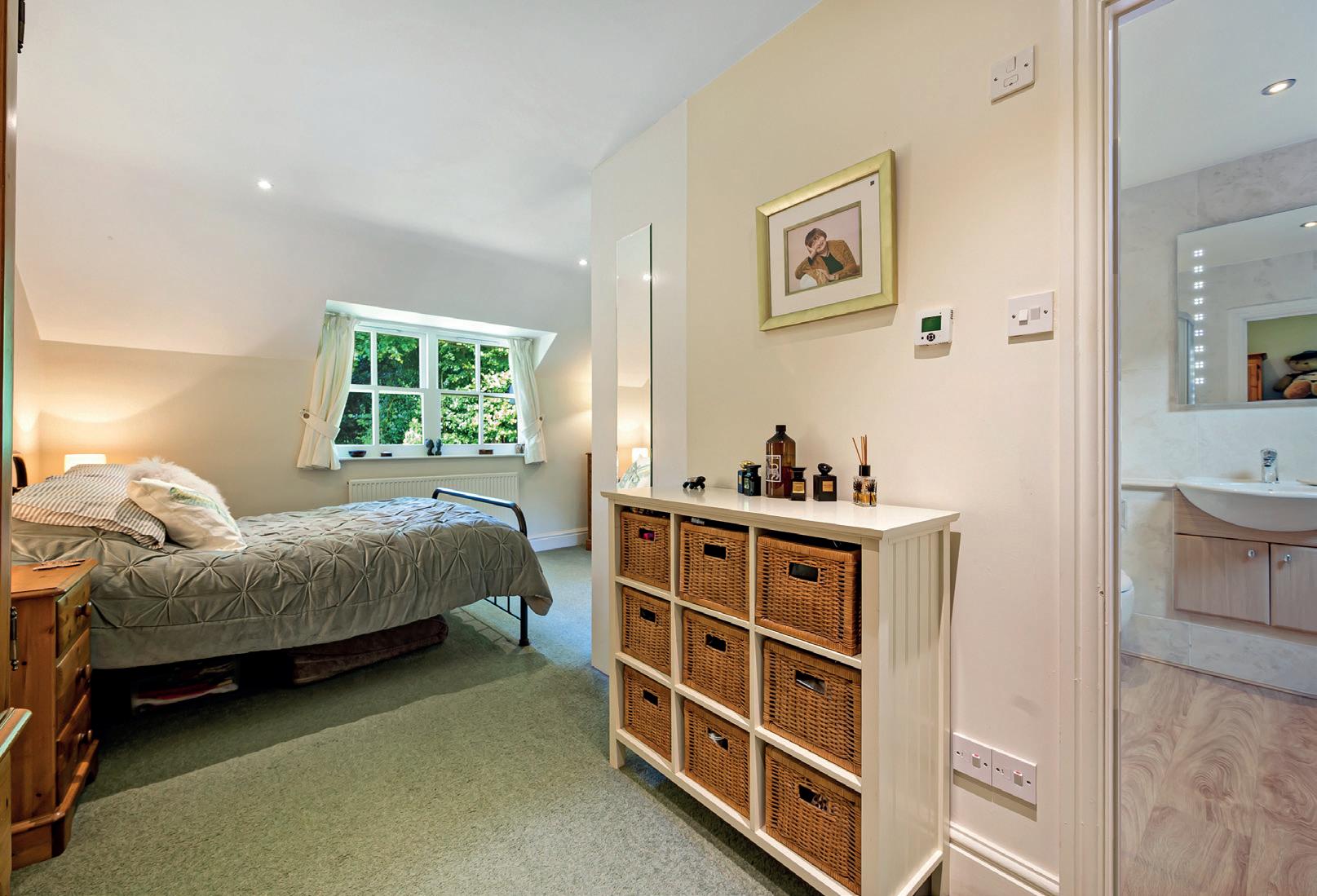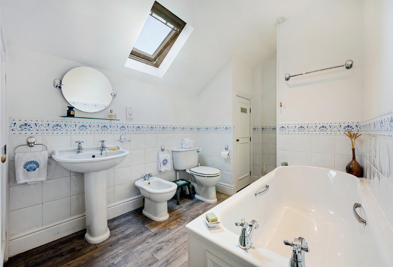 To the first floor is a central landing with Velux rooflights flooding the space with natural daylight. The master bedroom is ‘L’ shaped and has fitted wardrobes and an en-suite bathroom with both a jacuzzi bath and shower. There is a further spacious double bedroom with fitted wardrobes which is currently used by the owners as a sitting room, with two further bedrooms and a house bathroom which also has both a bath and shower.