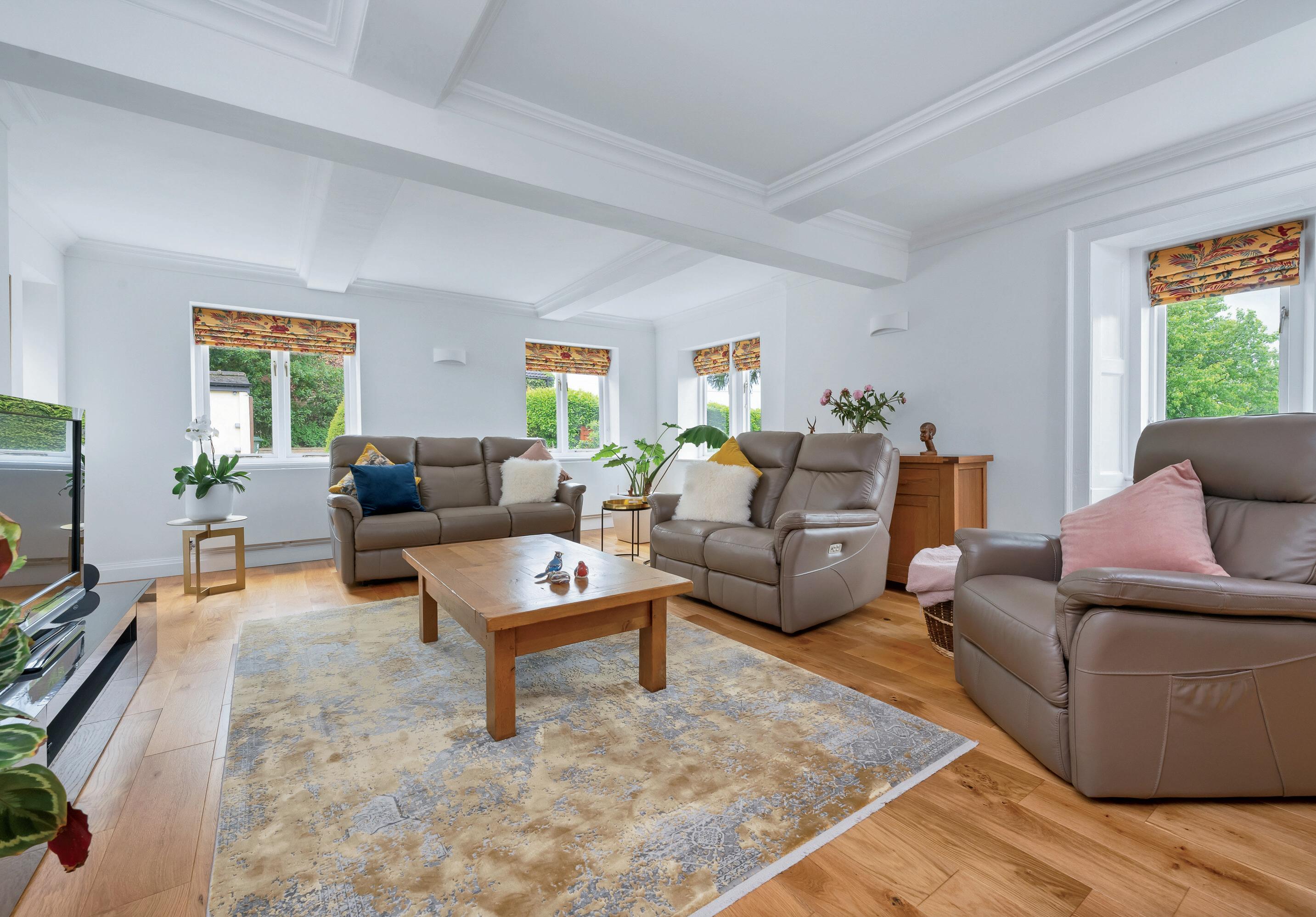 Surrounded by private, landscaped lawns, the garden areas encircle the property, providing versatile spaces for family activities, from play and gardening to relaxing and entertaining. A large patio, accessible from the kitchen, offers a secluded spot perfect for alfresco dining.