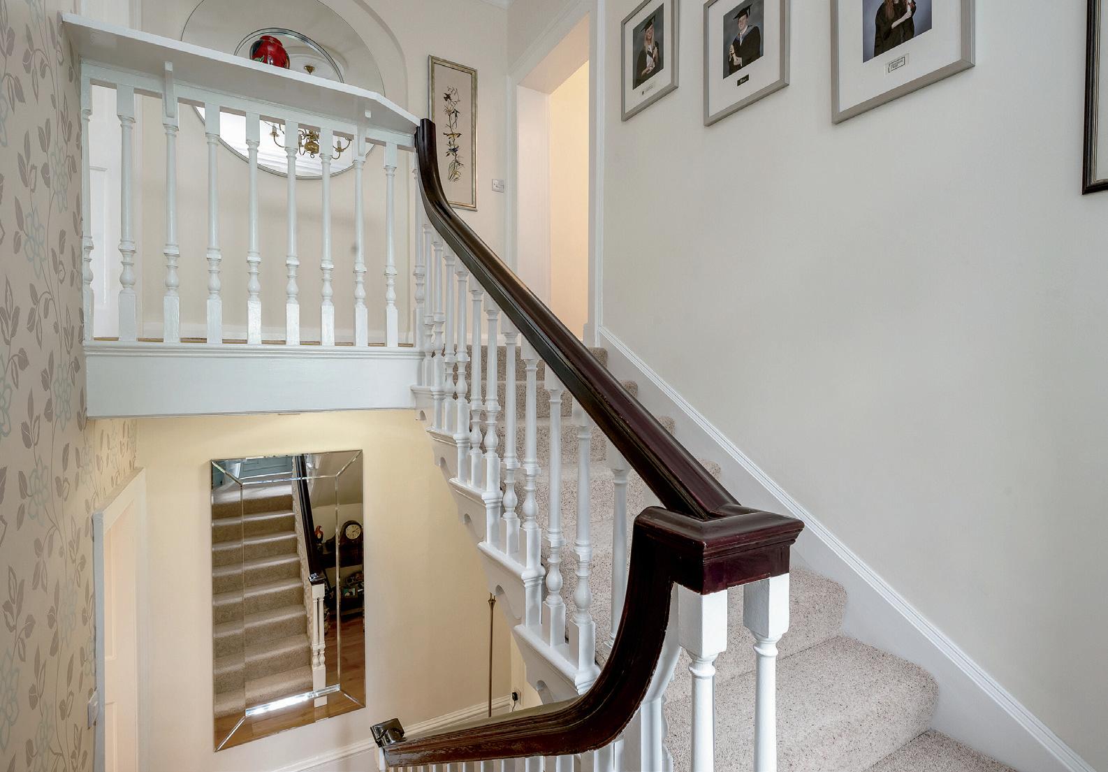 Ascend to the first floor, where a semi-galleried landing offers an elegant view of the entrance hallway and vestibule. The landing leads to the principal bedroom, a spacious family bathroom with a separate shower cubicle, bedroom four, and bedroom two, which is accessed by a private staircase.