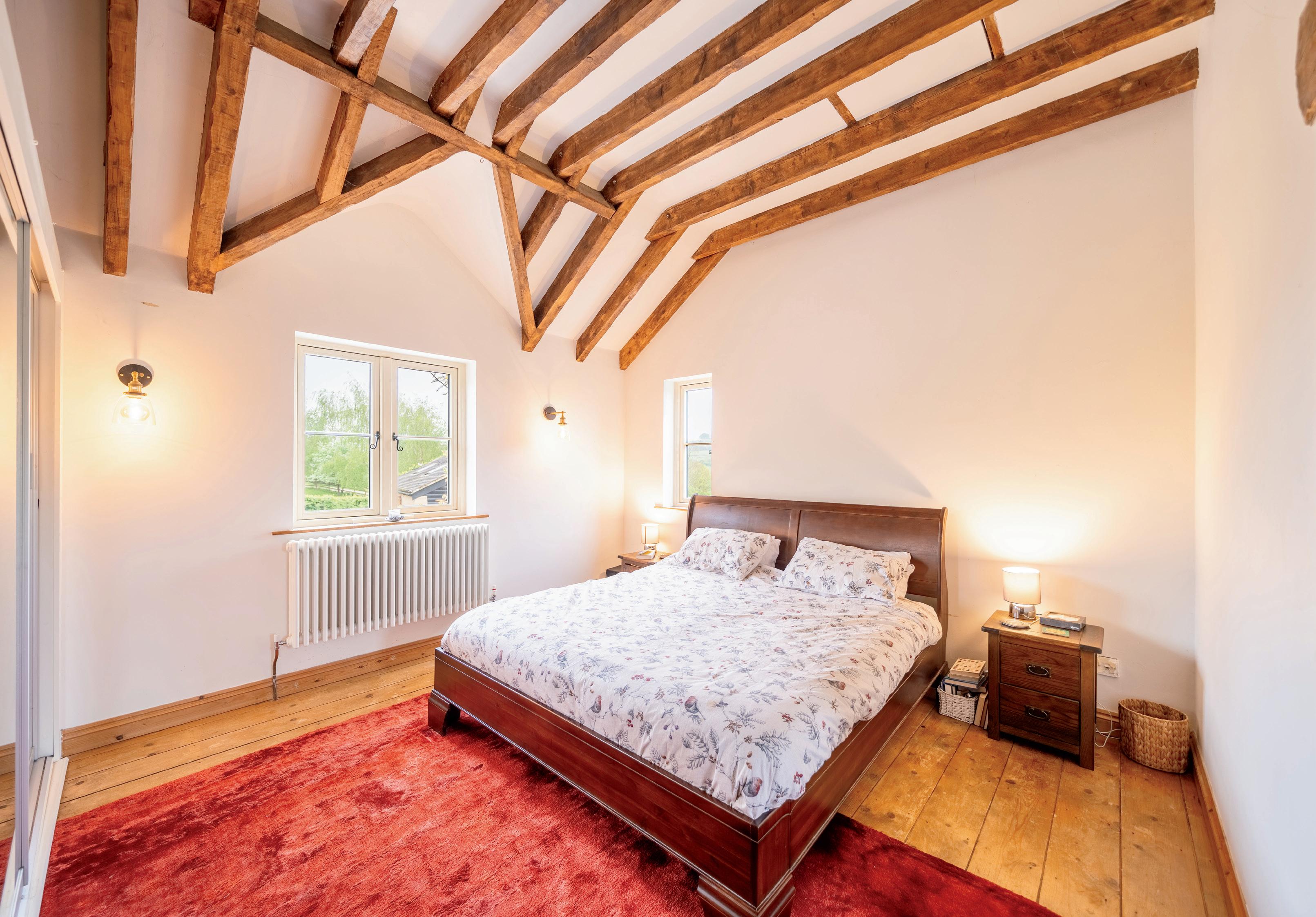 Continuing along the corridor, you’ll discover the exquisite principal suite. Stepping down from the original stone threshold, you’re enveloped in elegance. The suite boasts a remarkable vaulted ceiling adorned with intricate wooden beams, creating a sense of grandeur. Natural light floods the space from windows gracing three sides of the room, infusing it with warmth and tranquillity. Additionally, the suite indulges in the luxury of an en-suite shower room, ensuring utmost comfort and convenience.