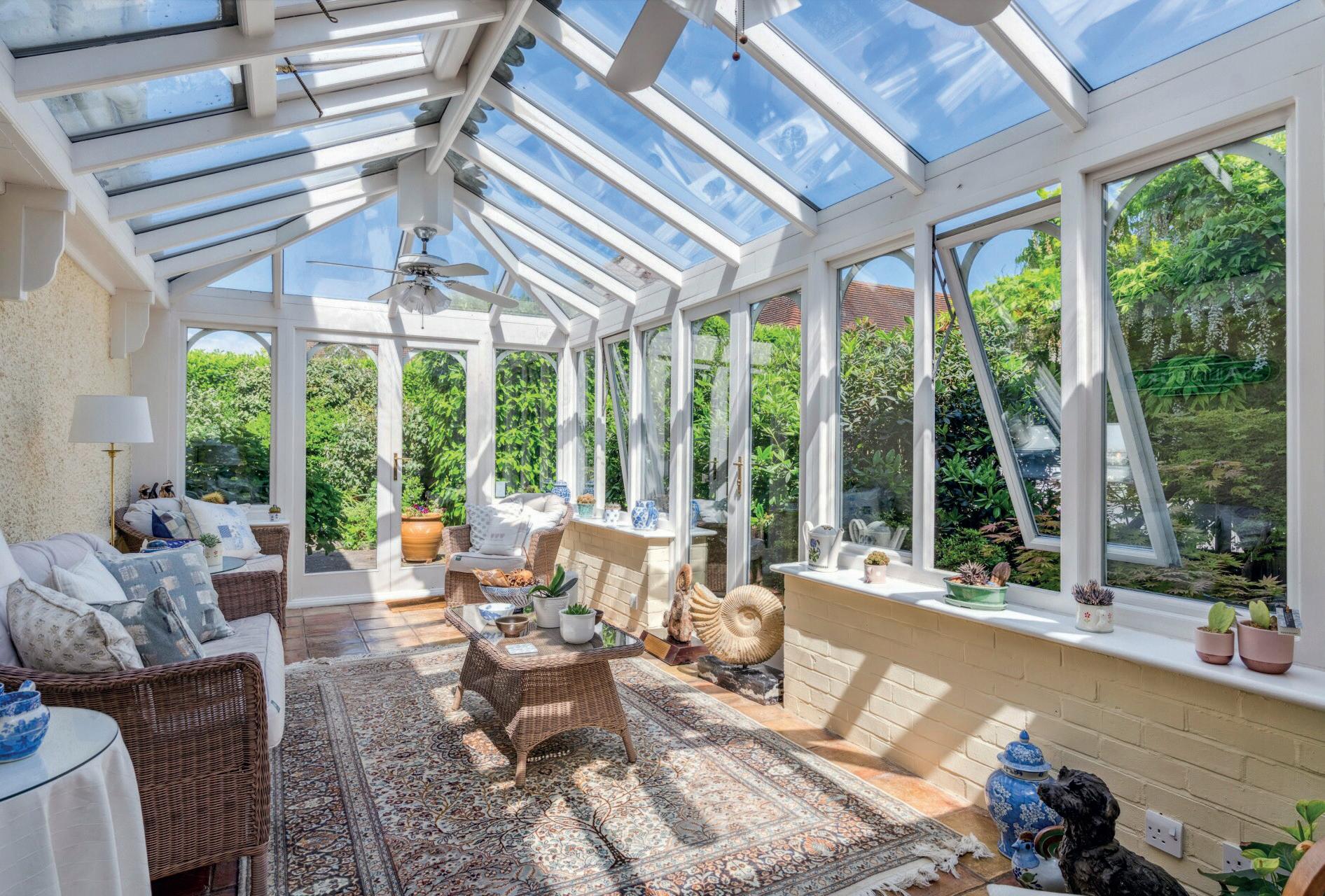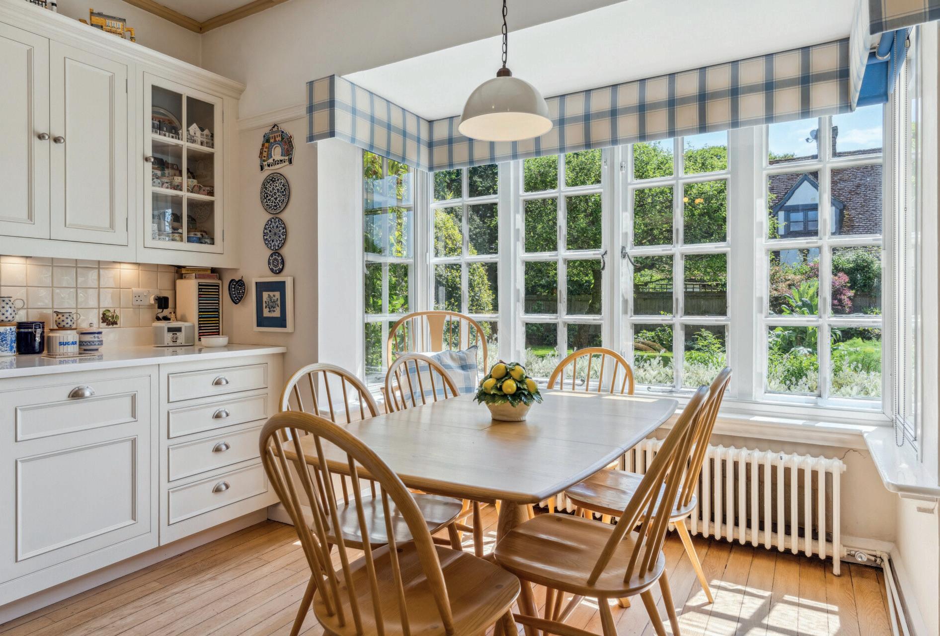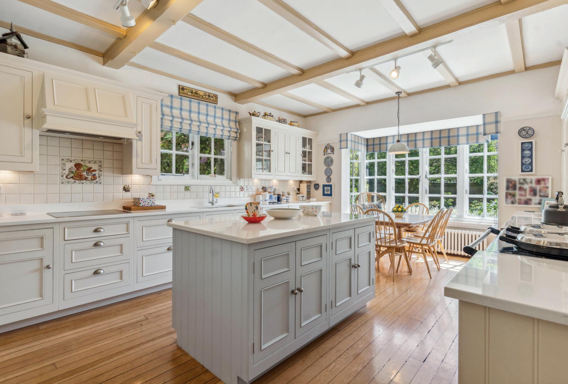 The kitchen/breakfast room features a handmade solid wood kitchen with a gas-fired AGA and an array of Miele integrated appliances, including double electric fan ovens, an induction hob, and a dishwasher. Adjacent to the kitchen/breakfast room is another generously proportioned reception room, currently used as a sitting room which has French doors leading out onto the southerly facing terrace.