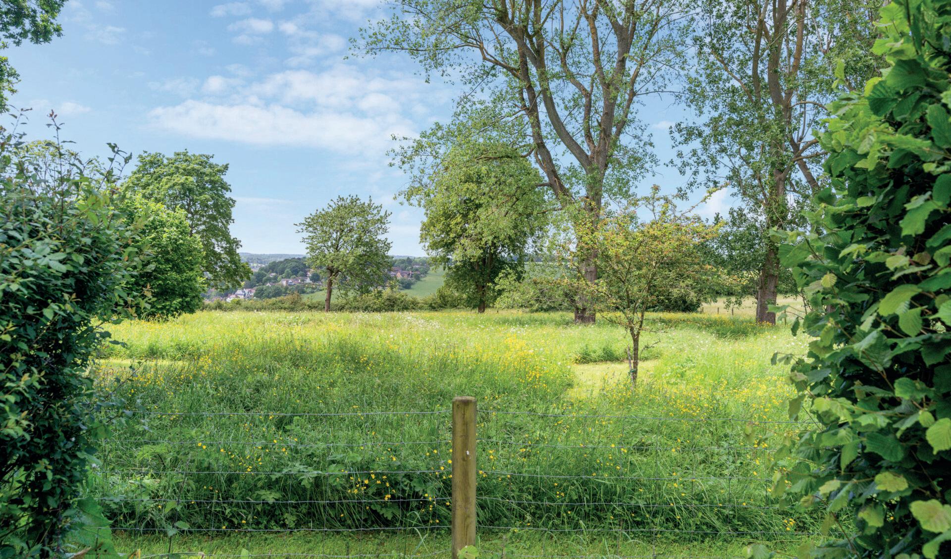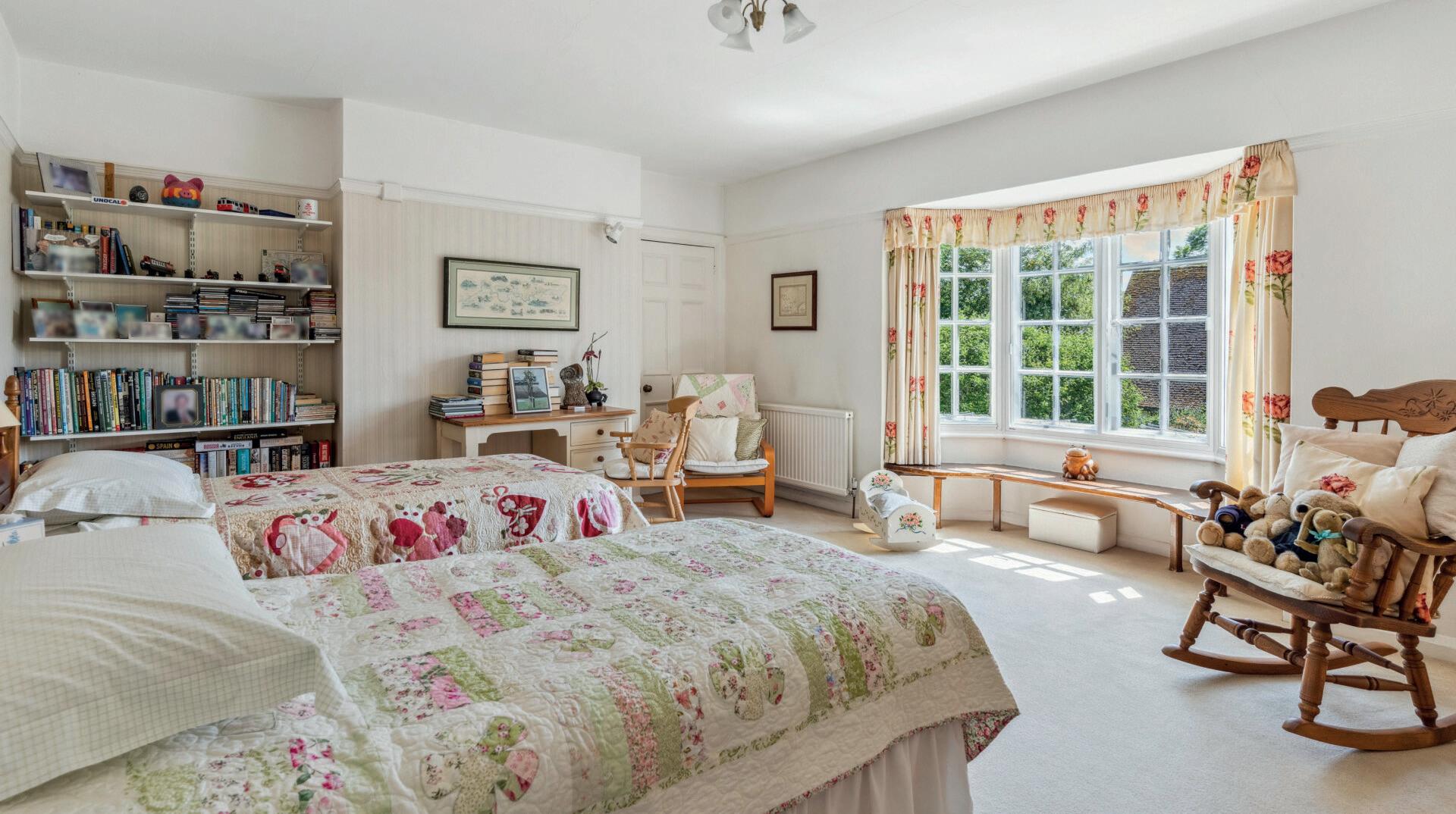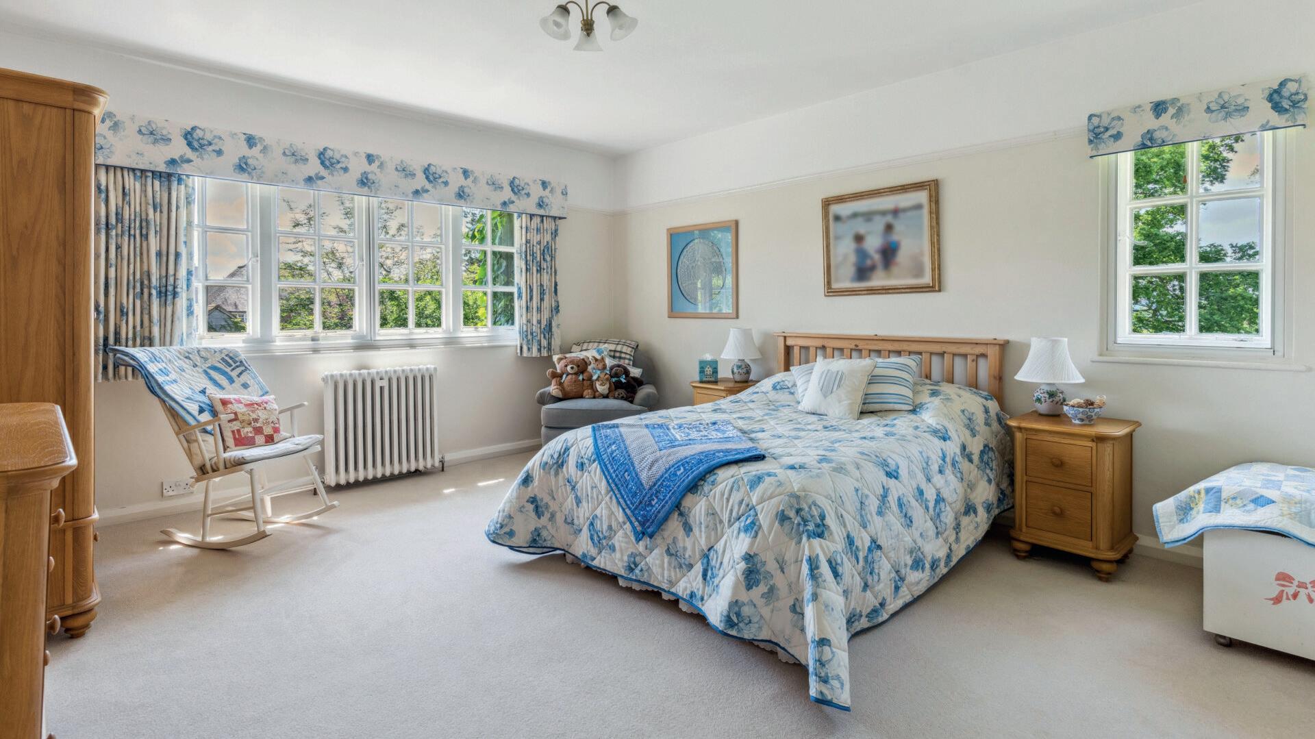 On the first floor, the principal bedroom is dual aspect and flooded with natural light. It features fitted wardrobes and a large en-suite with a separate shower. The guest bedroom is also dual aspect and enjoys views of the countryside beyond the rear garden, with the added luxury of an en-suite. There are three further double bedrooms and a family bathroom.
