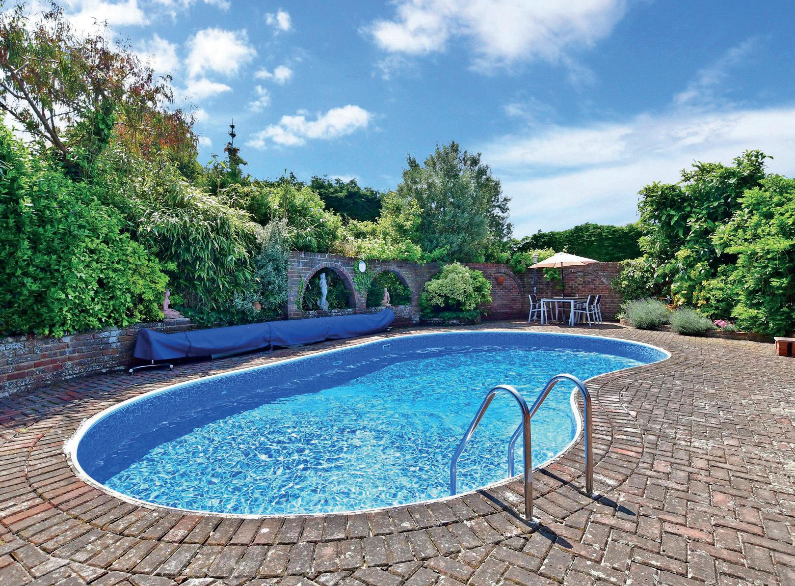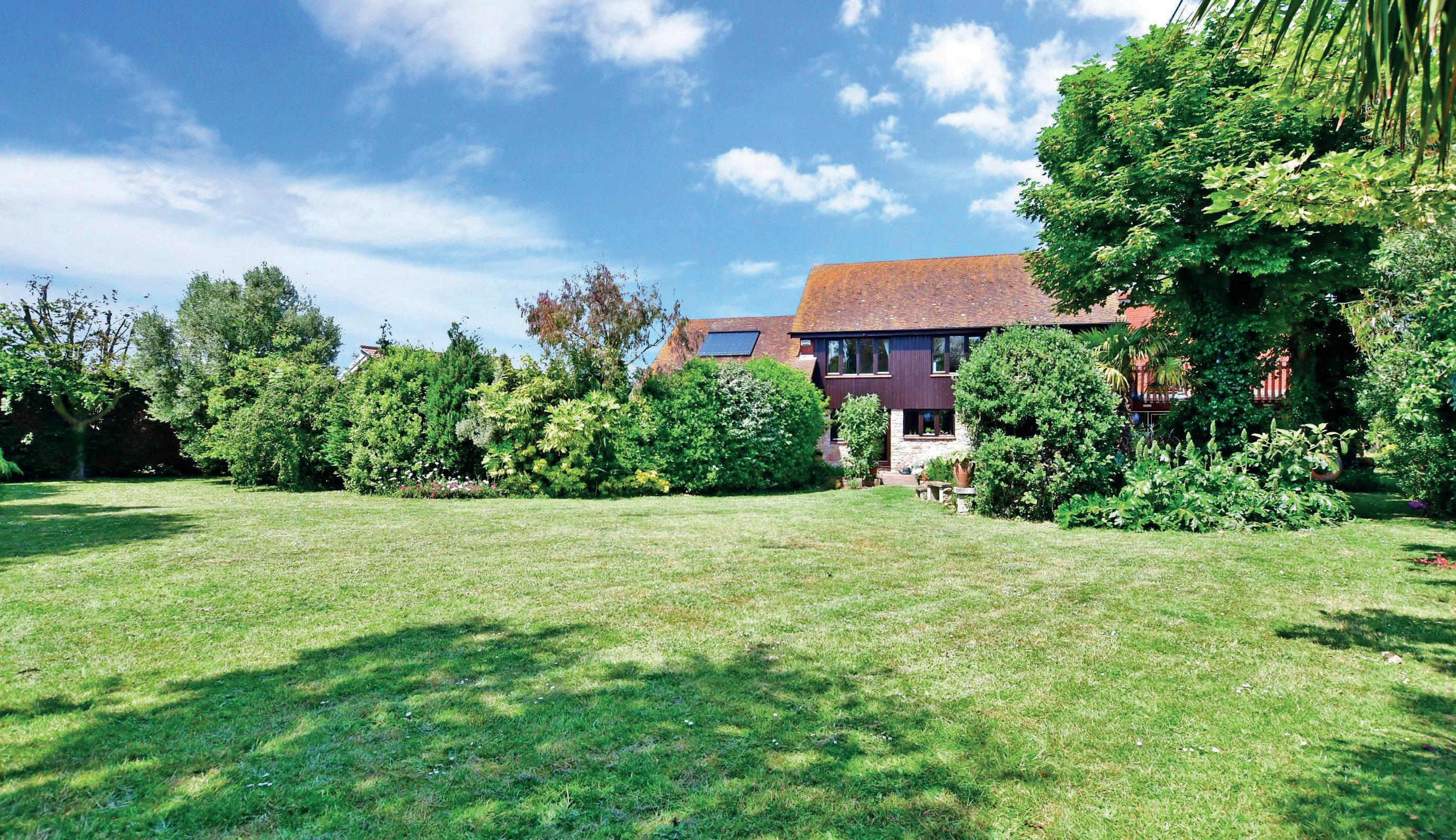 Tucked away in a quiet, private enclave of eight Scandinavian style detached family homes is this delightful five bedroom residence with a swimming pool and a large secluded garden set within 0.5114 of an acre, yet it is only a minute’s walk from the seafront so also has sea views. Sweeping through the gates of the in-and-out driveway, flanked by a wall sheltering the front garden, you see the property for the first time and, with its charming brick turret, dark wood cladding, Portland stone feature and gorgeous arched front porch, it has enormous external appeal.