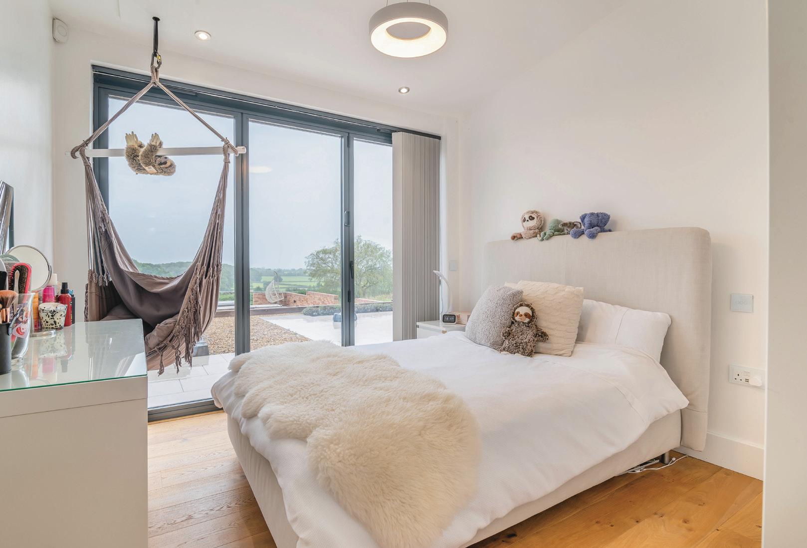 The front of the house is glass, with bifold doors allowing views that sweep across the garden to the rolling countryside beyond and pull natural light into all the rooms. It is very much an inside outside home where the owners say you always have idyllic views of herons and pheasants in the garden, with sheep and horses contentedly grazing in neighbouring fields, Perhaps the greatest pleasure is taken from the radiant sunsets and the ever changing skies. It is an idyllic setting and gives the house a great wow factor.