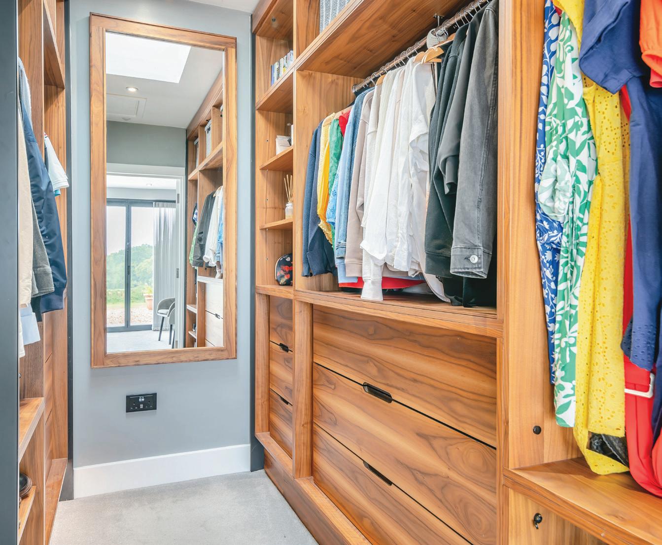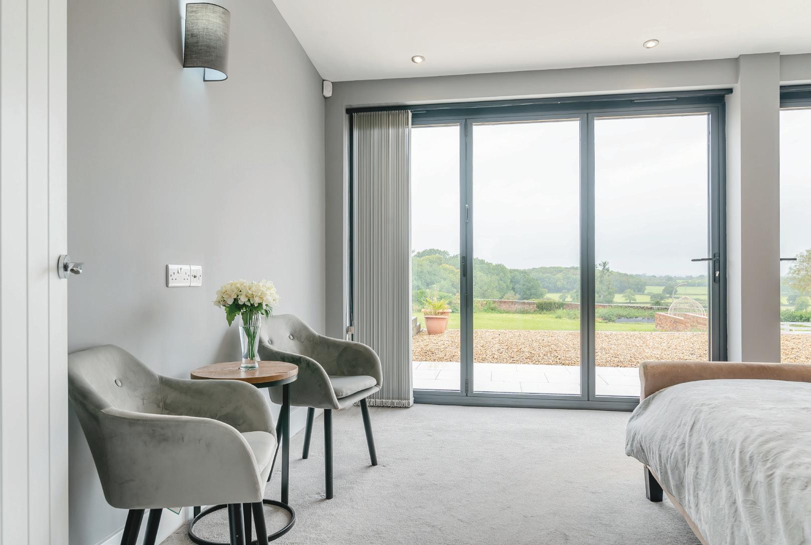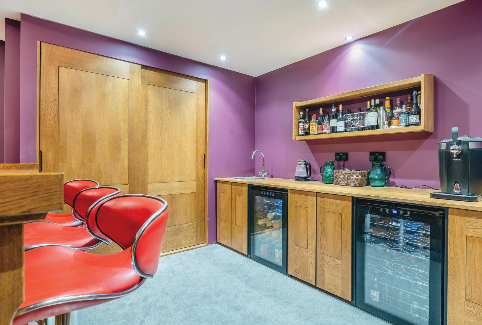 At the heart of the property is the stunning bespoke kitchen, fitted with top-of-theline integrated appliances. The large central island is not only a culinary hub but also features USB ports for convenience. From here, the open-plan layout leads seamlessly into the spacious living and dining area. The focal point is a modern wood burner that adds warmth and charm, while bi-folding doors flood the space with natural light and offer access to the expansive patio. This layout is perfect for entertaining or simply enjoying the peaceful countryside views.