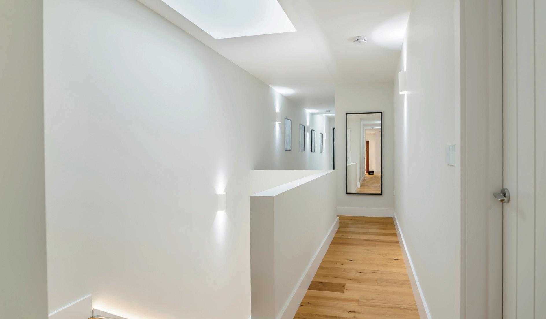 Once inside, you are greeted by a light-filled, modern hallway with underfloor heating and a stylish glass walkway, setting the tone for the rest of this contemporary home.