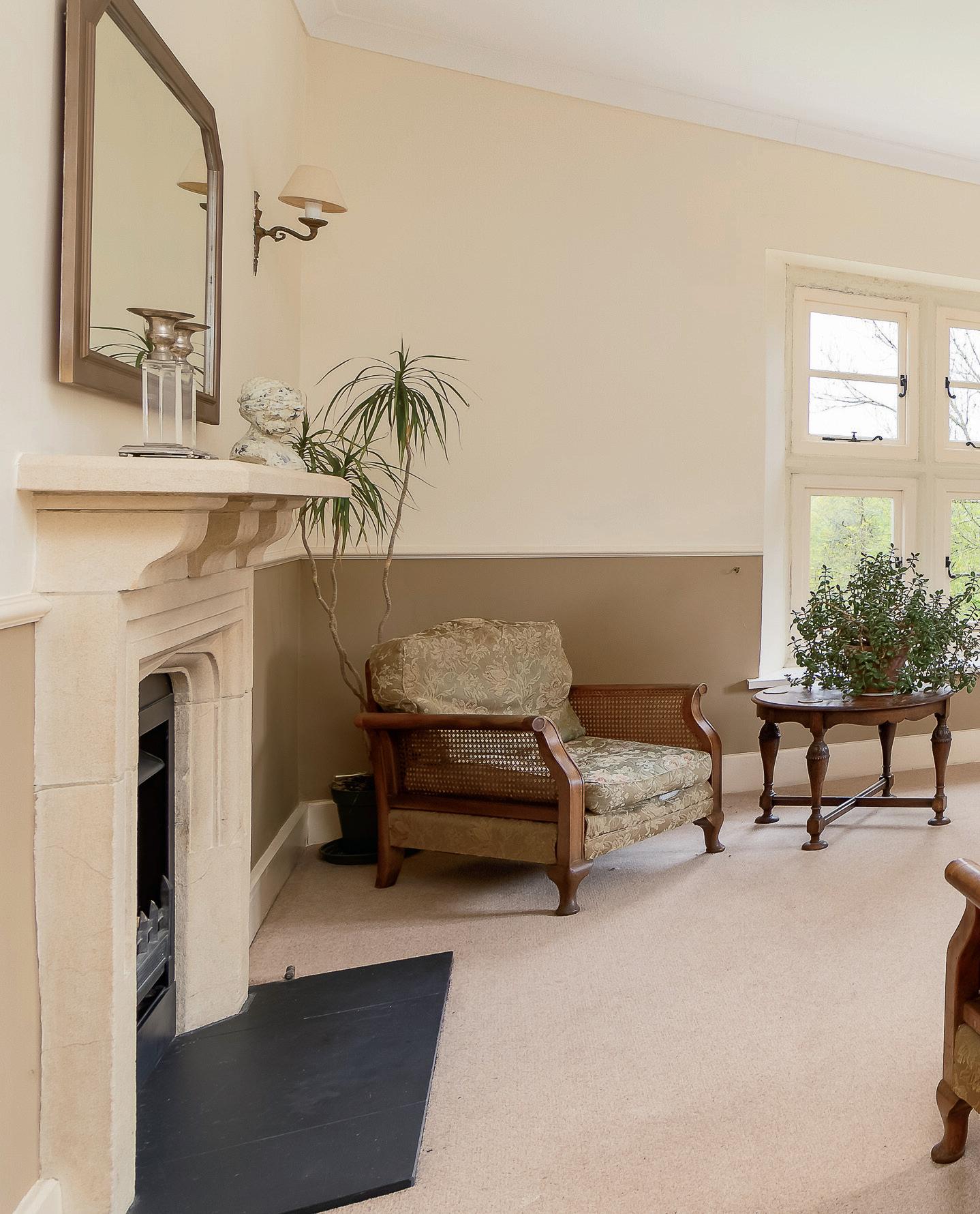 The dining room boasts a charming fireplace, window and glass double doors that connect to the generously sized sitting room. Adorned with its own striking stone fireplace with slate hearth, the dual aspect sitting room offers captivating views of the picturesque grounds. Gaze out of the south-facing window to admire the scenery, including the graceful swans gliding across the lake and the oft-visiting deer.