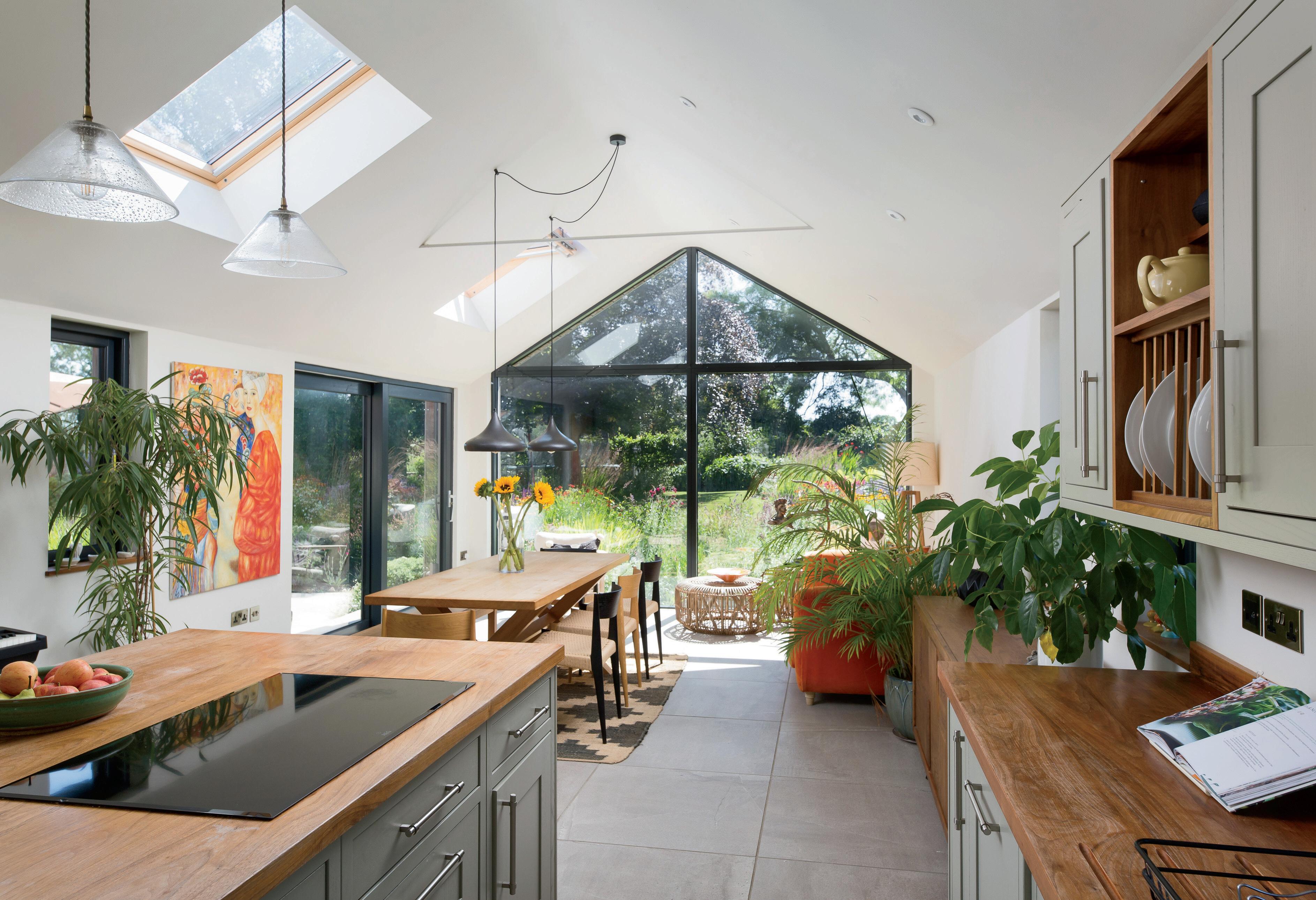Sitting firmly at the garden edge, in a cedar clad and stone extension, the kitchen/diner has a vaulted ceiling with floor to ceiling window, sliding doors and a range of integrated appliances including a double oven fridge/freezer, dishwasher, a central island unit/breakfast bar with handmade walnut worktop and double sink. The flooring is Italian porcelain.