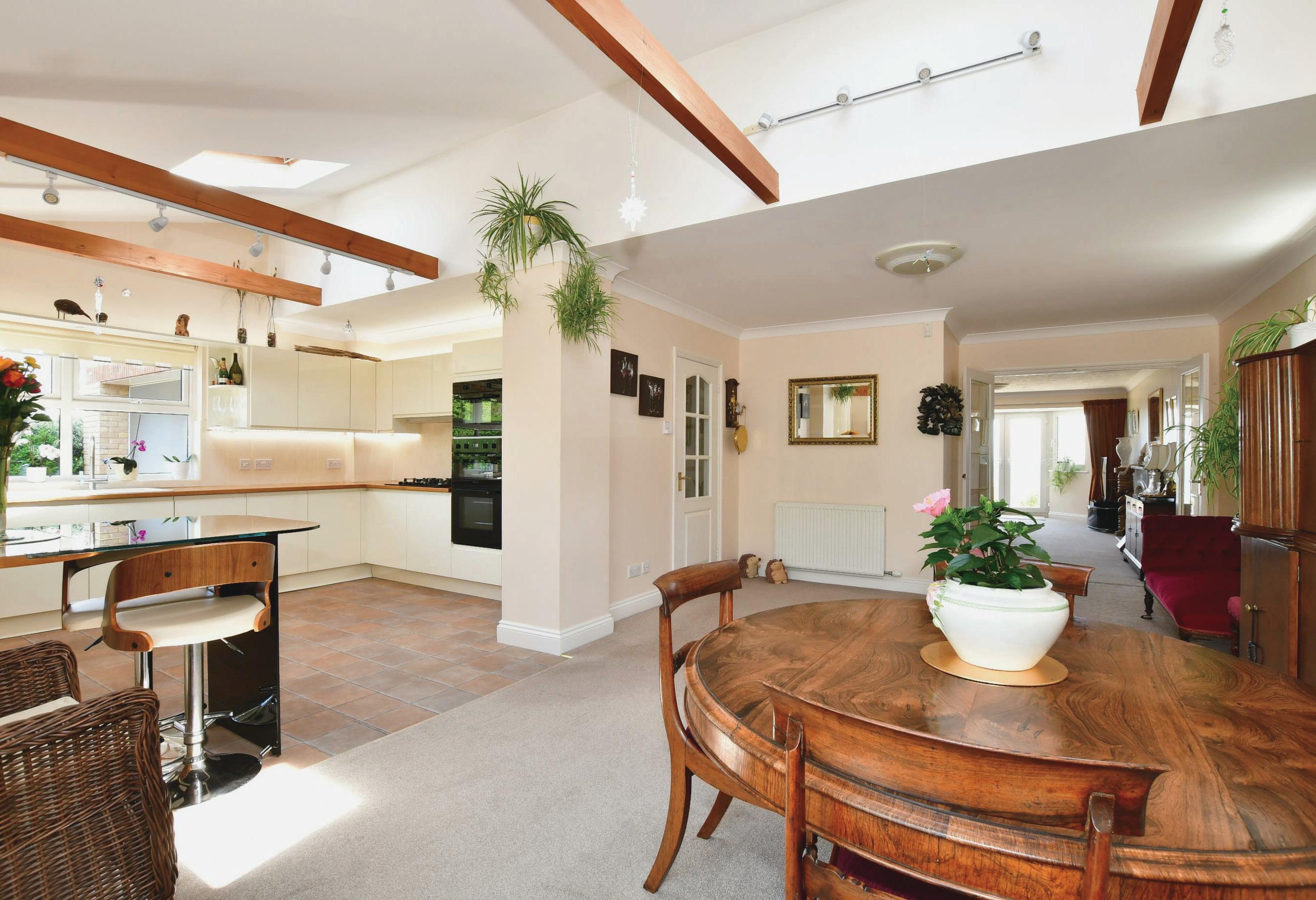 For anyone who likes catering and entertaining, the Ian Pennick designed kitchen has everything. It is well-proportioned with a central ceiling beam and includes glossy cream flat-fronted units housing a five ring gas hob and concealed extractor, a built in double oven and combi microwave as well as space for other appliances. There is a very smart peninsular breakfast bar and a skylight with electronic blinds. A similar ceiling beam and skylight can also be found in the spacious dining area where you could easily seat 10 people round the table.