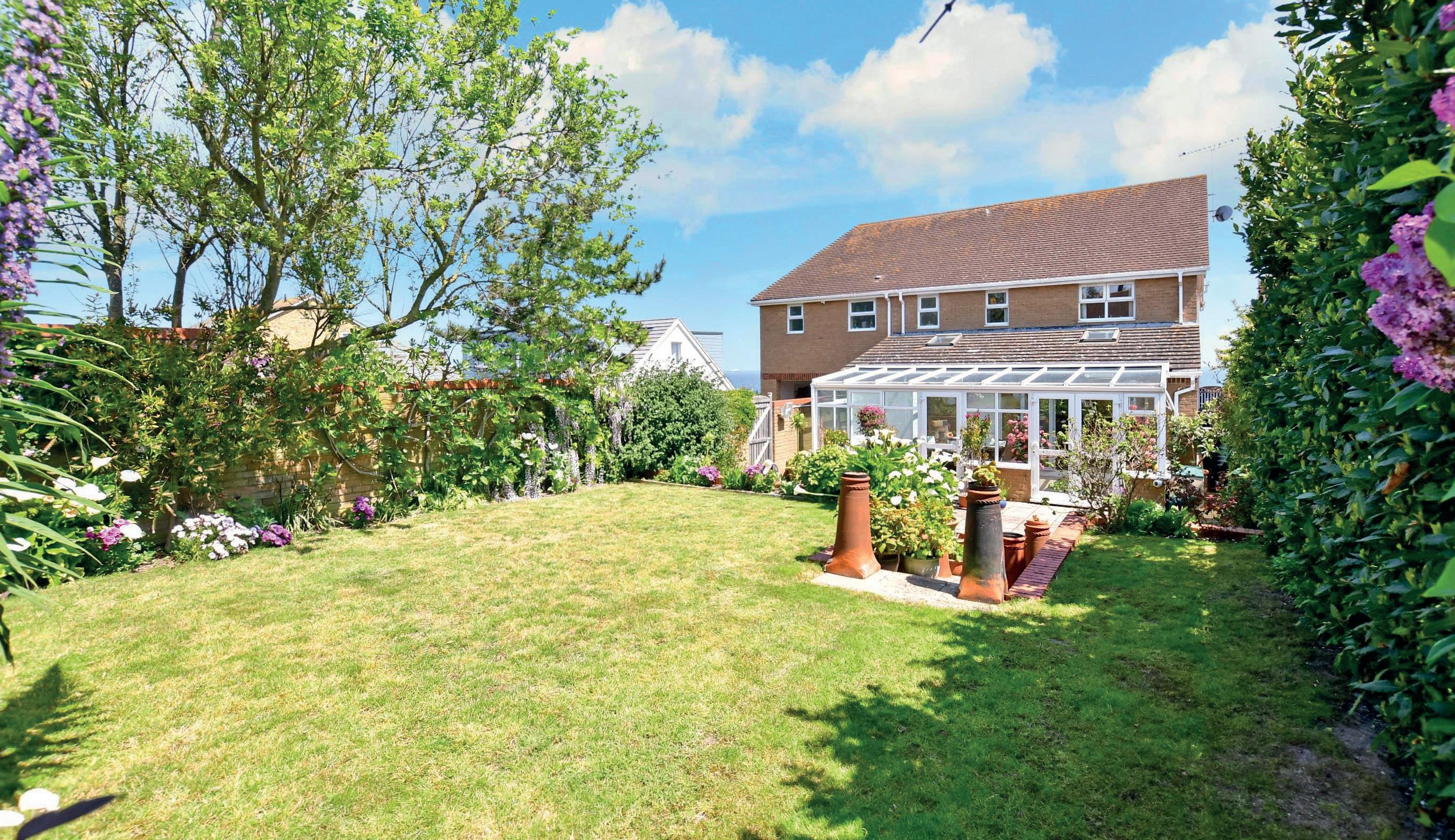 The rear garden includes a large terrace for al fresco entertaining, bordered by raised brick built shrub beds and steps leading to a lawn and a path to the garage. The driveway continues past the garden to the large, brick built pitched roof double garage that could always be converted into additional accommodation, subject to the necessary permissions. There is also a discreetly hidden, but very large, garden shed as well as plenty of off road parking for numerous vehicles.