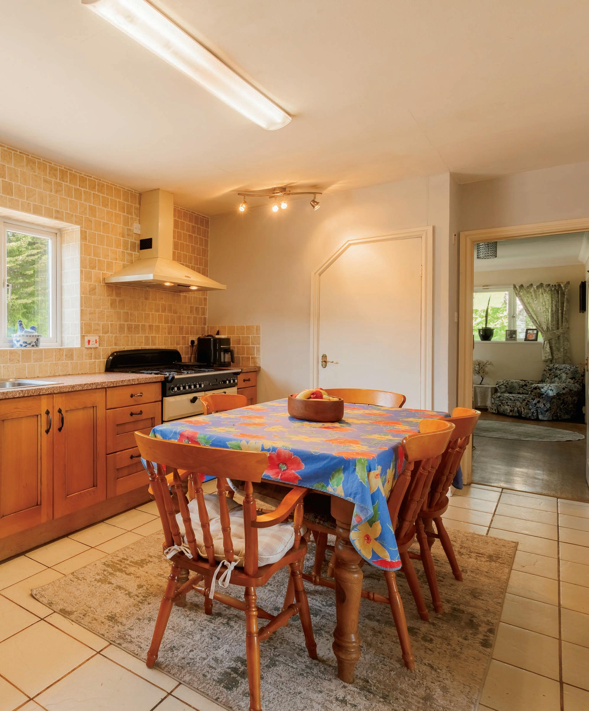 The light and airy living room provides a comfortable space with a wood-burning stove and patio doors that open to the rear garden, seamlessly connecting to the outdoors. This space flows into the dining room, which boasts beautiful views of the surrounding countryside.