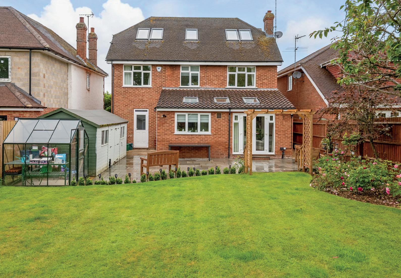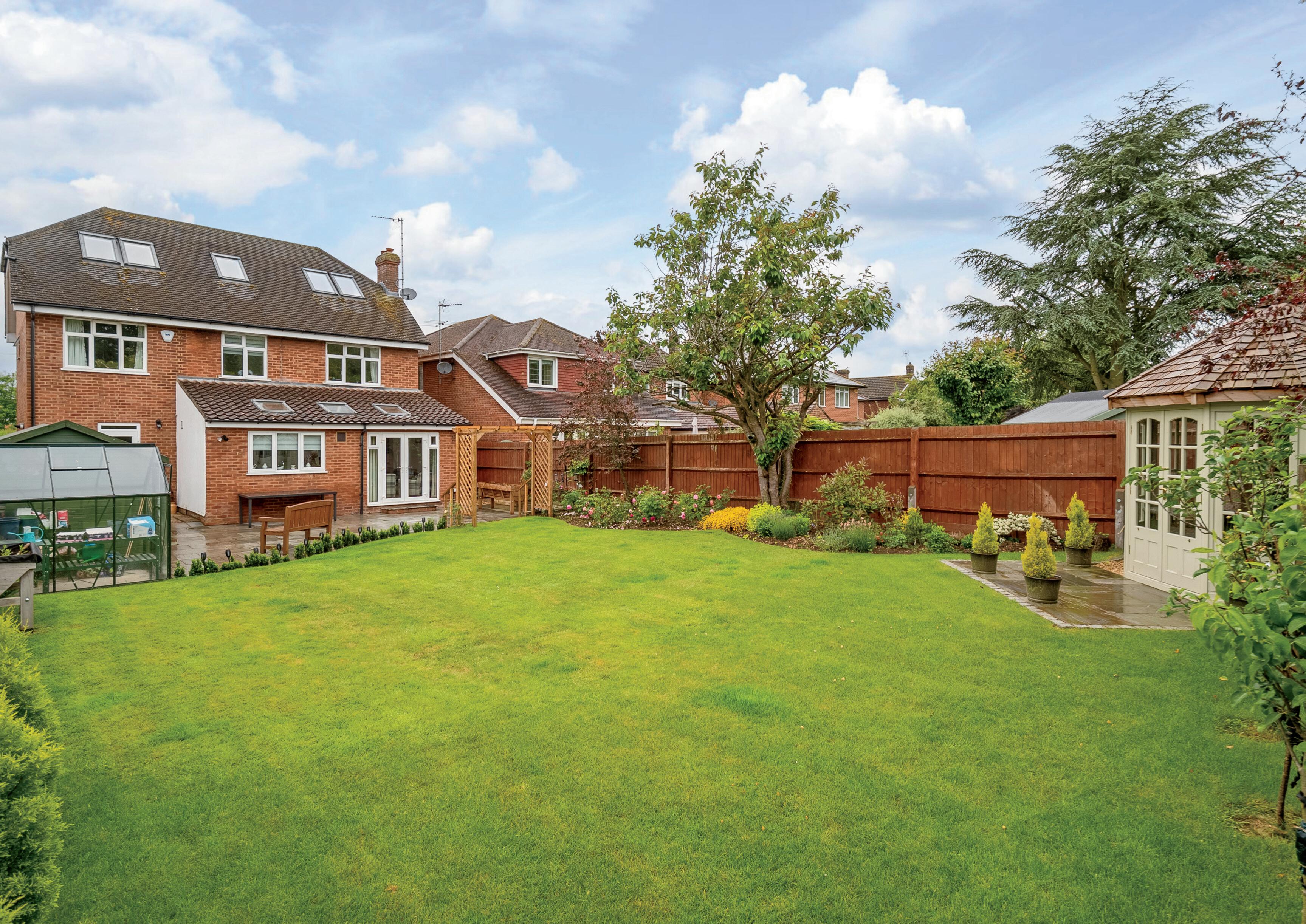 The immaculate South Facing rear garden is of a good size and has a large patio area, beautifully shaped lawn, a large storage shed, Summer house, and gate access to each side, whilst to the front, the large driveway provides off-road parking for around eight cars.
