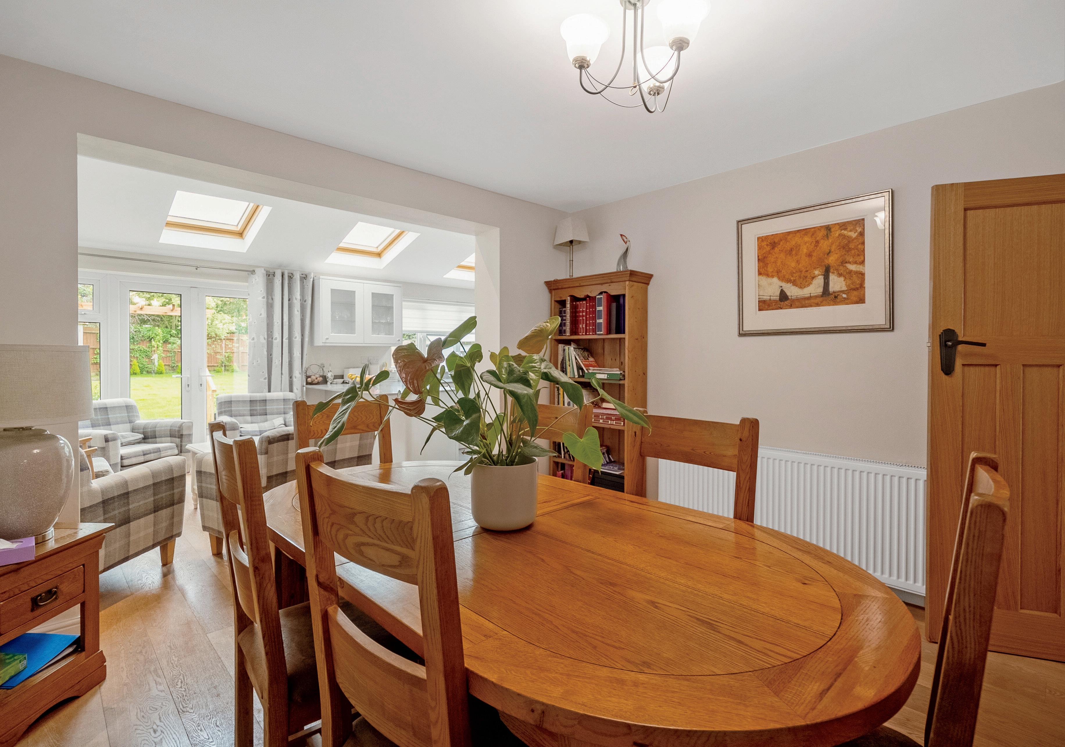From the seating area in the kitchen, direct access is provided to the dining room which has space for a table to seat eight guests.