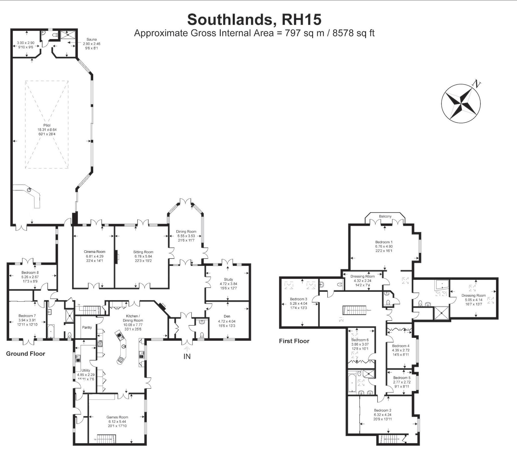 The architectural design of the home is both timeless and contemporary, featuring a harmonious blend of traditional brickwork and modern aesthetics. Upon entering, you are greeted by a grand and welcoming entrance hall that leads into the main living areas. The kitchen/dining/family room is a vast space with bespoke fitted kitchen units including a unique curved centre island. From the kitchen the double doors lead through to the games room providing further storage matching the kitchen and a feature glass staircase. There are five further reception rooms on this floor, including a living room, dining room, study, den and cinema room. Bedrooms 7 and 8 are located towards the rear of the house with a separate bathroom, this area could also provide an additional annexe or staff accommodation if required.