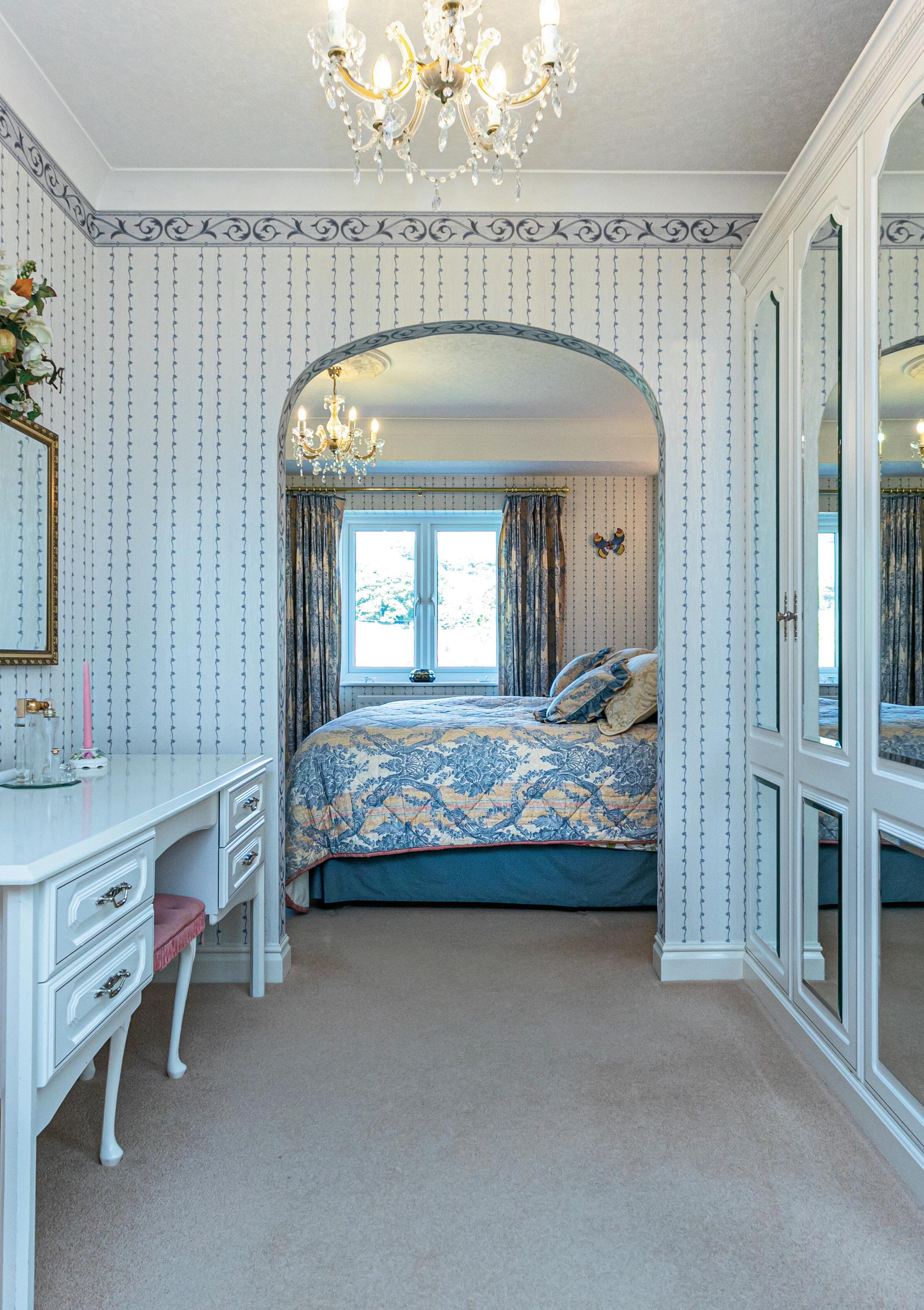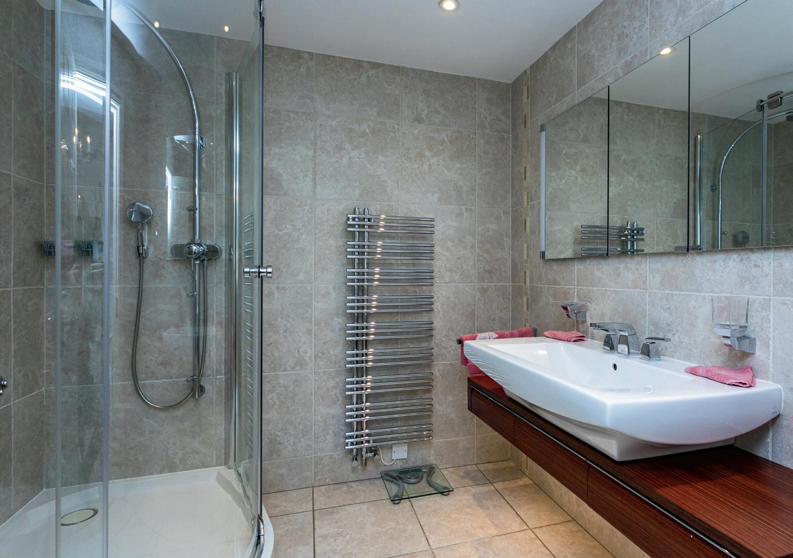 There are three double bedrooms and two shower rooms, one of which is ensuite. The main bedroom is a suite with a bedroom having a range of fitted furniture, a dressing area and an ensuite shower room. It’s an attractive contemporary installation with a large shower cubicle with Pharo fittings including a rainfall head, floating vanity unit and toilet. Fully tiled, it has underfloor heating and a designer chrome heated towel rail.