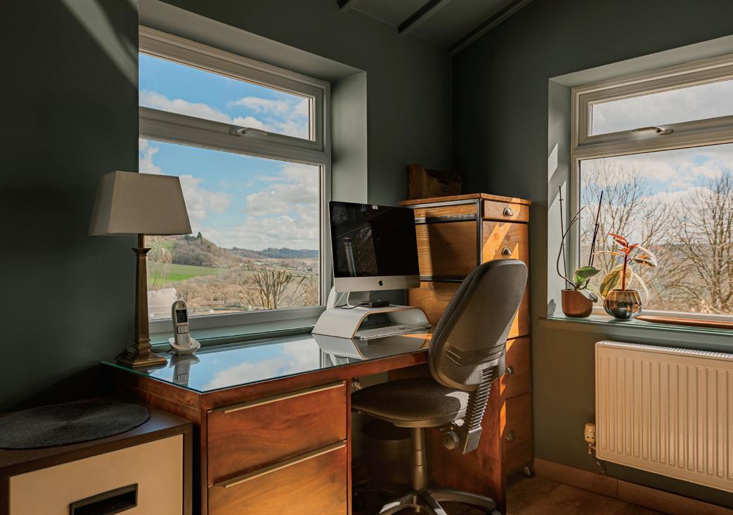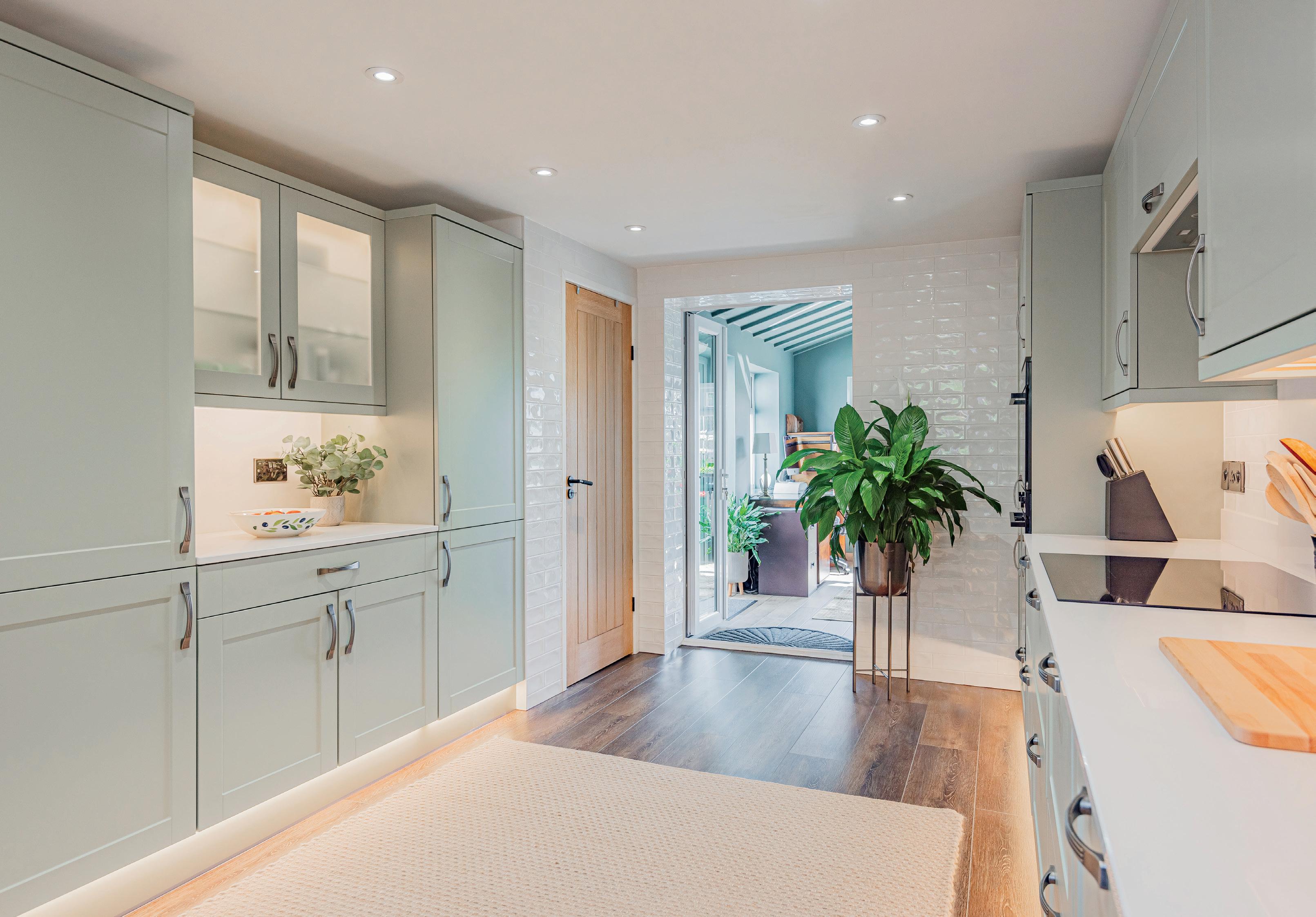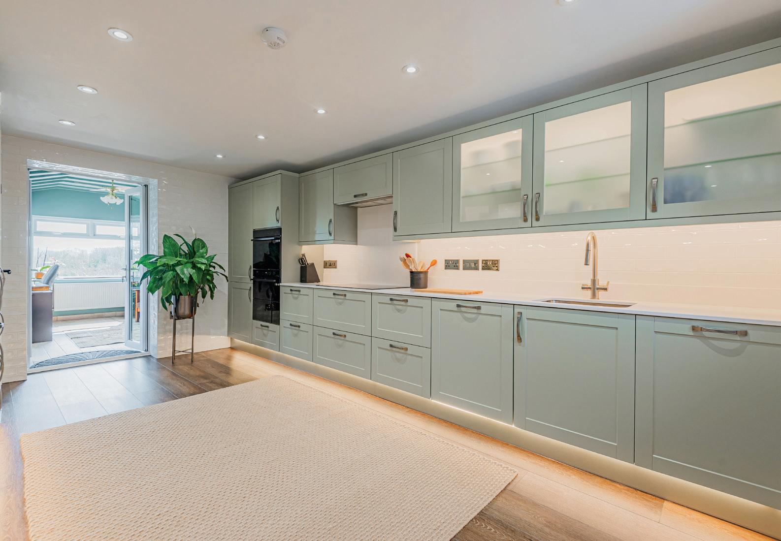 Entering the inviting hallway, you are greeted by wooden flooring and convenient storage cupboards seamlessly leading to the sleek modern kitchen. Equipped with ample storage including a pantry cupboard, it boasts integrated features such as a 4-1 instant hot filtered water tap, sink, drainer, hob, extractor, dishwasher, and fridge freezer. The adjacent garden room/snug offers versatile space, perfect for an office or additional living area, showcasing stunning views of the countryside and distant hills.