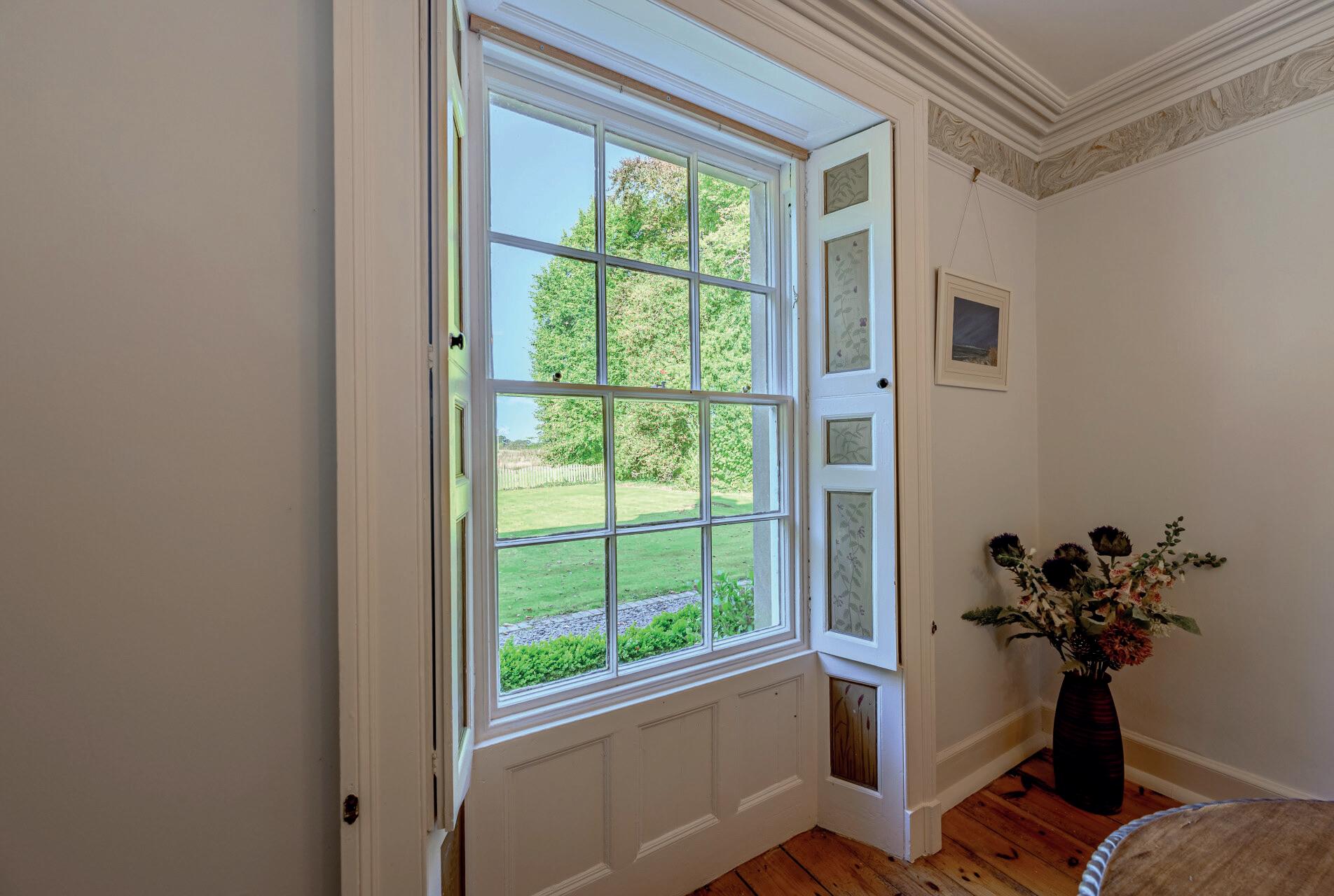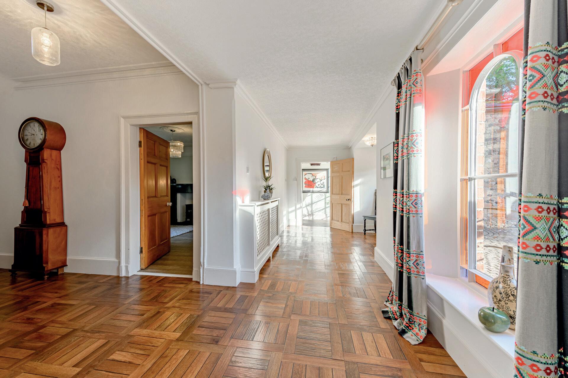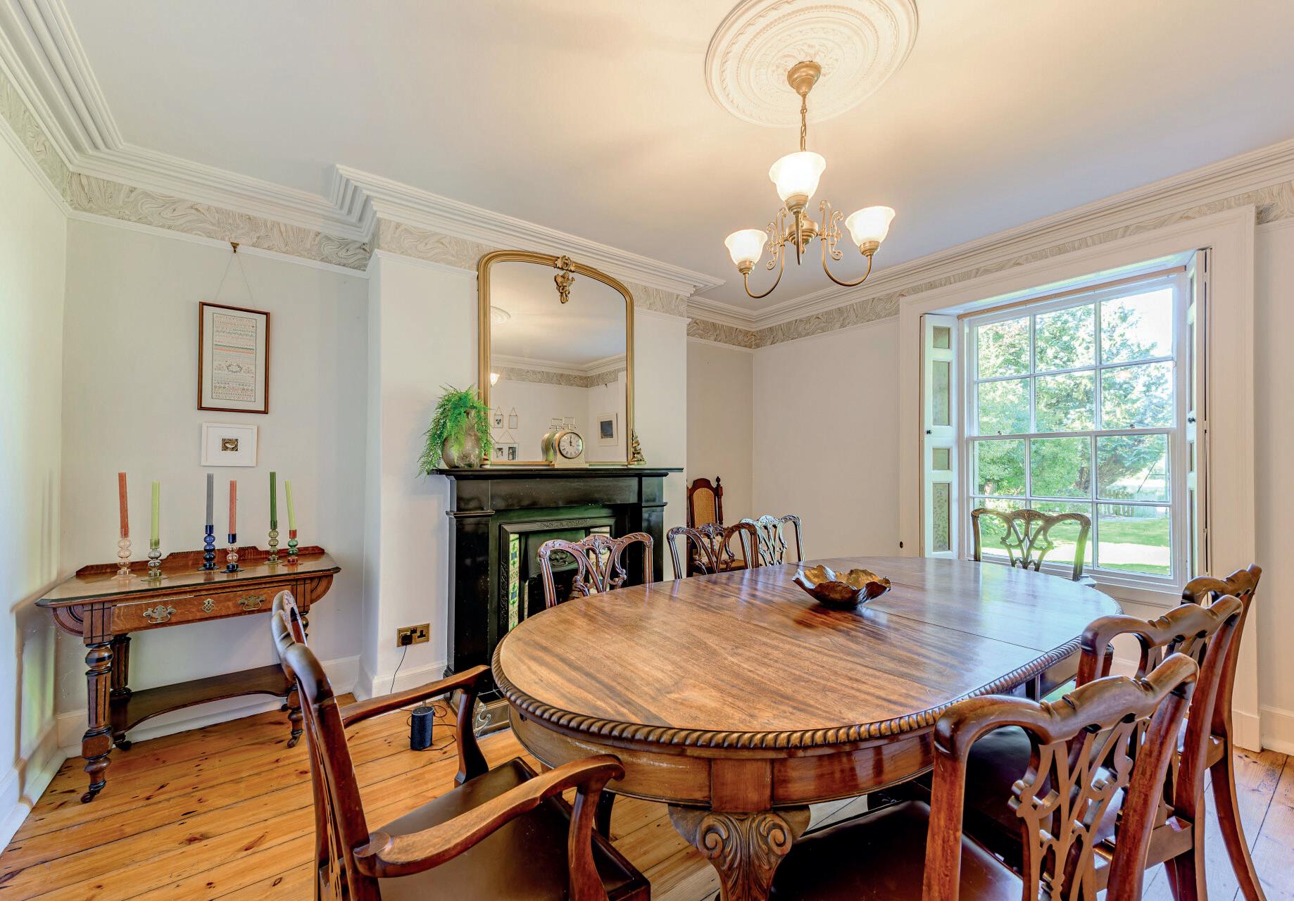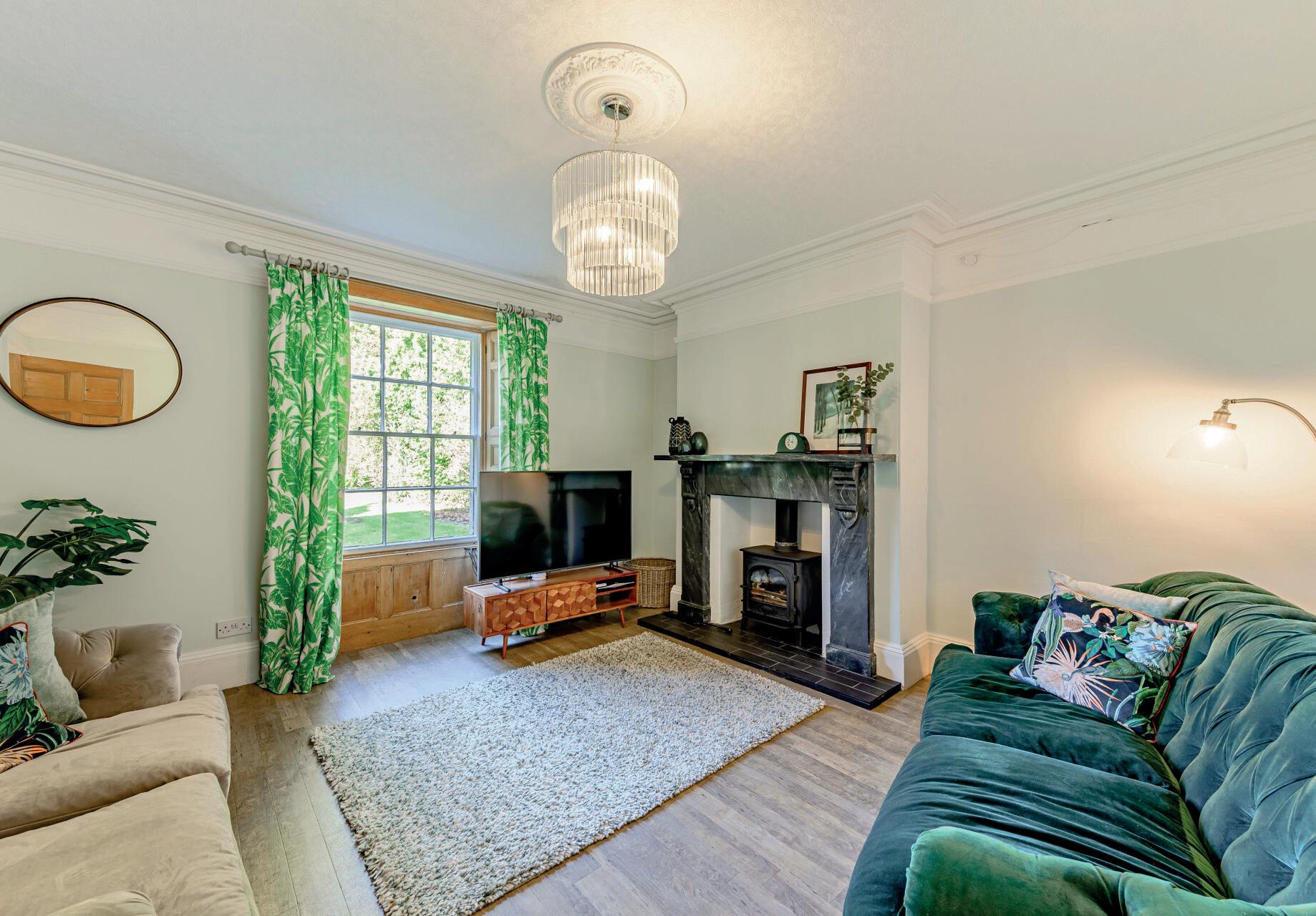 The formal dining room is a great space for entertaining. A large window floods the room with natural light as well as offering views onto the garden, tennis court and paddock beyond. Ornate ceiling details and a traditional fireplace give a real sense of grandeur to this room. After your meal, you can retire to the living room, directly across the hallway. A more moderns log burning stove has been fitted in this room and is surrounded by a beautiful marble fireplace surround.