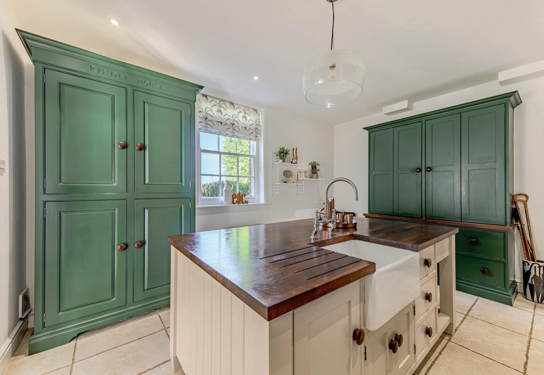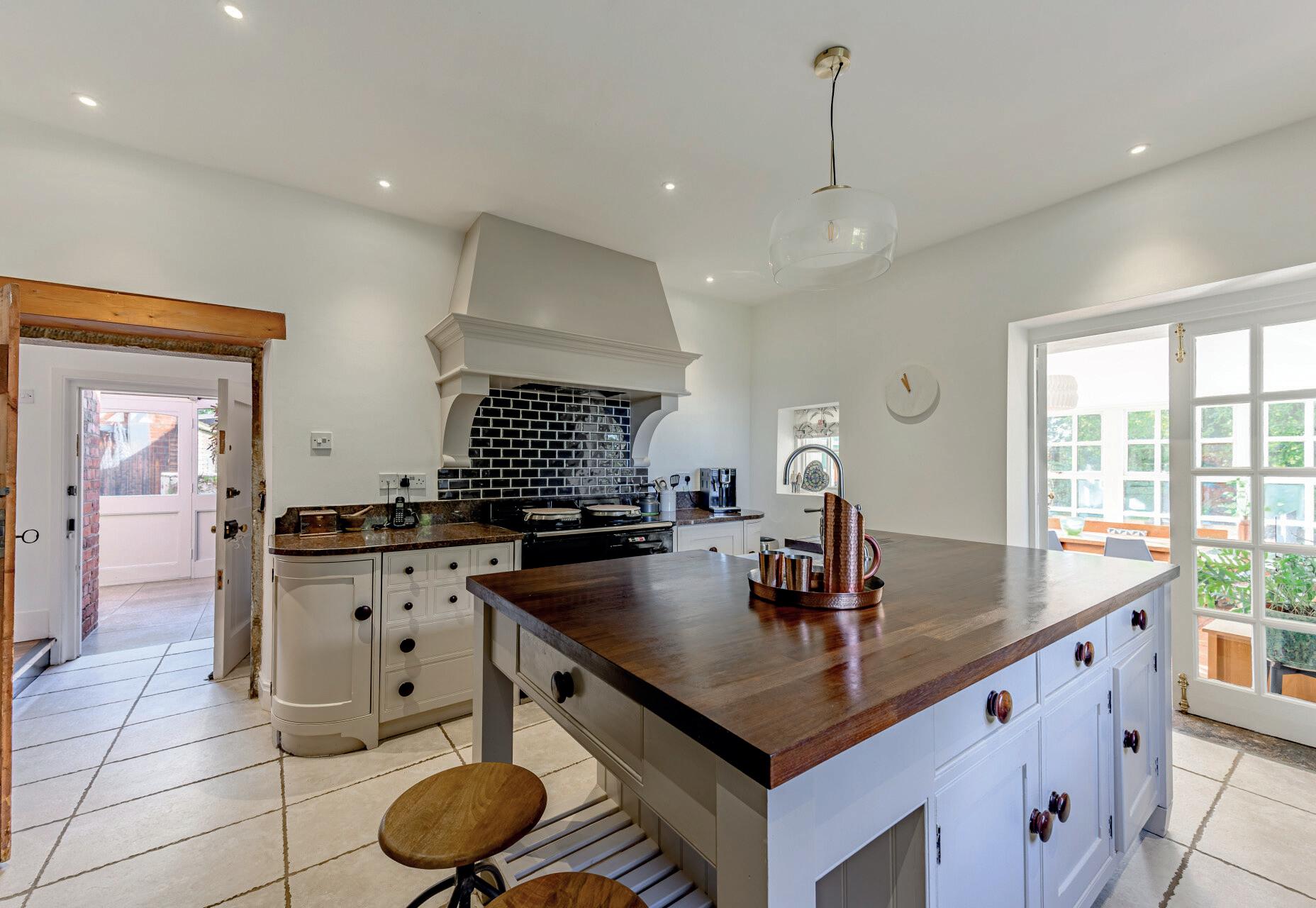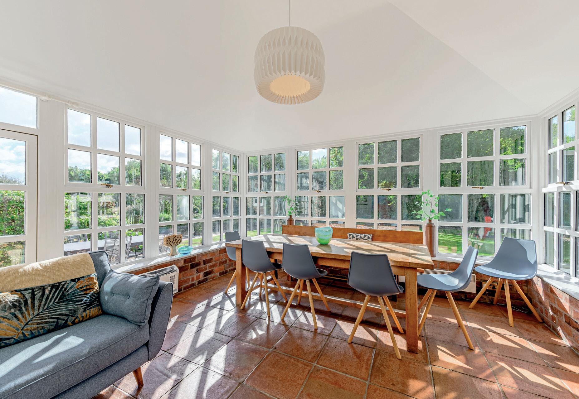 The kitchen is a beautiful example of a bespoke, traditionally styled, country kitchen. The solid wood, shaker style units where designed and installed by locally renowned company, Town & Country and benefit from high end accessories such as a large Belfast sink, Quartz and solid oak worktops and a gas Aga cooker with twin hobs and two ovens. Matching storage cupboards, painted in a contrasting colour, have been built to the external walls with the properties name scribed into the top to enhance the bespoke finish. The garden room sits to the side of the kitchen and is accessed via a set of double doors. This space makes a fantastic dining room or day room, offering a panoramic view of the gardens.