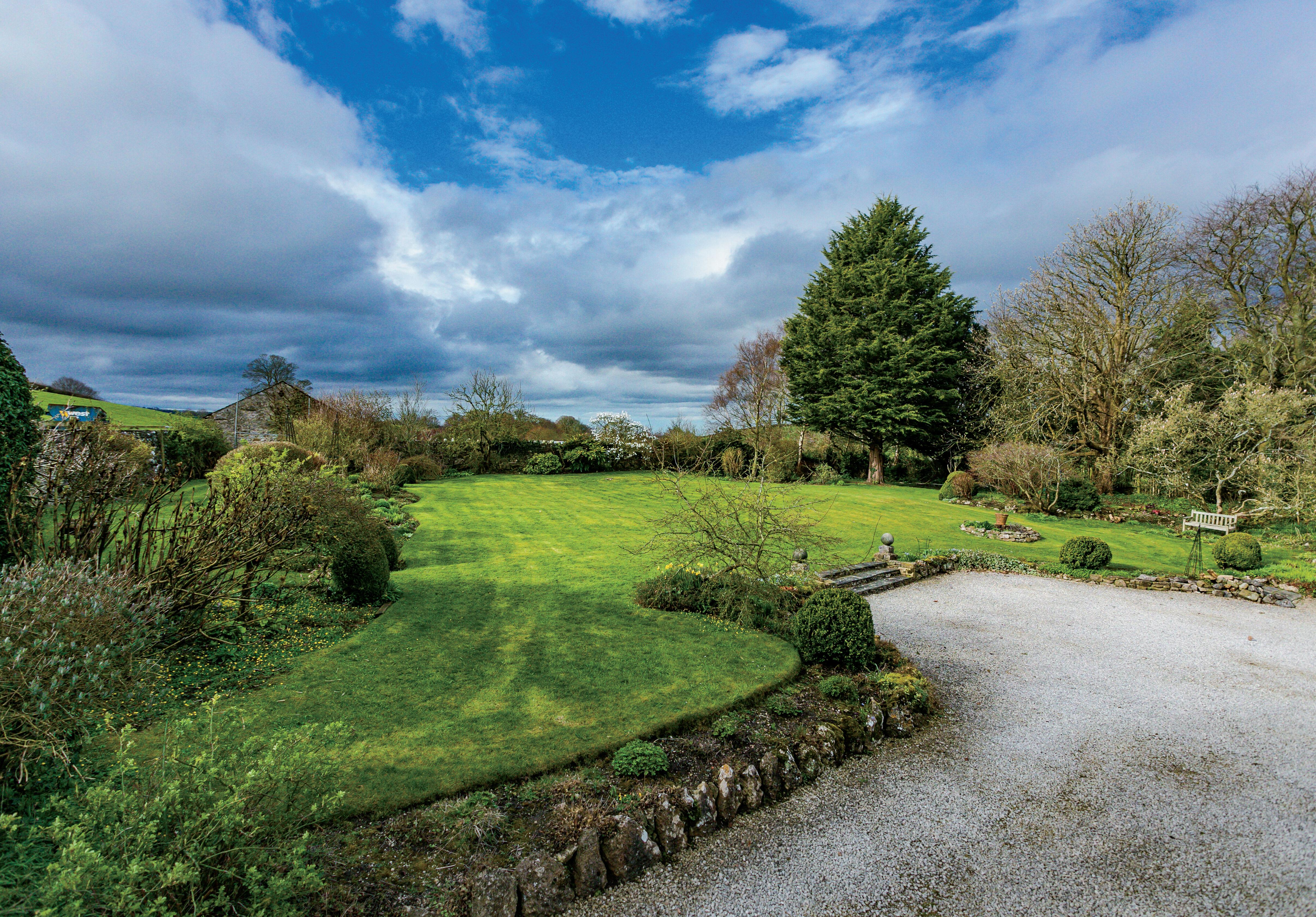 The garden is divided into ‘rooms’ forming distinct areas, separated by limestone edged paths, neatly clipped box hedges and well stocked borders. The garden offers great privacy by virtue of either high stone boundary walls or the bordering fields. Along walls climbing roses, wisteria and honeysuckle have been trained and make a colourful show in season. The garden on the whole is fairly level with a large lawn approached up a set of three steps with stone finials either side. Flowering shrubs punctuate the garden with camellias and magnolias starting the spring show leading through to roses and mature herbaceous borders in summer with stunning crab apple trees and colourful acers in Autumn. There are plenty of hellebores, daffodils, snowdrops and camassias for an early show of colour before the well established herbaceous borders come back to life.