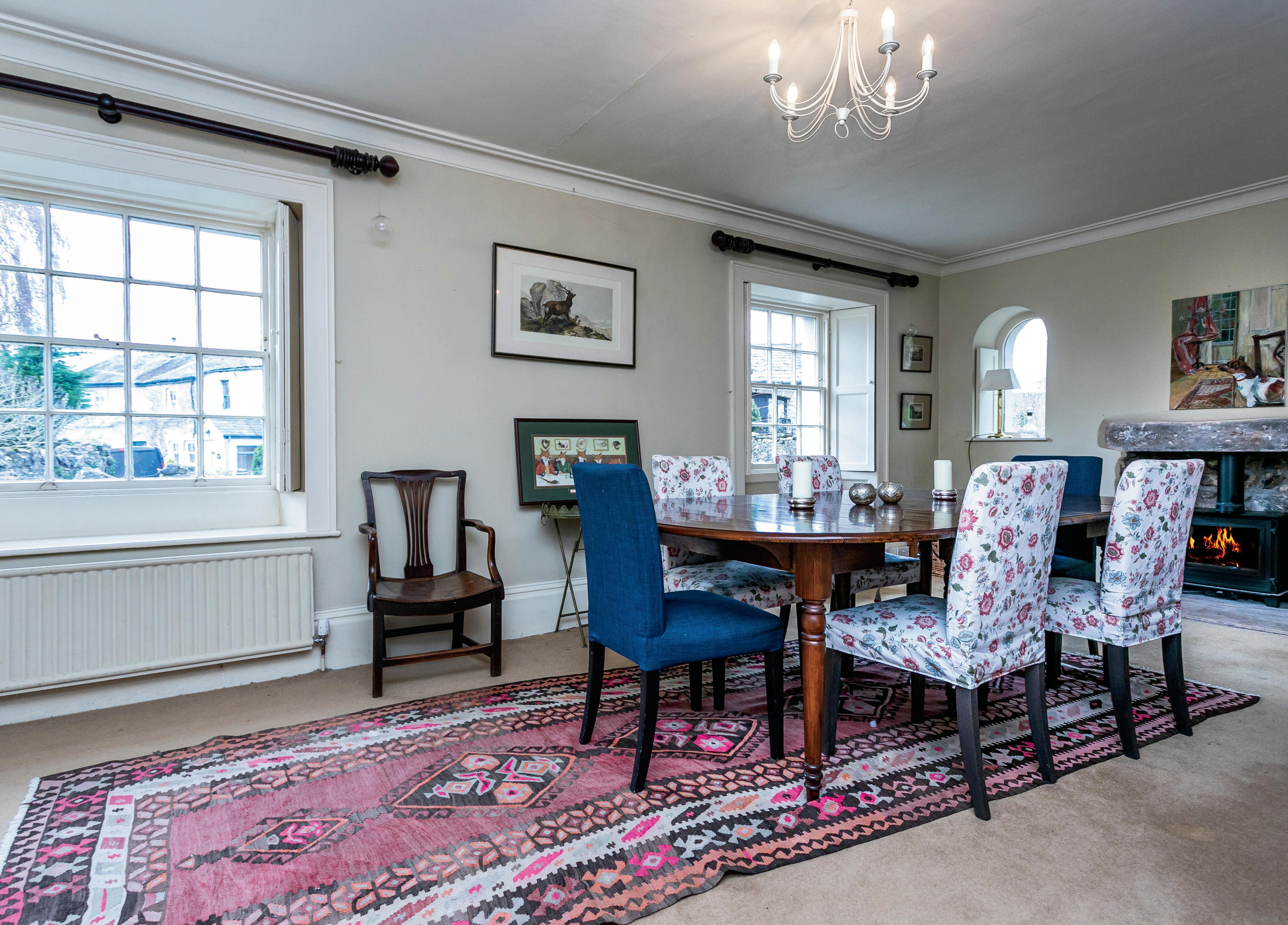 The atmospheric dining room is approached through double opening part glazed doors from the hall. There’s an informal fireplace with a lintel over a wood burning stove and small arched windows either side as well as windows looking out to the village. Generously proportioned, you’ll have space for a fair few around your table.