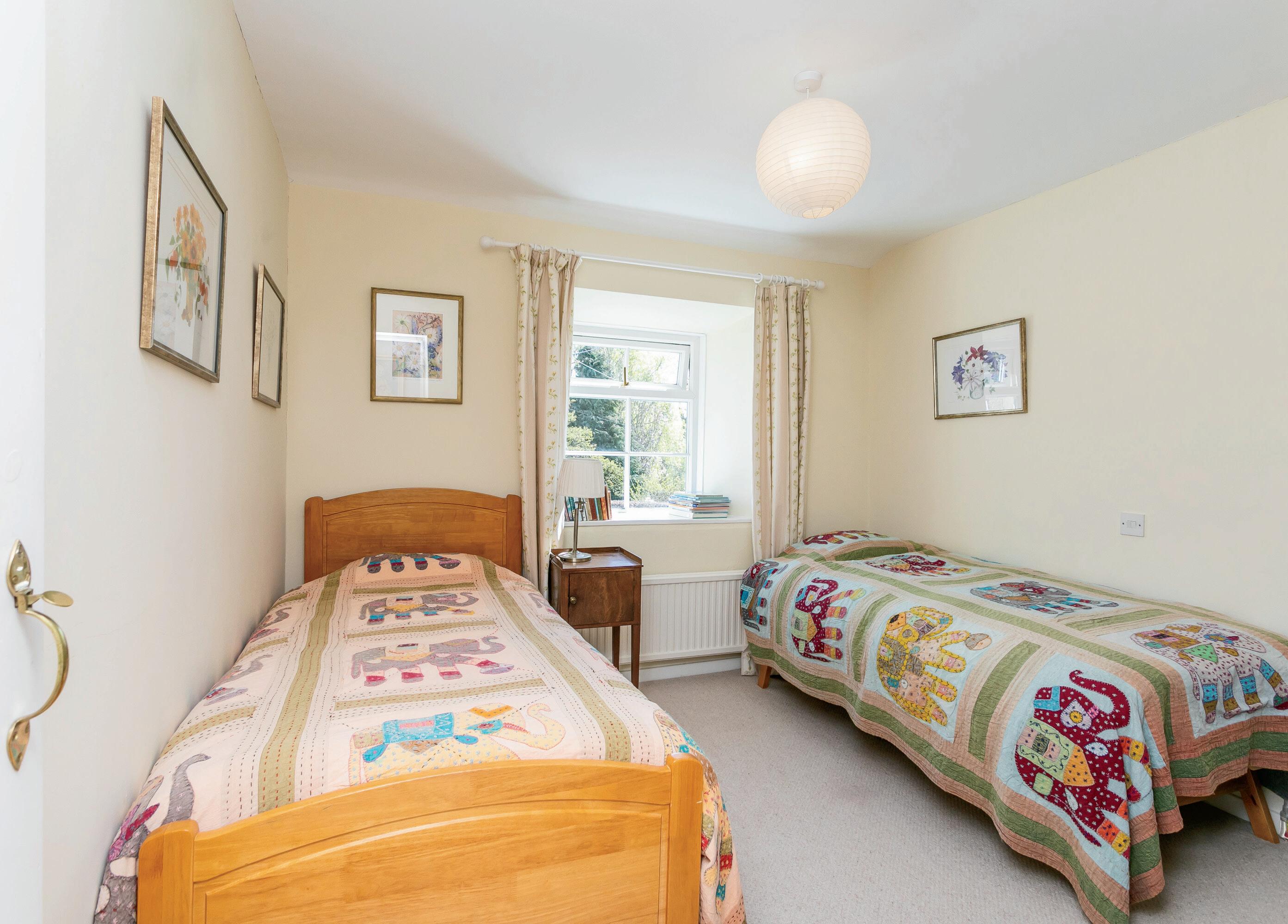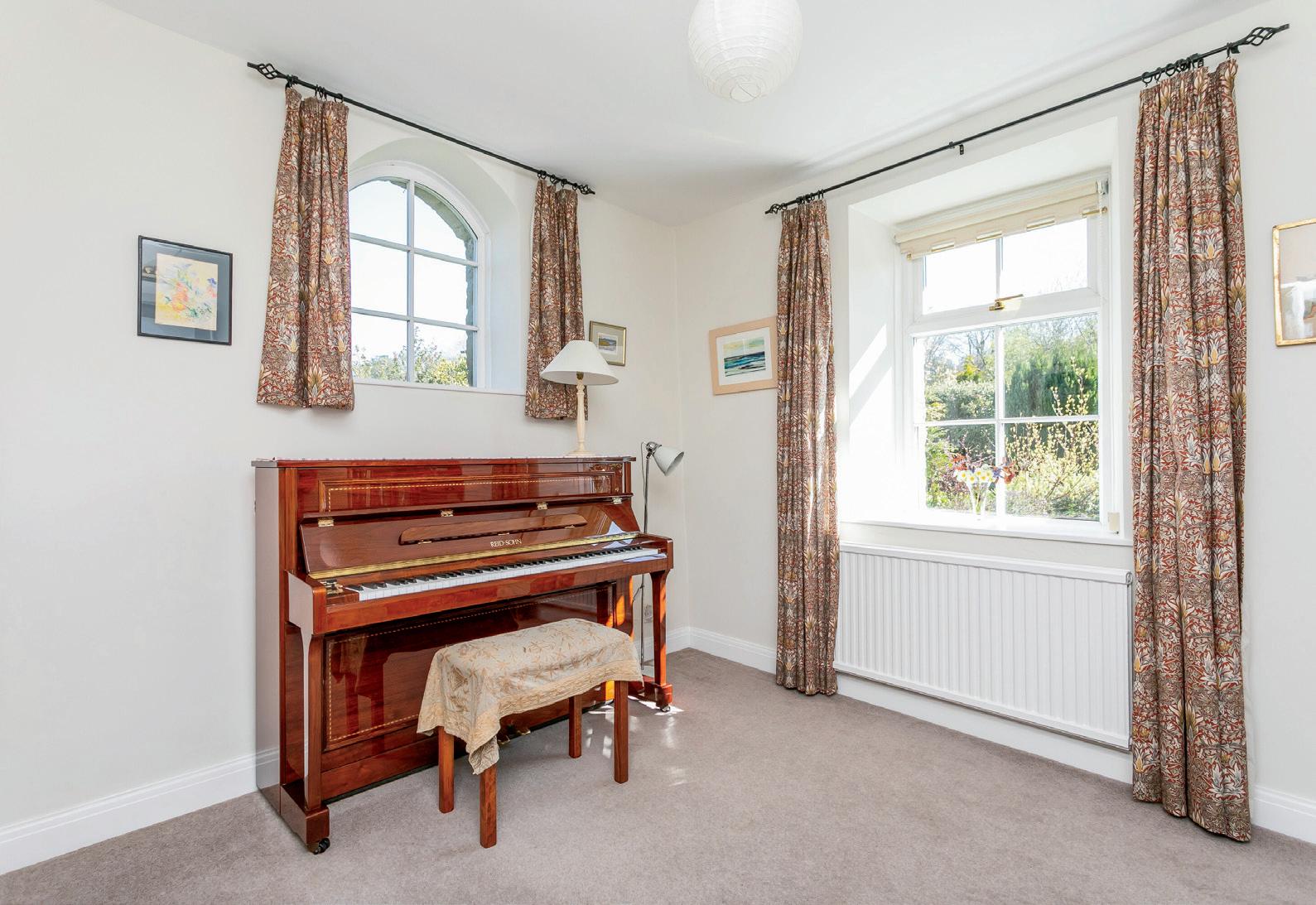 The music room has served many purposes over the years; hobbies room, study, even an overflow bedroom. There’s a wooden mantelpiece above an electric freestanding Dimplex stove and dual aspect, including a charming arched window on the gable end.