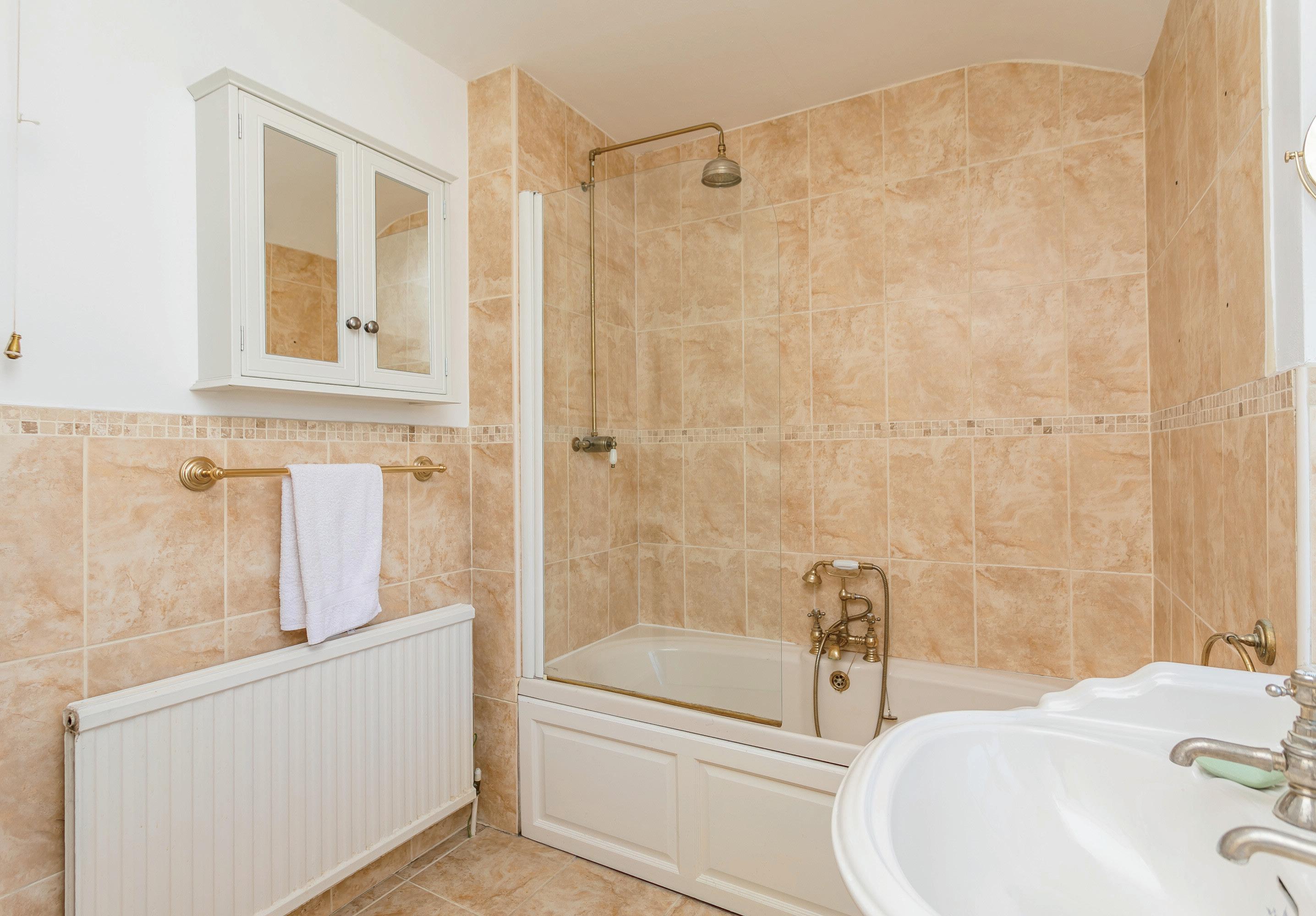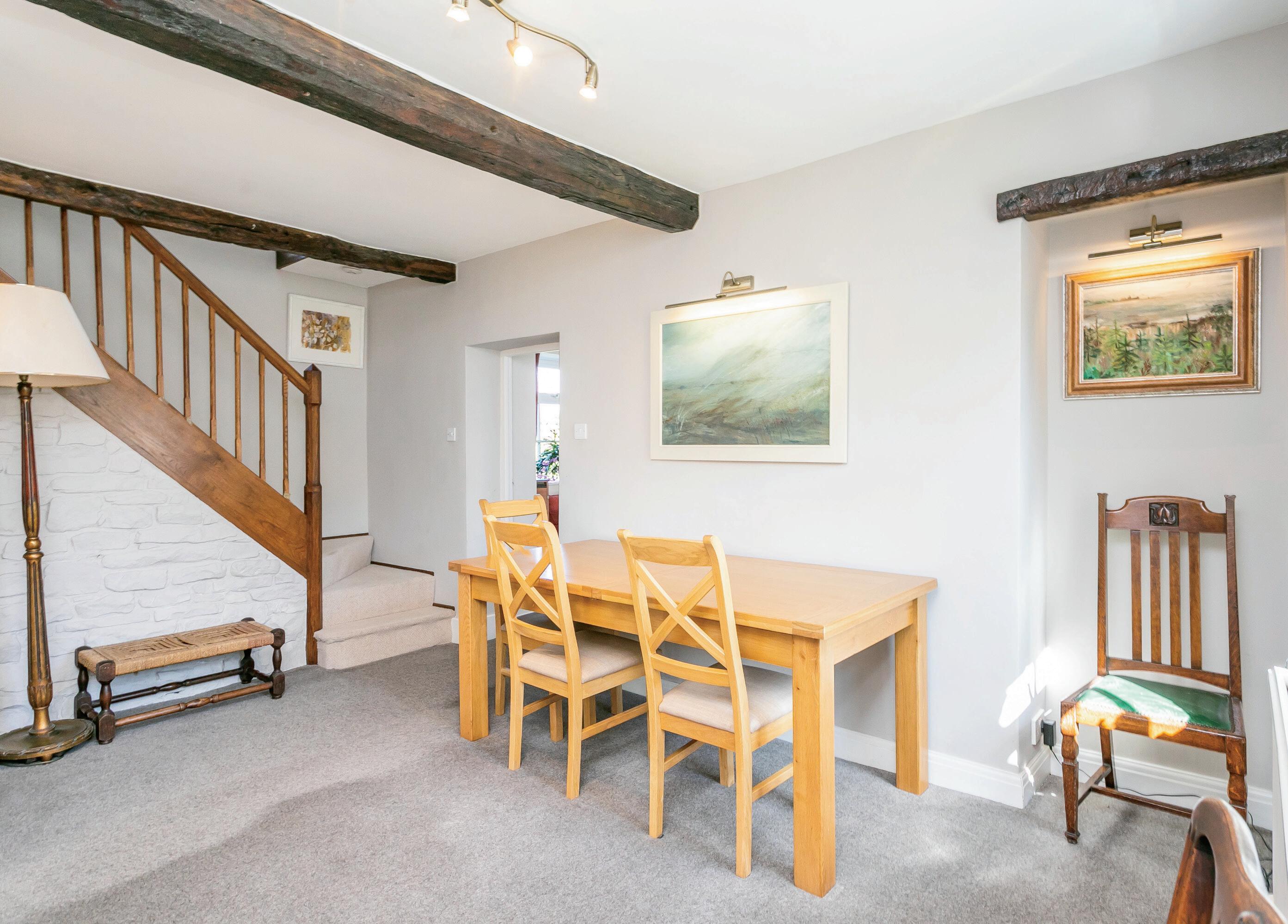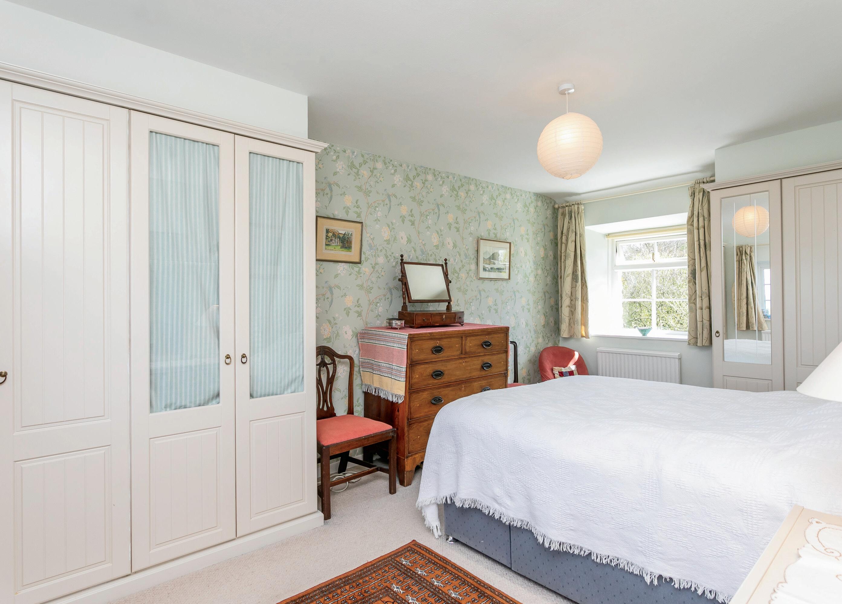 Stairs rise to the first floor with an attractive oak balustrade and a tall window. White painted boarded doors with wrought iron latches lead to each of the three bedrooms and bathroom. The main bedroom is light filled with windows to both the east and west. Great to wake up to those views over fields, the Lune Valley, Morecambe Bay and the Lake District hills. The second and third double bedrooms enjoy pleasant easterly views down the village lane and get the morning sun. The bathroom has a traditionally styled suite of bath with shower attachment, pedestal wash basin and loo with wooden seat and lid and a high level cistern.