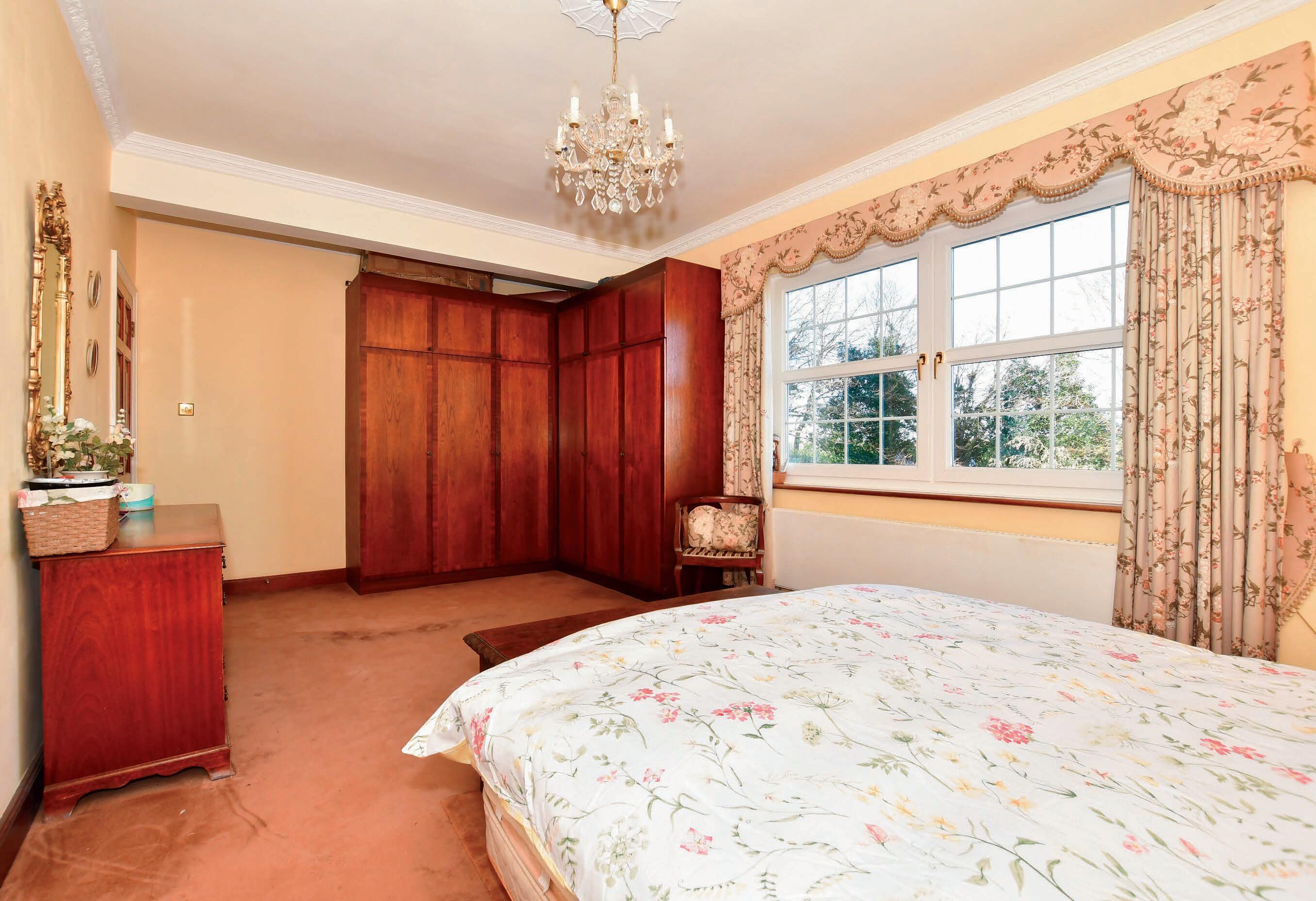 No expense has been spared and no detail overlooked in the creation of this extremely impressive Georgian style residence, built for the current owner in 1980. Nestling in the midst of a 0.4132 of an acre plot with development potential and surrounded by large mature trees and lawns it is approached via a long gravel driveway that leads to the double garage and the front porch with Palladian style pillars. It is at this stage that you can really begin to appreciate the external appeal of this lovely house with its bay window, symmetrical upper floor multi-pane windows, original Kent peg tiled roof and a high chimney stack. The beautiful double mahogany front door will make you impatient to see what lies beyond and you won’t be disappointed.