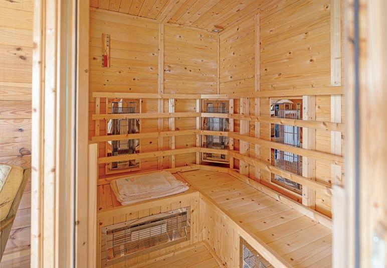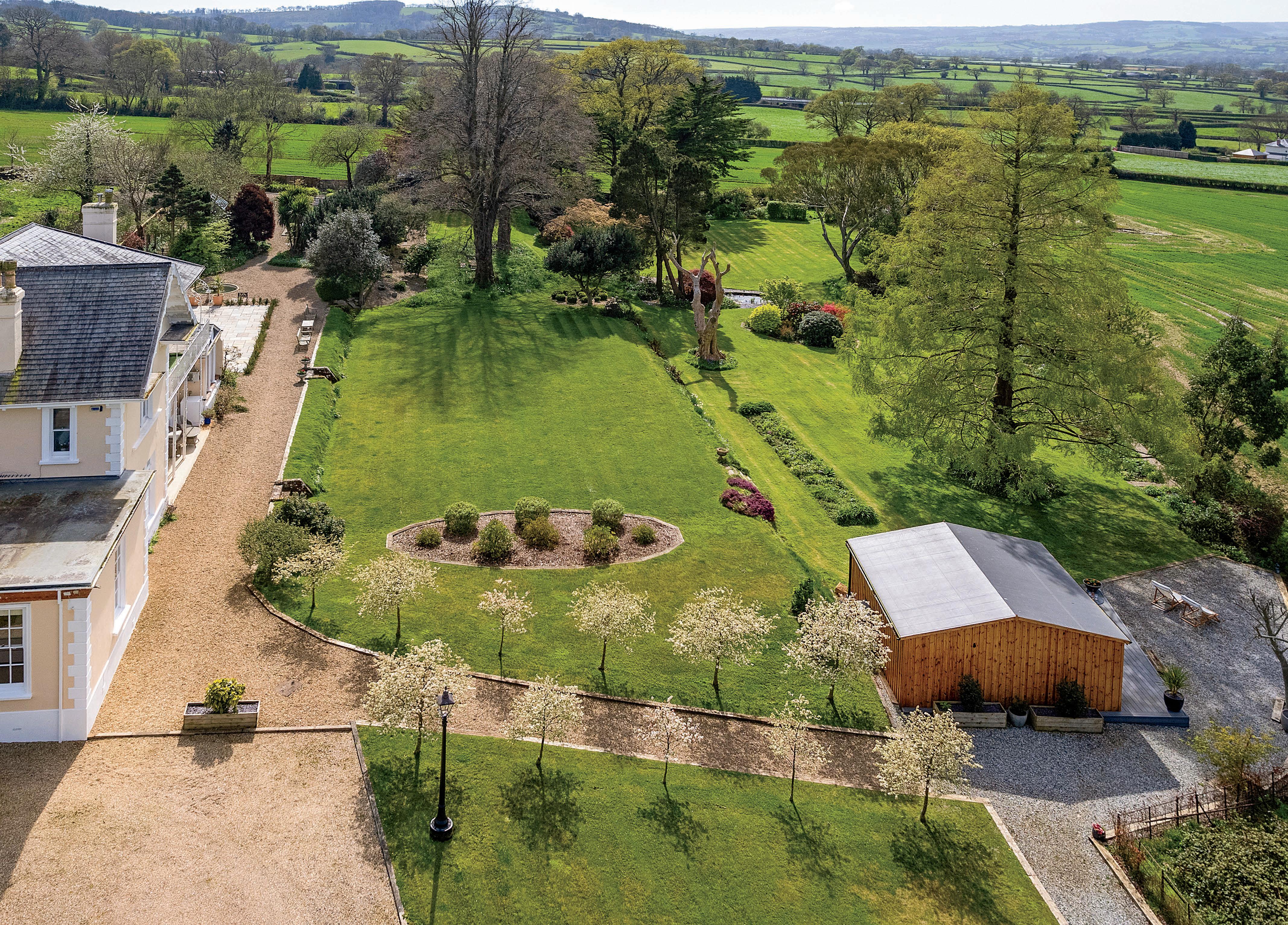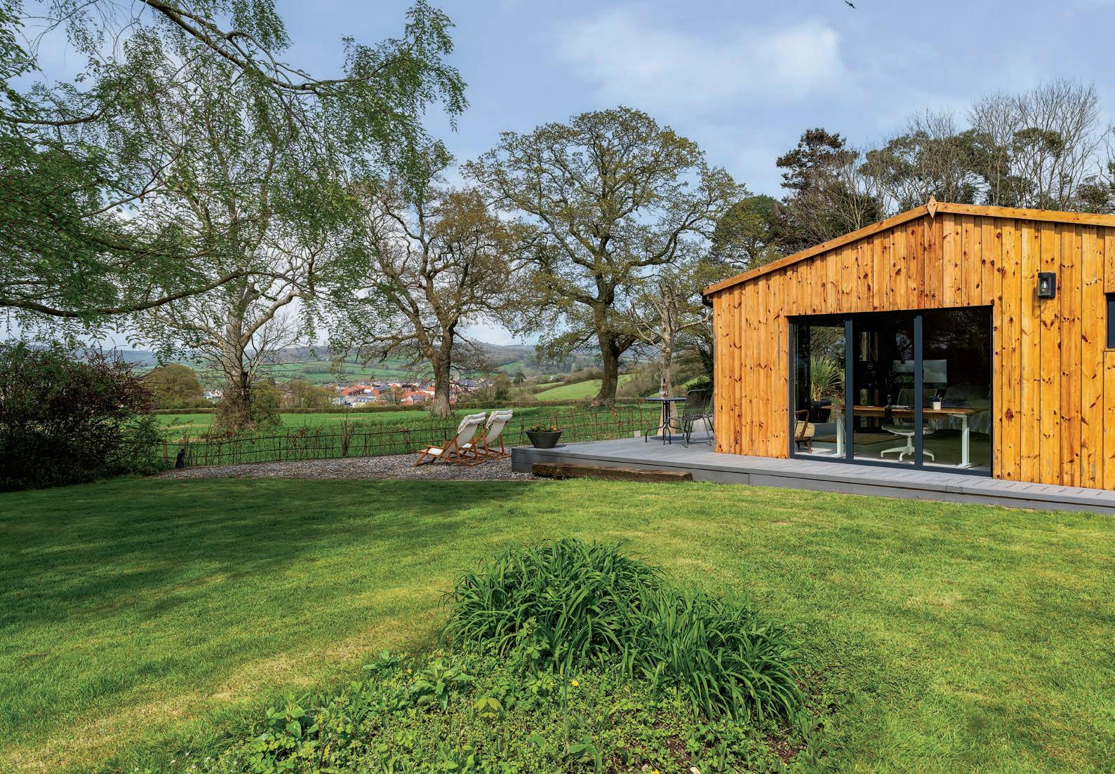 Garden lodge – Situated a few strides from the main house is the garden lodge, nestled in the lower lawns with full height windows and a decked terrace to enjoy the views of the rolling hills and sunsets. A spacious, self-contained, fully insulated spruce wood log cabin provides a flexible space, with an office/bedroom, a shower room with toilet, a small kitchenette, and an indulgent infa-red sauna where you can relax away your stresses and aches whilst feeling close to nature.