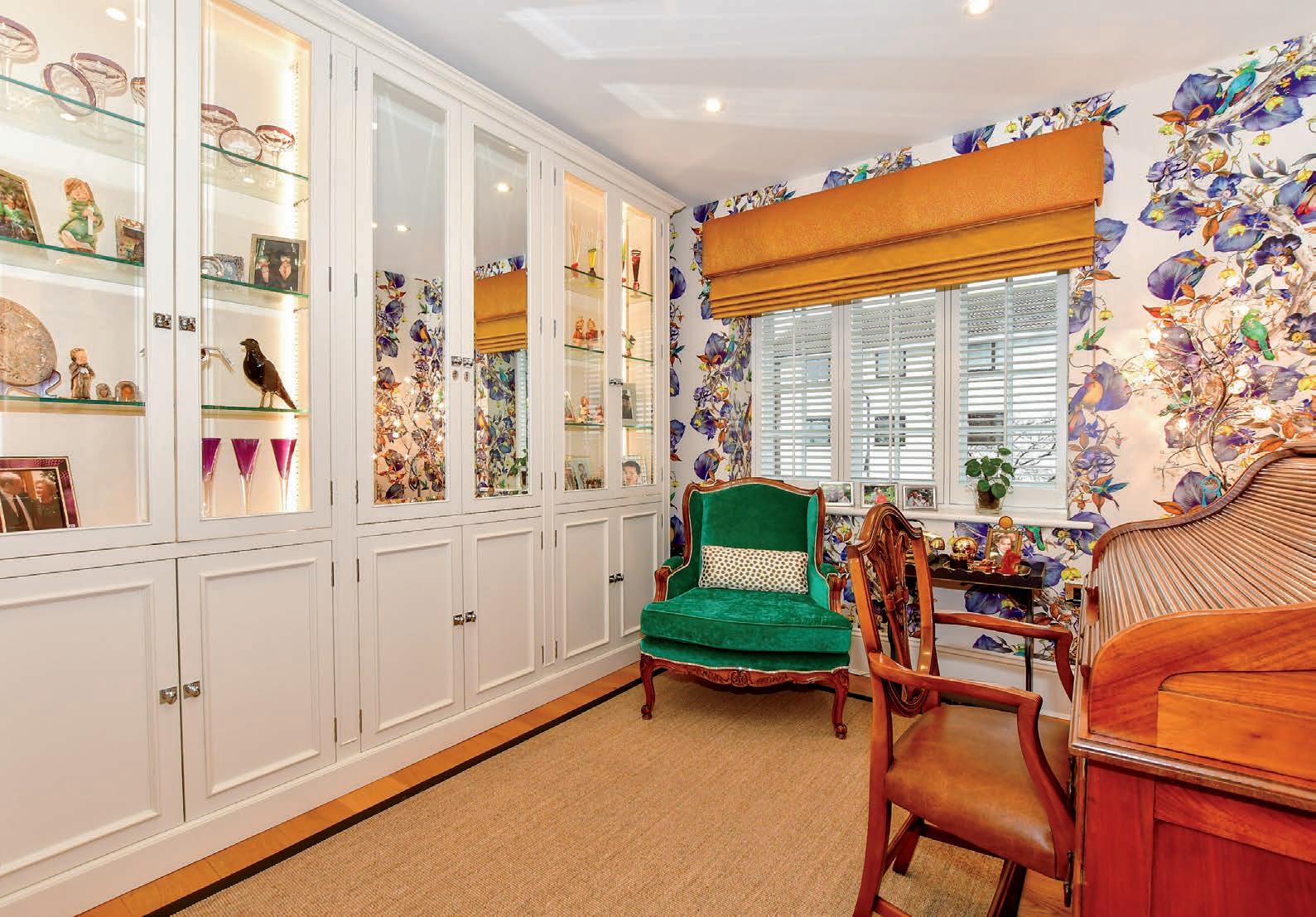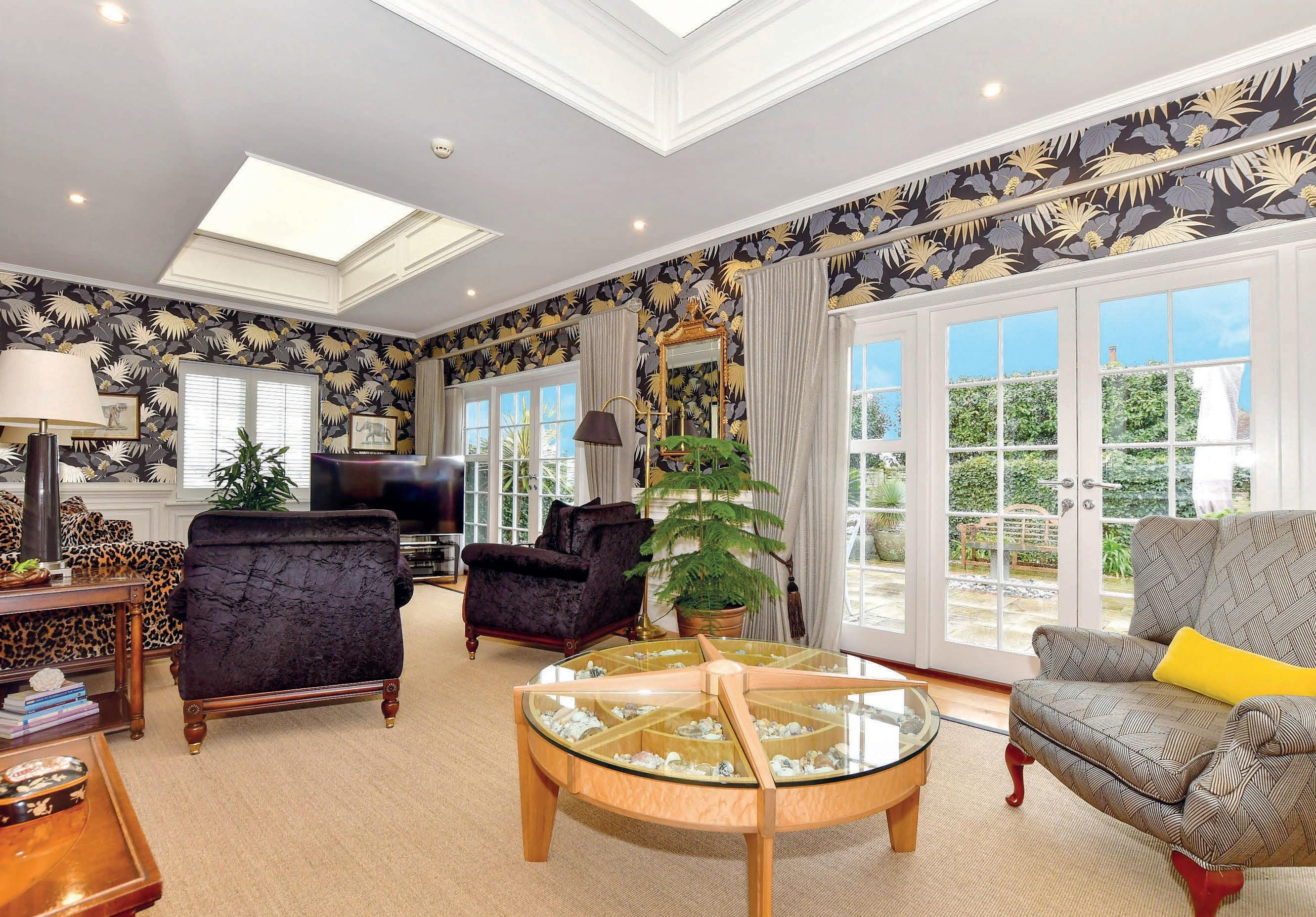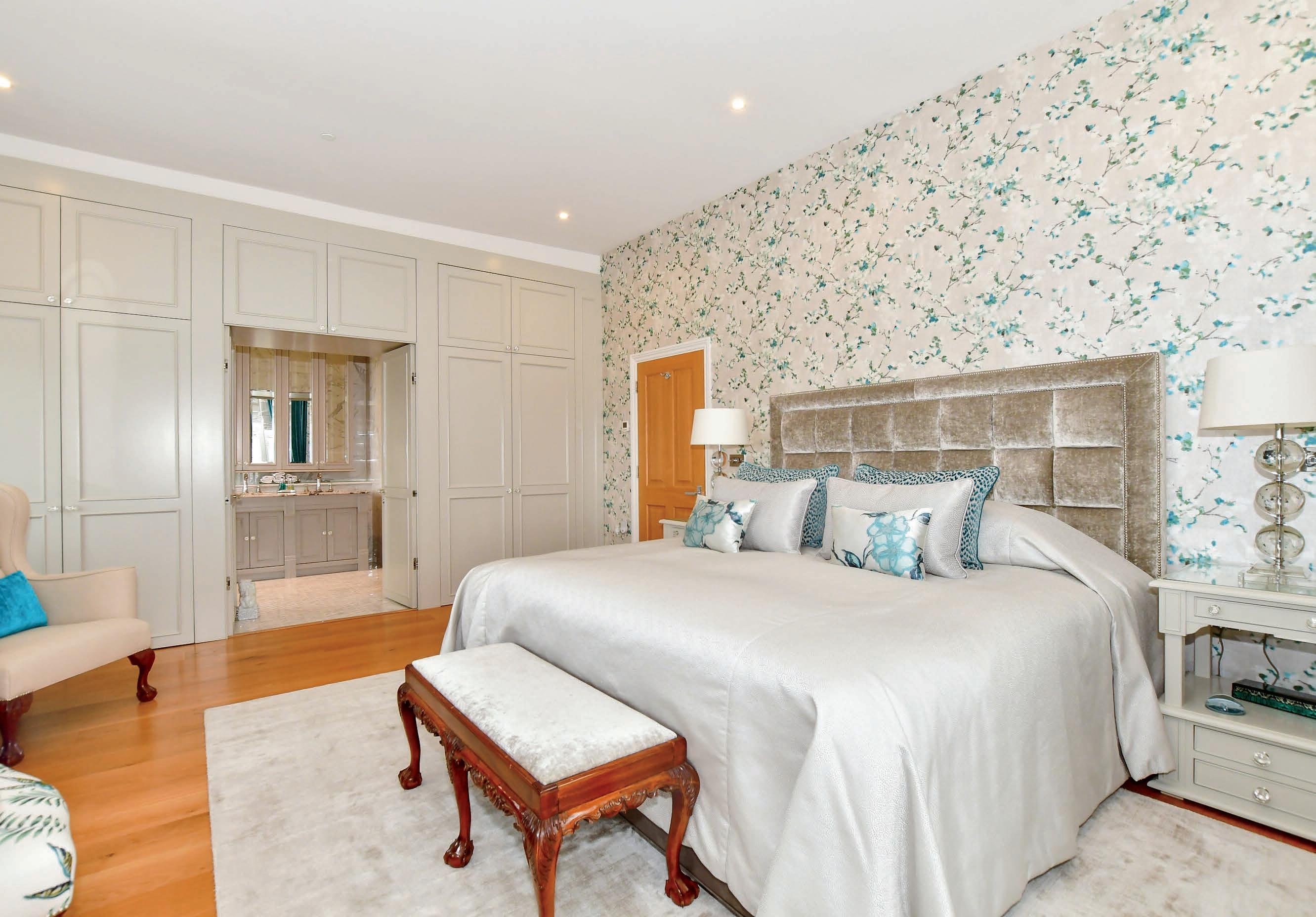 Guests will be delighted to partake of a meal in the attractive formal dining room with its coved ceiling, wall of beautiful glass cabinets, a frameless fire and engineered oak flooring that continues throughout much of the property including into the very attractive study with fitted cupboards and shelving. There is also a large and very light and bright dual aspect south facing garden room with dramatic wall covering, two sets of French doors and full height windows to the upper terrace as well as two large atrium style skylights with automatic blinds, half height wall panelling with ornate dado rails and a wide built in glass topped cabinet. There is also a fitted utility room with Miele laundry facilities, the plant room with controls for all the technical systems and a walk-in wet/room shower that has an external door as well as the exotic and luxurious black and gold downstairs cloakroom that everyone will definitely want to visit. It includes a vanity unit in Black Fusion granite, gold shell style tiling, a full width back mirror, glossy black sanitaryware and accessories designed by Samuel Heath.