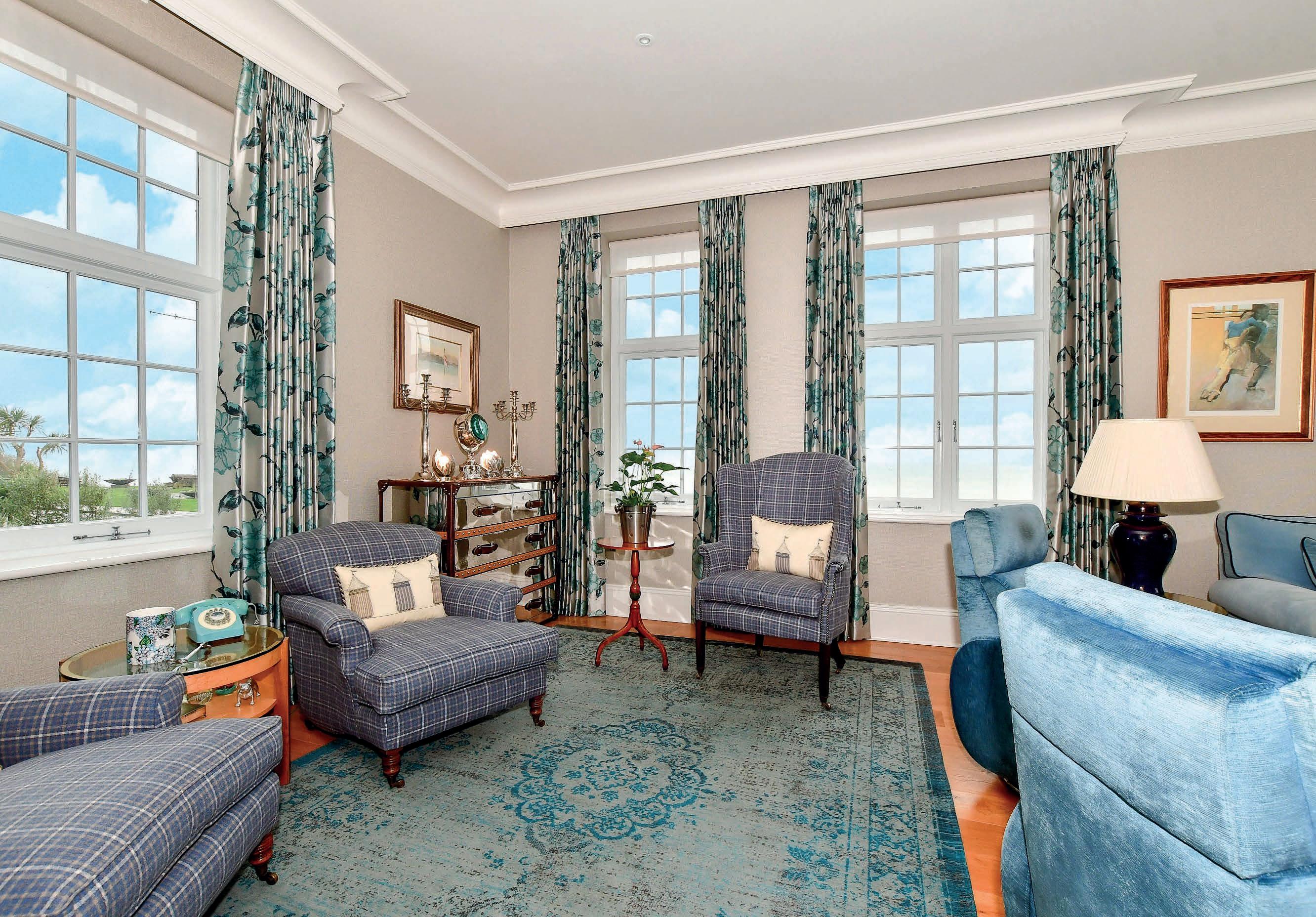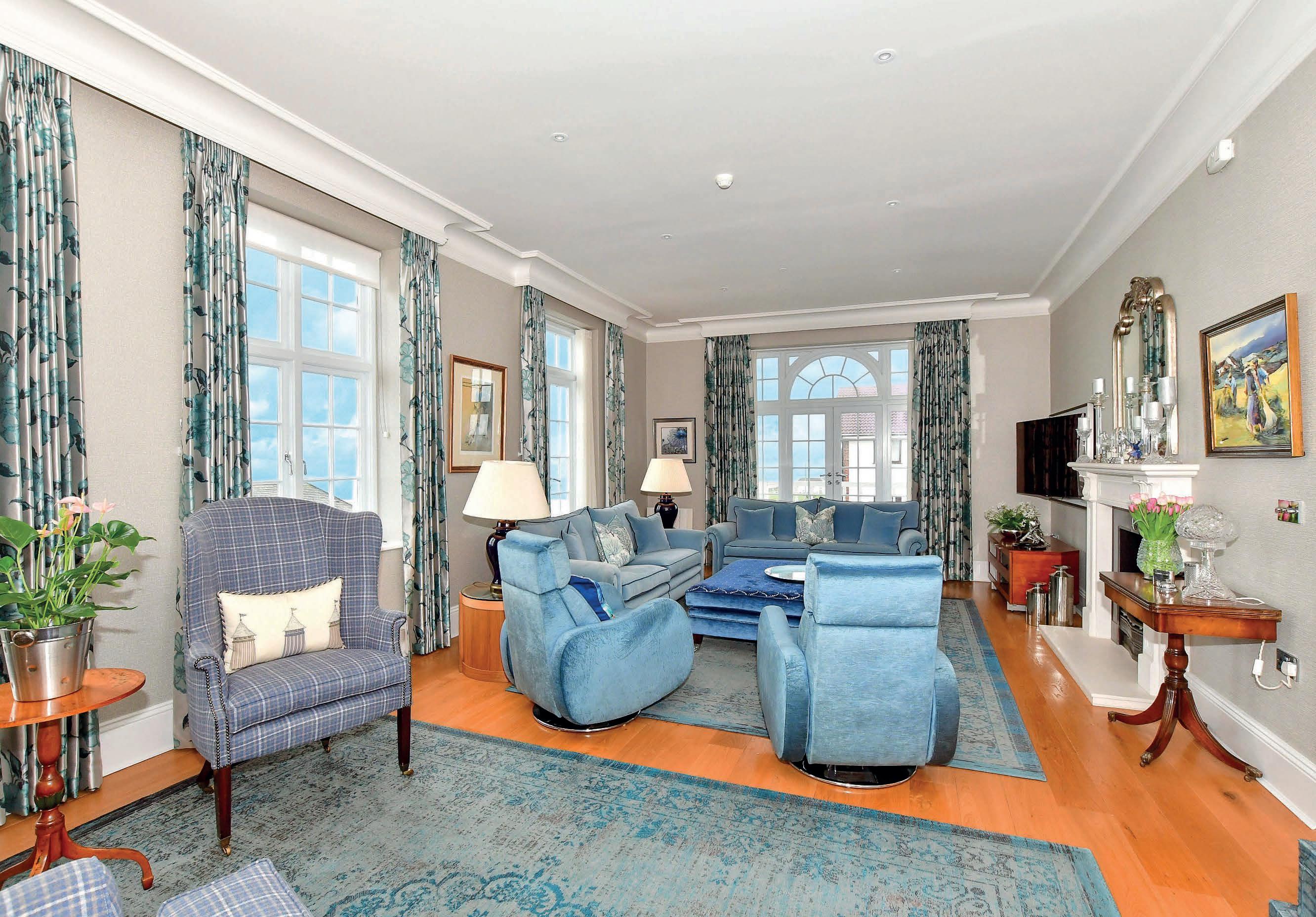 There is a large galleried landing on the first floor and, in order to take full advantage of the panoramic vista, it opens to the impressive sitting room. Not only is this room triple aspect but also has a balcony that wraps around the outside of half the room and is accessed through two sets of French doors with full height side windows. This lovely room also has sculptured coving and a charming fireplace with an excellent flame effect coal gas fire. Friends and family will never want to leave when they are introduced to the beautiful dual aspect second bedroom that includes French doors to a separate balcony providing long range views, an enclosed television cupboard and a wall of wardrobes with concealed doors to the stunning en suite bathroom. This has a Fired Earth stand-alone bath, two vanity basins with storage cupboards and marble tops and a walk in shower. All sanitaryware and accessories from Villeroy and Boch, Grohe and Samuel Heath. Also on this floor is a lovely large office or additional bedroom with a charming bay window looking out to sea.
