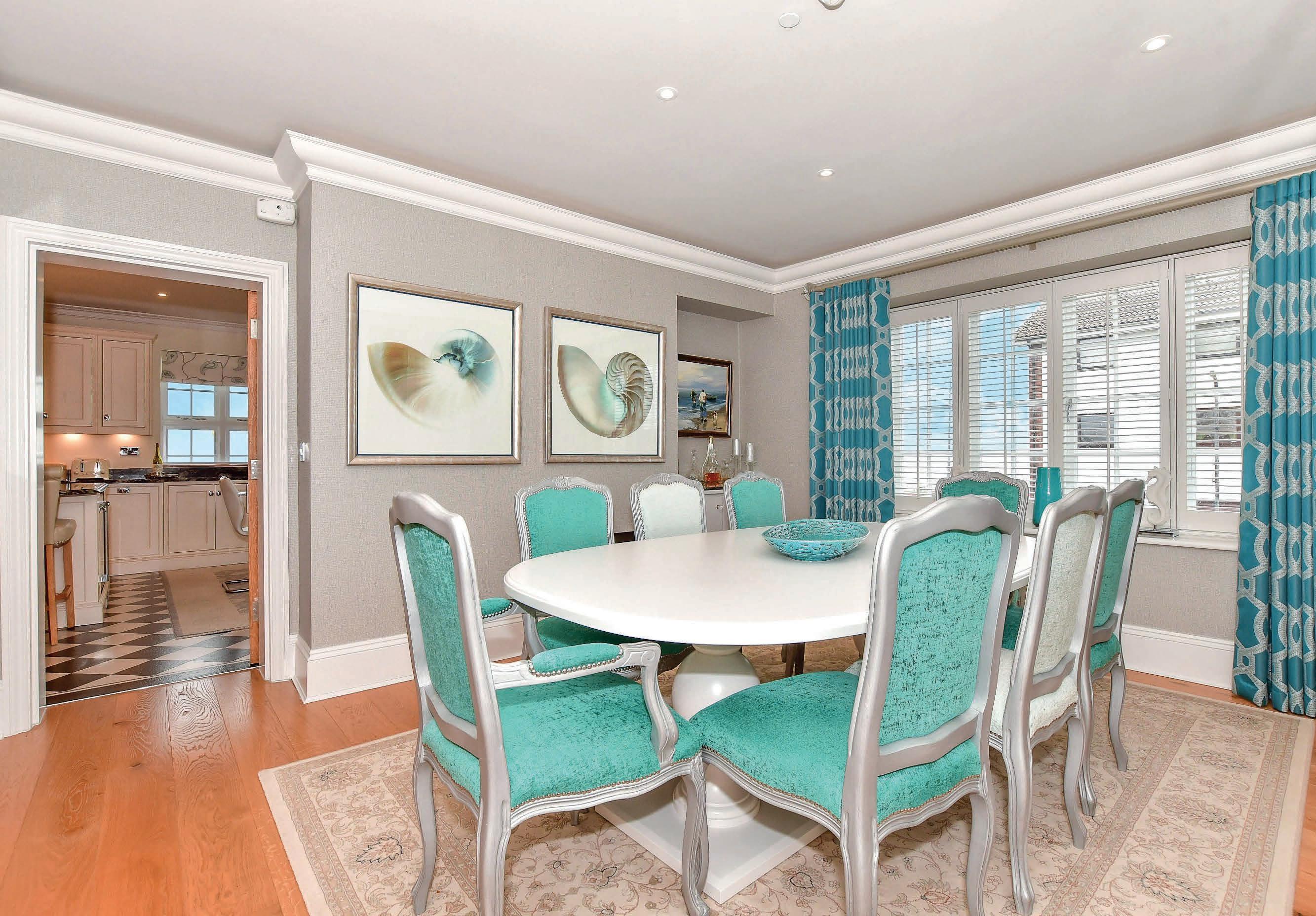 The black and white flooring continues into the wonderful dual aspect kitchen/breakfast room that offers delightful sea views. The bespoke kitchen was designed by Roma Interiors and includes a dual control Aga as well as pale cream Shaker style units with black granite worktops housing a Neff induction hob, slide and hide oven and warming drawer, a Liebherr double fridge and separate double freezer with an ice maker, a Miele dishwasher, a double bowl sink and Franke tap and a large central island with a built in fridge and wine cooler. There is a convenient door to the dining room and plenty of space for a table and chairs where you can sit and admire the view while enjoying your breakfast.