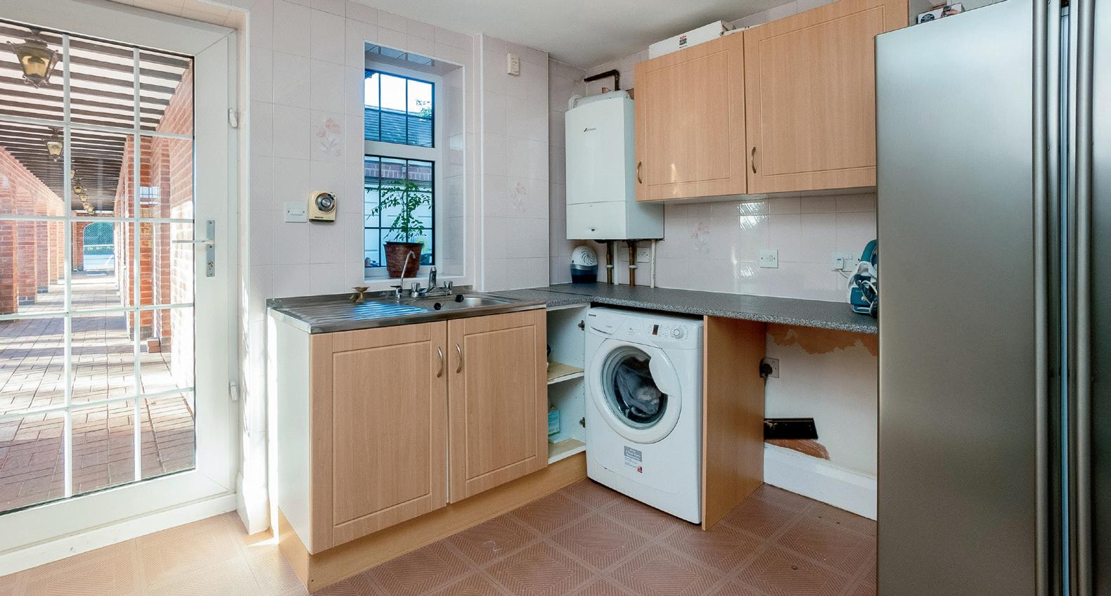 Into the Utility with its tiles to floor and walls, cupboards above and underneath, space for further appliances, plumbing for washing machine, the boiler, sink and drainer with mixer taps, double glazed Georgian window to rear overlooking the rear garden and Outdoor Complex, and double glazed Georgian door which opens onto the patio and Outdoor Complex.