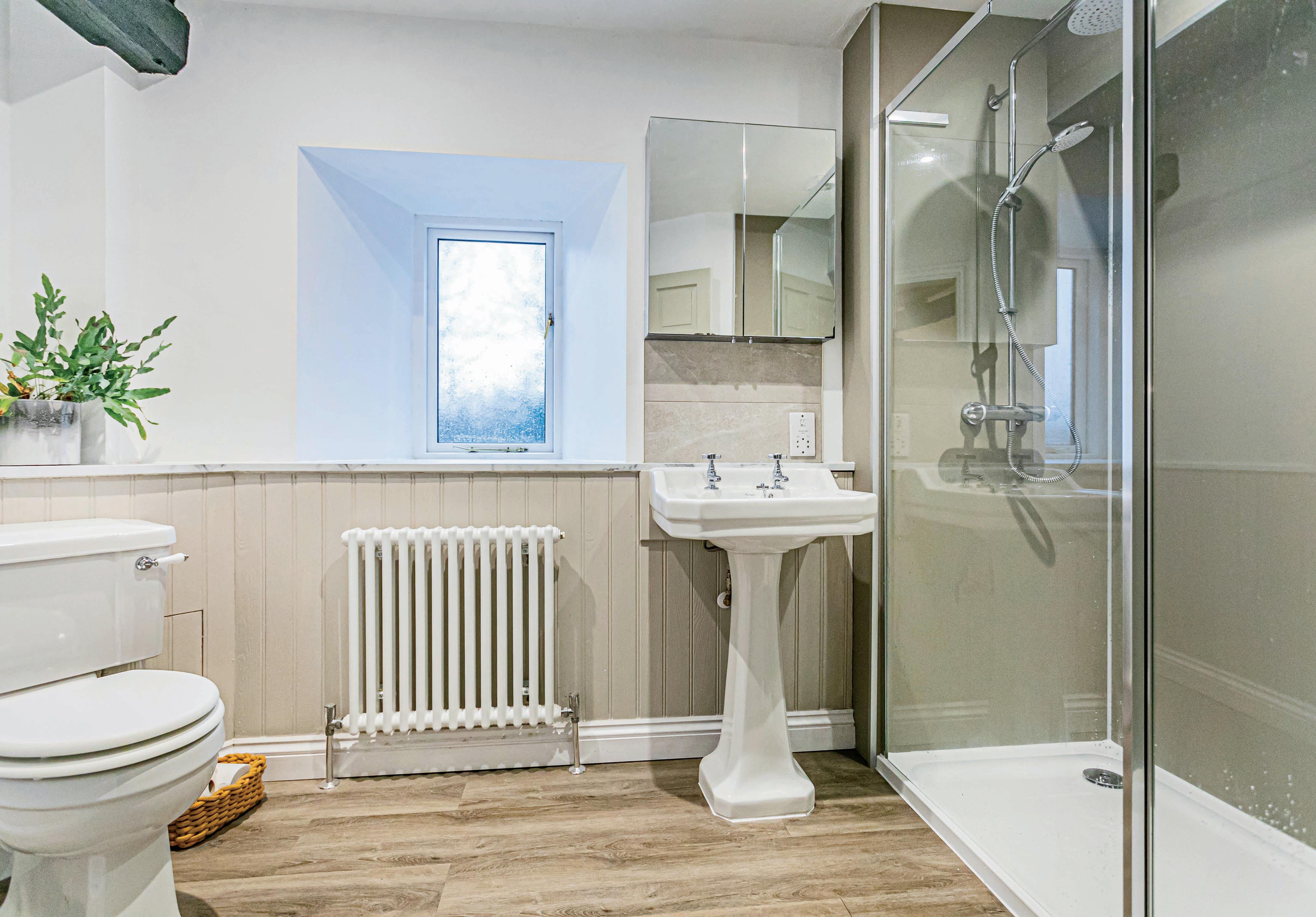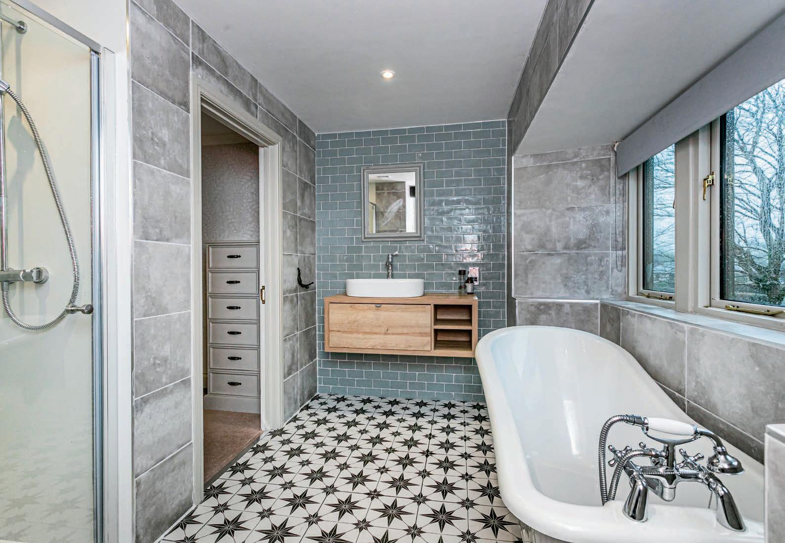 The bedroom accommodation is all on the first floor, off a lovely large landing is a traditional airing cupboard providing super storage. The principle bedroom has westerly views over the back garden to the fields beyond and two built in wardrobes. The ensuite bathroom has been stylishly refitted and has a free-standing slipper bath, separate shower cubicle for when time doesn’t permit a leisurely soak, a contemporary floating vanity unit with oval wash basin and a loo. Looking out to the leafy canopy of the trees in the front garden, it’s an indulgent and relaxing space, perfect for unwinding at the end of the day. There are three further double bedrooms which share the house shower room, again, benefitting from a stylish makeover there is a large shower cubicle, wash basin and loo. All in all, a comfortable and attractive family home.