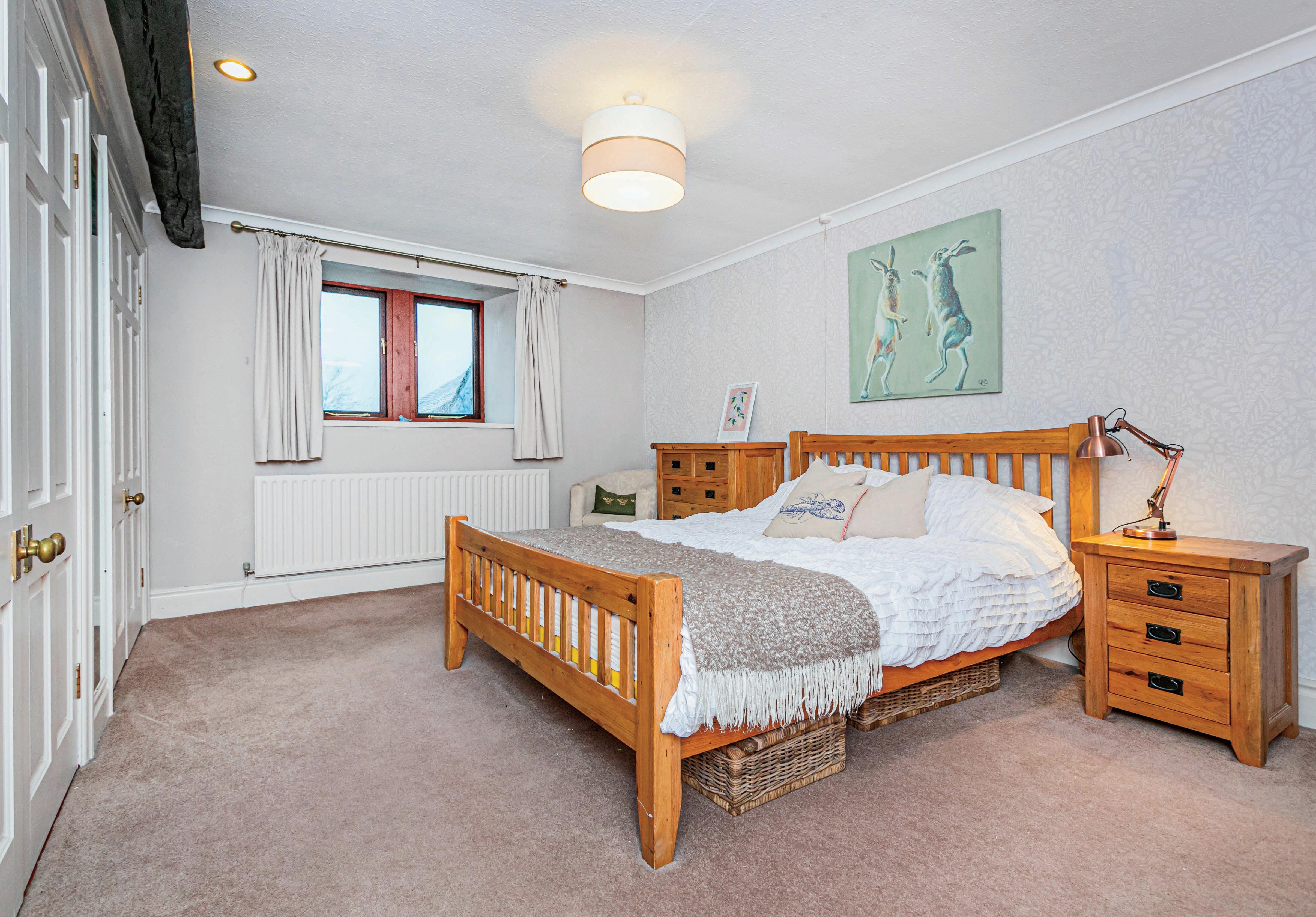 A sociable living kitchen is the sort of room most frequently requested by buyers, what makes this one particularly special is that the seating area is two steps up at a slightly higher level and is partially separated by a balustrade. The arrangement works well for family life and is also super if you are entertaining. The kitchen cabinets have classic cream shaker style doors and extend into a peninsular unit with a breakfast bar perfect for a quick bite to eat or for perching and chatting to the cook. There’s a royal blue Rangemaster cooker and an integral dishwasher. Off the living kitchen is a versatile room, we’ve called it a play or games room but it’s also been a gym; it’s a true ‘any thing’ room. Sliding doors lead out to the rear flagged terrace and there’s a window opposite looking out to the field.