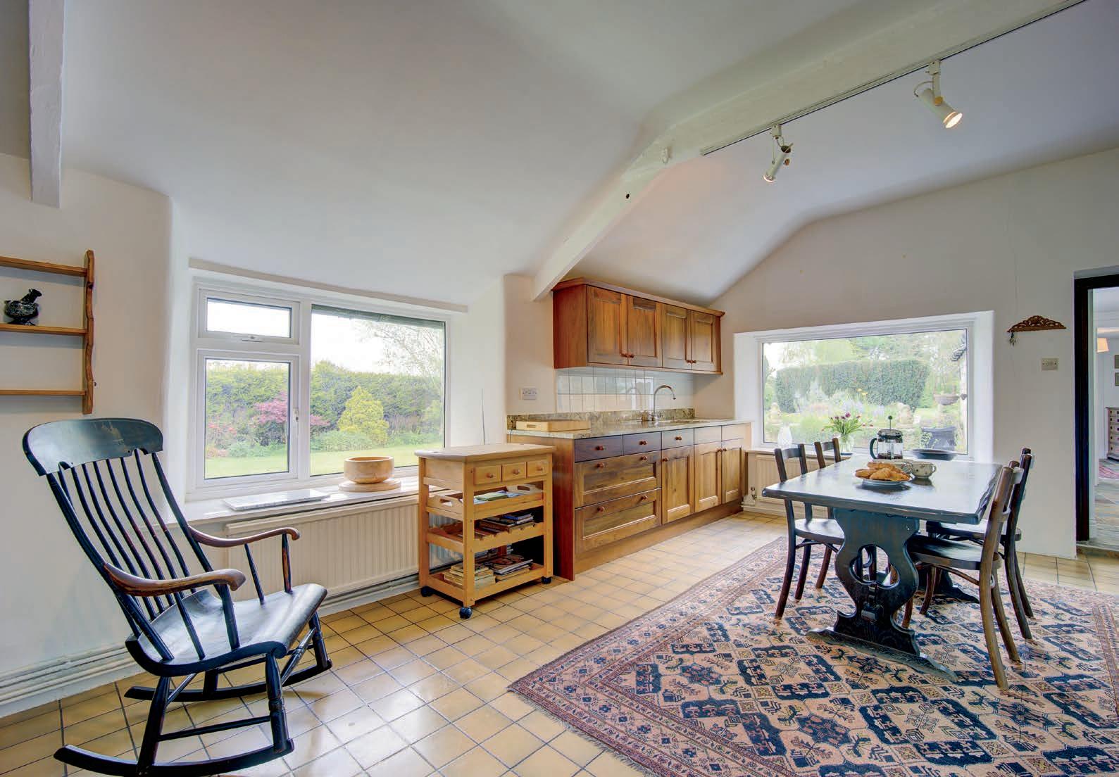 Step through the front door into a welcoming entrance hall with understairs storage and into the elegant sitting room, boasting an open fire, perfect for creating a warm and inviting atmosphere. Across the rear hall, an expansive utility room offers ample storage space and plumbing for laundry facilities with direct access to the gardens. A spacious walk-in pantry featuring floor-to-ceiling shelves is ideal for keeping groceries and kitchen essentials organised and easily accessible. A generously sized downstairs shower room affords convenience and comfort for residents and guests. The well-appointed light-filled kitchen with stunning views out over the gardens, benefits from a good range of wall and floor units and is equipped with an attractive white AGA, complemented by an electric oven and hob.