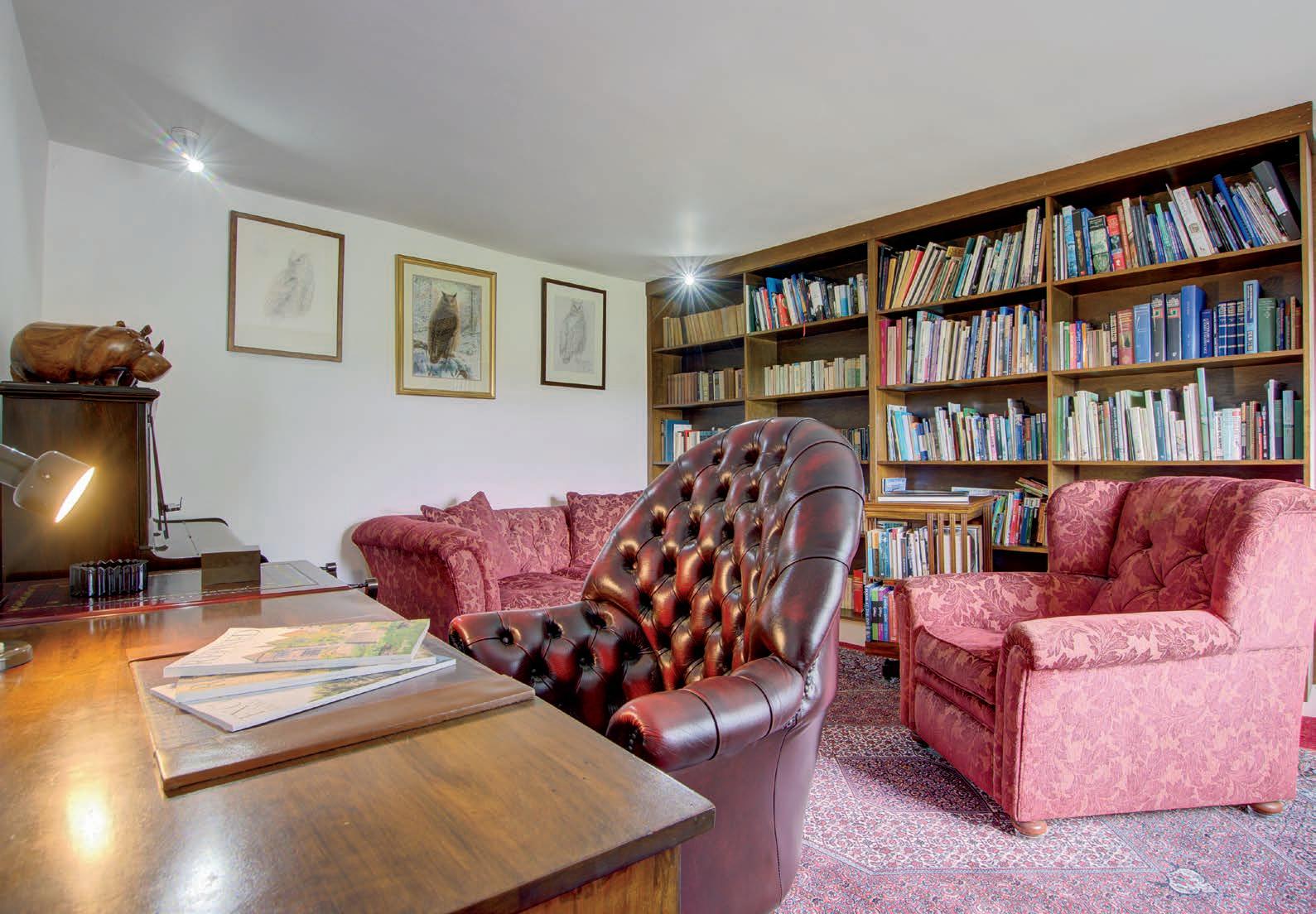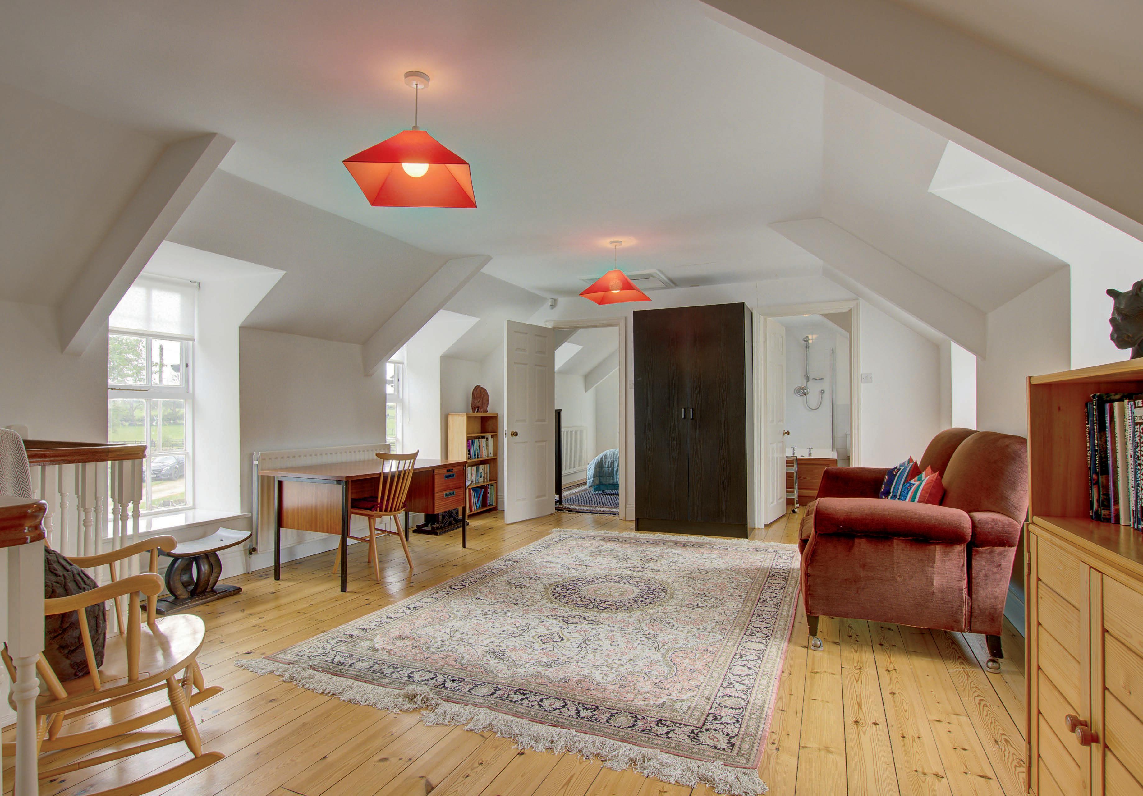 From the kitchen, a charming stone-flagged rear passageway featuring original exposed stone walls leads to a cold store, the rear door into the gardens and on into the beautiful, airy garden room. This is a delightful room with the original byre window arches and offering a tranquil space to relax and enjoy views of the surrounding lush green landscape. A study, which could also be a snug or a family room, provides flexibility to accommodate various lifestyle needs and preferences, and the traditional dining room features an original iron stove, creating a homely ambience for enjoying meals and gatherings with family and friends.