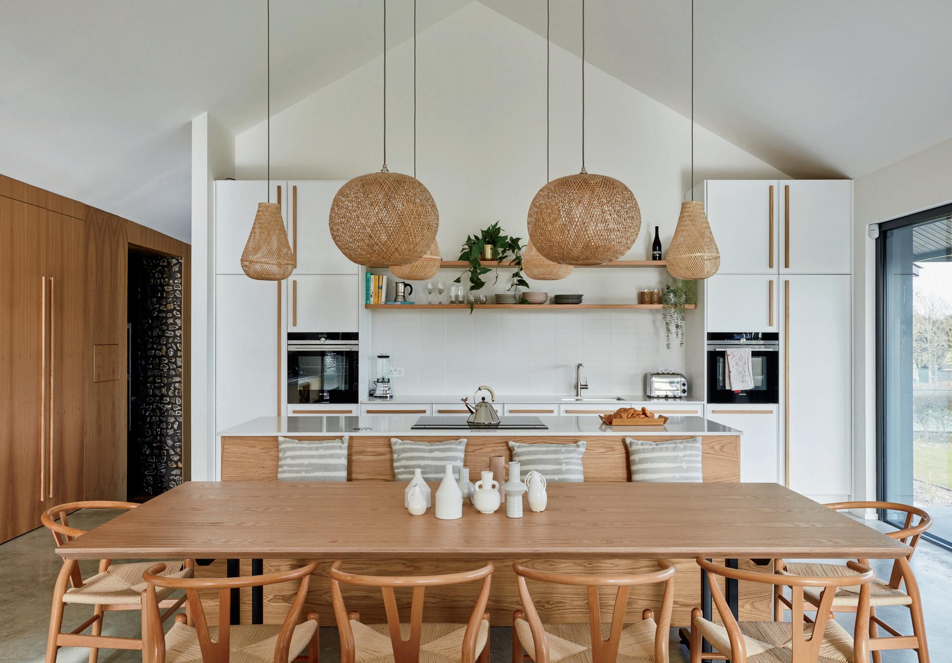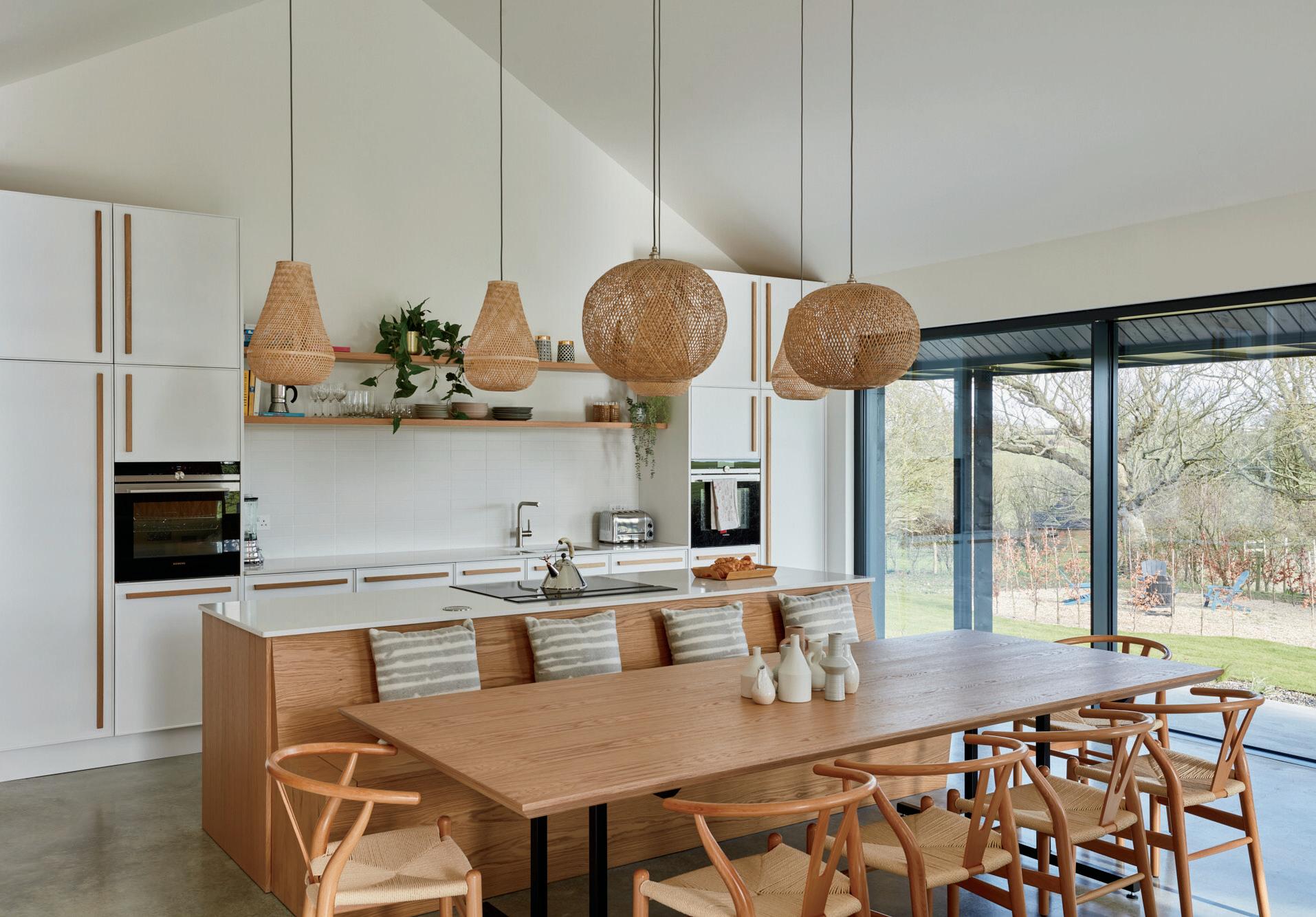 The contemporary kitchen includes a central island with Siemens appliances including an induction hob with a downdraft extractor and bespoke white flat fronted units with Silestone worktops housing two built in ovens, a dishwasher, larder fridge and separate freezer. Backing onto the central island is a hand built four-seater oak dining bench with under seat storage facilities and a dining area where you can easily sit 10 people round a table. The sitting room area provides plenty of opportunity for enjoying the views and has a fascinating textured cork wall feature with an inset television and a delightful raised contemporary Stovax log burner. There is a wide glazed door to the external covered terrace and outdoor kitchen with its Broil King grills and access to the glass lined corridor leading to the dual aspect office pod with views over the newly planted orchard.