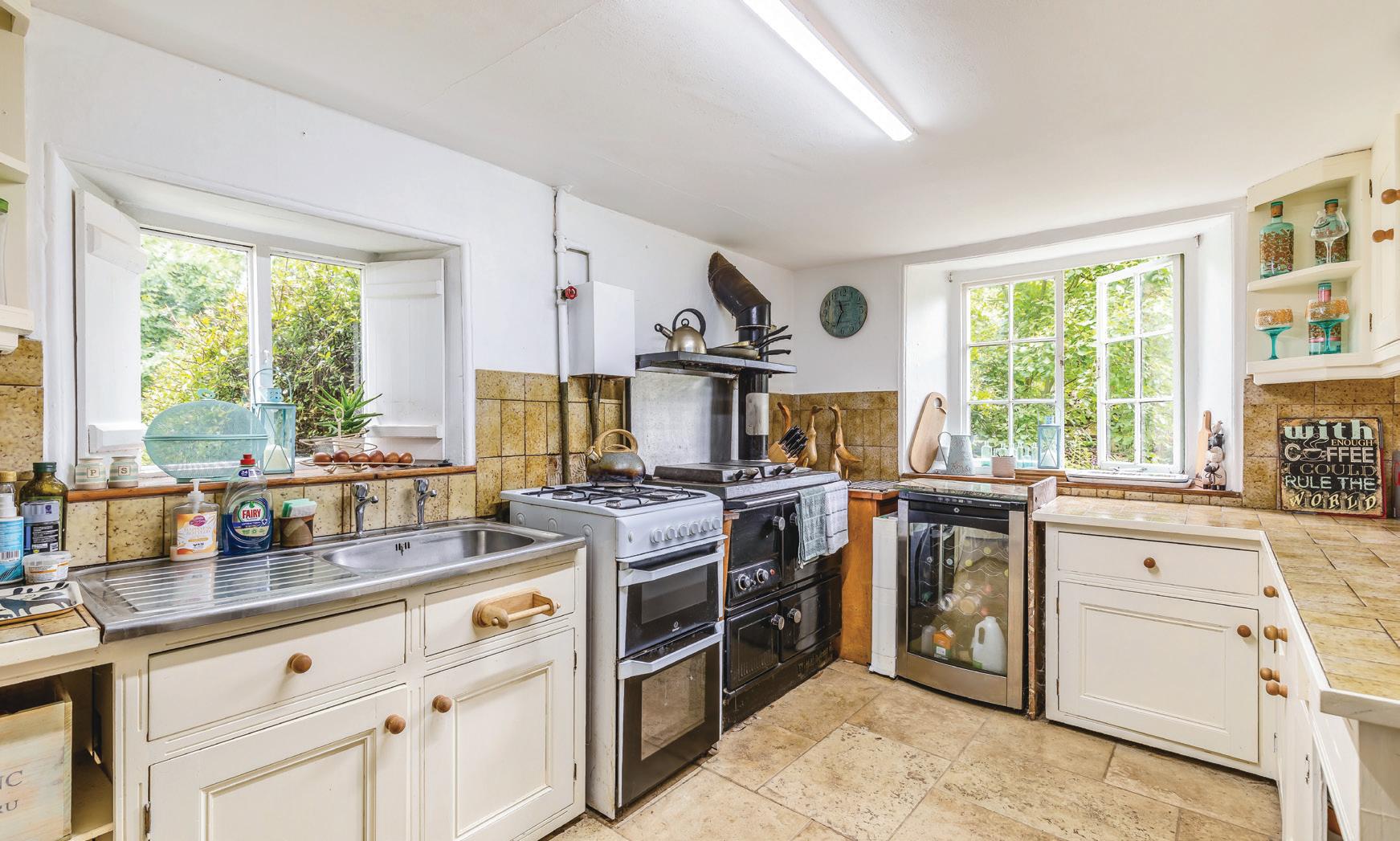 The double aspect kitchen in its current guise is befitting of a period property comprising a range of bespoke painted wall, drawer and floor units on four sides with tiled work tops, an oil-fired Stanley range that also provides hot