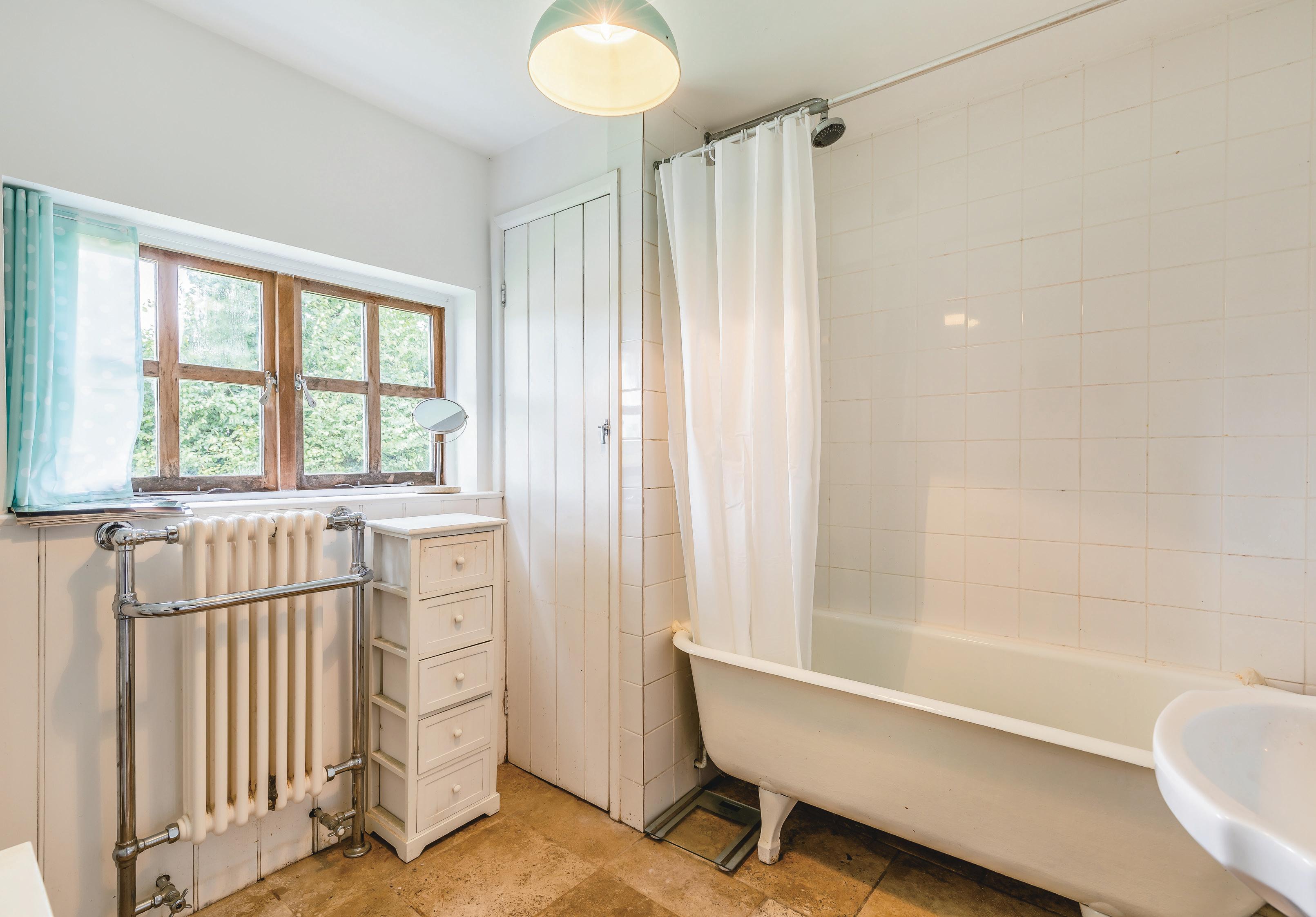 water and powers the heating. Sitting adjacent is space for an LPG slot in gas cooker. Found off the rear hall is the downstairs period styled bathroom with WC and shower over bath and a utility room with space for stacked washing machine and tumble dryer. Heading off the hall with windows overlooking the stable yard is a work room/utility with ample space for both American style fridge freezer and chest freezer. Within this room is some classic plank flooring, stained glass window panel, exposed beams, a settle with storage within and a lovely old door that opens into the boot room which has a flagstone floor and ample room for outdoor clothing and boots.