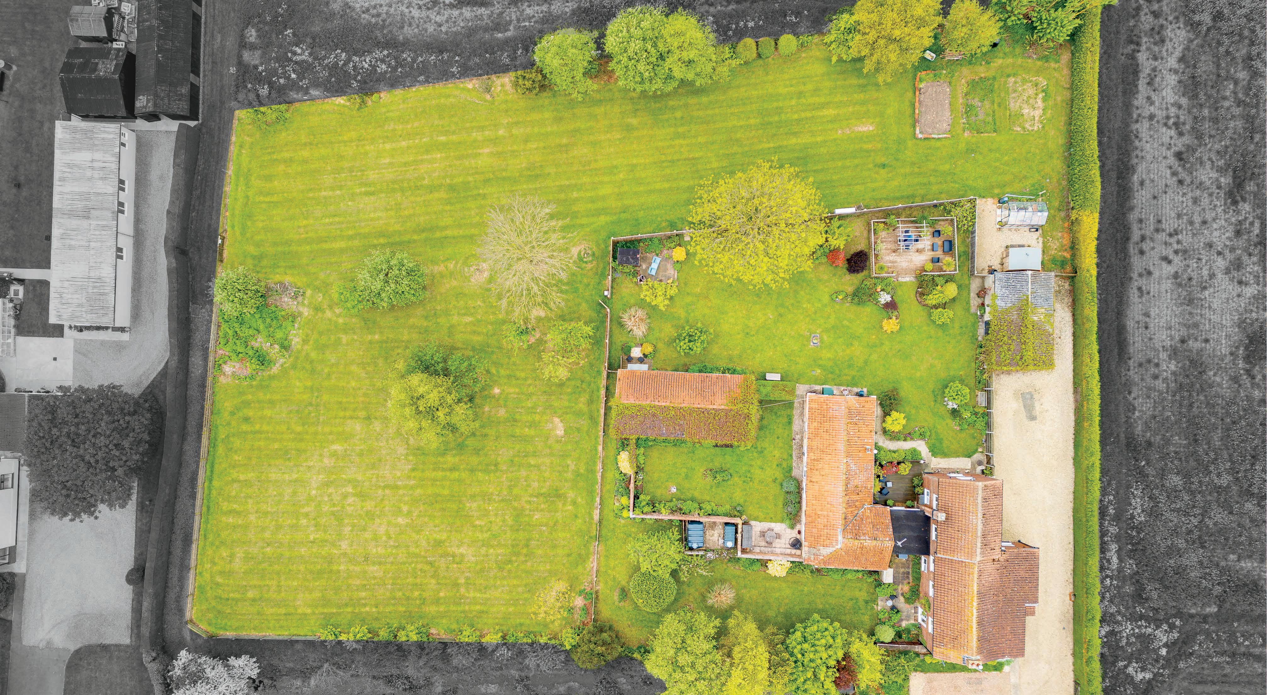 • Almost an acre, L-shaped, fenced paddock with trees and hedging