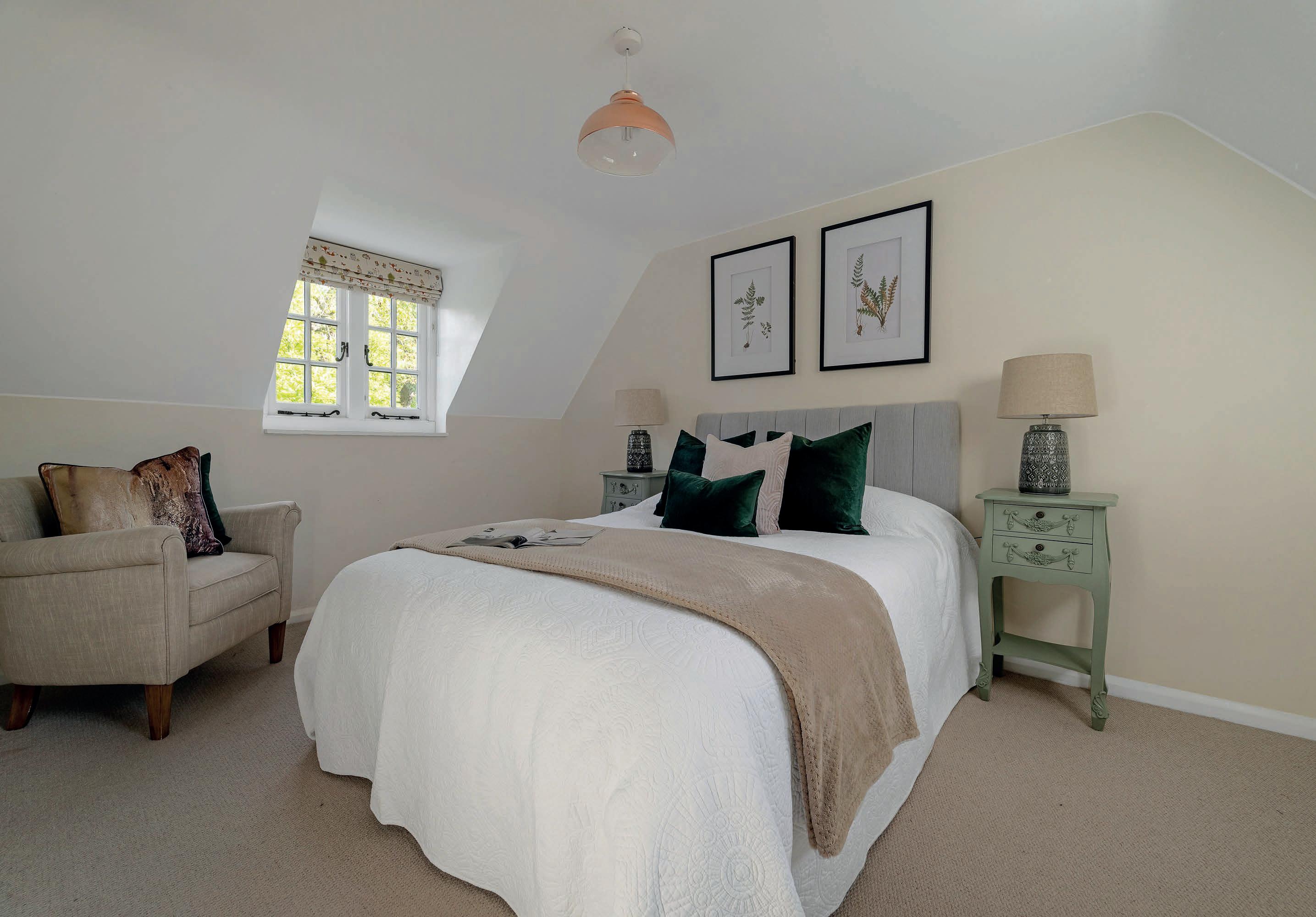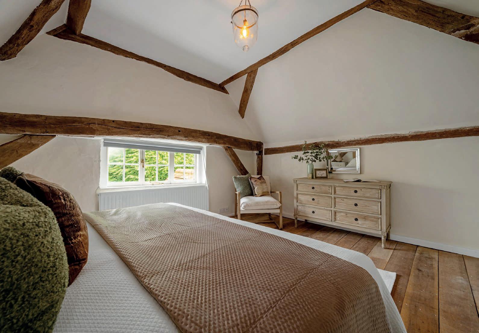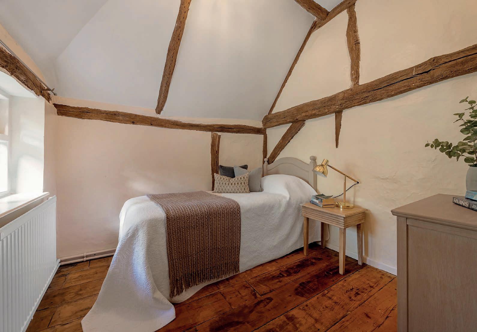 The ongoing theme of exposed timber wood beams, sloping ceilings, and cottage-pane windows continues throughout the first floor, and the second and third bedrooms also have double aspects. Both bedrooms are conveniently located up the staircase off the small hallway behind the formal
