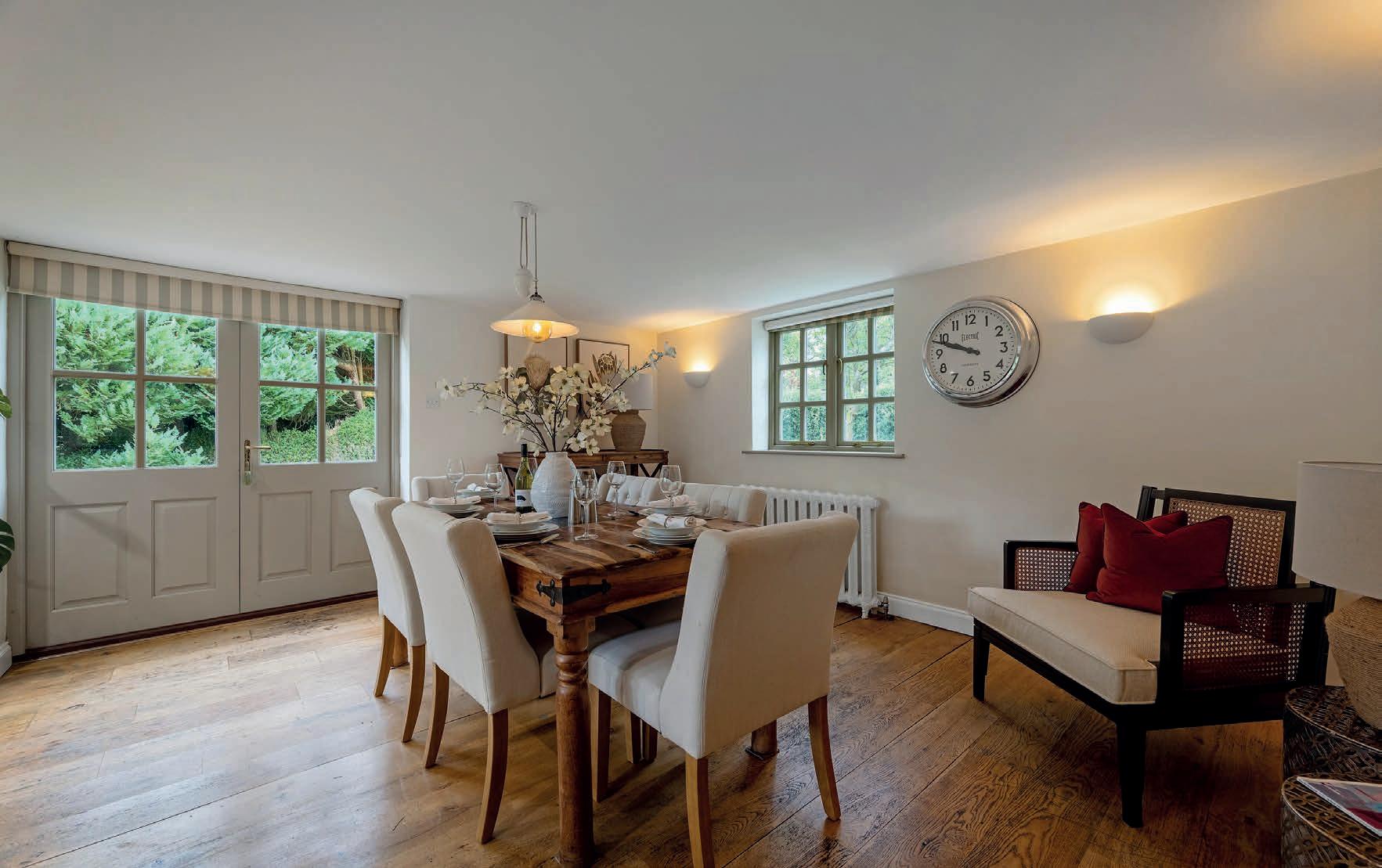 Returning to the formal lounge, a reclaimed wood sliding barn door, handmade by a master carpenter, invites you into the family room of what was originally Yew Tree Cottage. One of the oldest parts of the home, dating from circa 1720, this room features historic oak timber joists supporting the roof, limestone floors, and a second inglenook fireplace, further enhancing its cosy atmosphere. Discreetly tucked behind the inglenook is a cleverly hidden storage room, added in Victorian times. Off the right of the family room is a small portico and a second entrance to the home, which can provide privacy when you host overnight guests. To the left of the family room, an open archway leads upstairs to the third bathroom and the fourth and fifth bedrooms. Limestone floors continue to flow through the second doorway on the far left, which opens into a breathtaking dining and reflection area, highlighted by an original exposed brick and flint feature wall, with French doors opening onto the rear garden. Off to the left is an enchanting kitchen with hand-painted Farrow & Ball units, complete with handmade shelves crafted in the 1940s by a former owner who was a skilled carpenter.